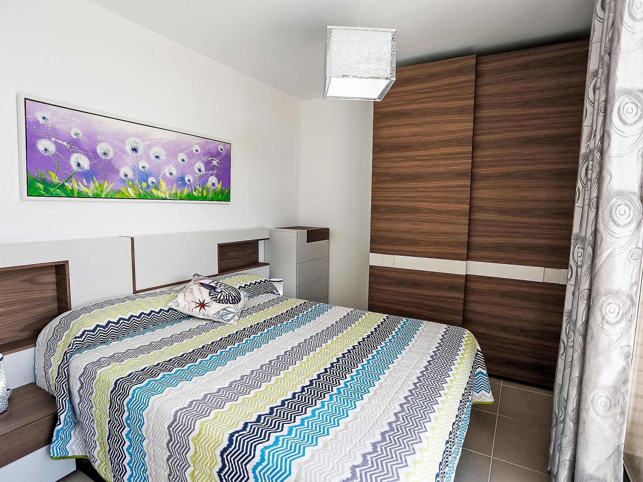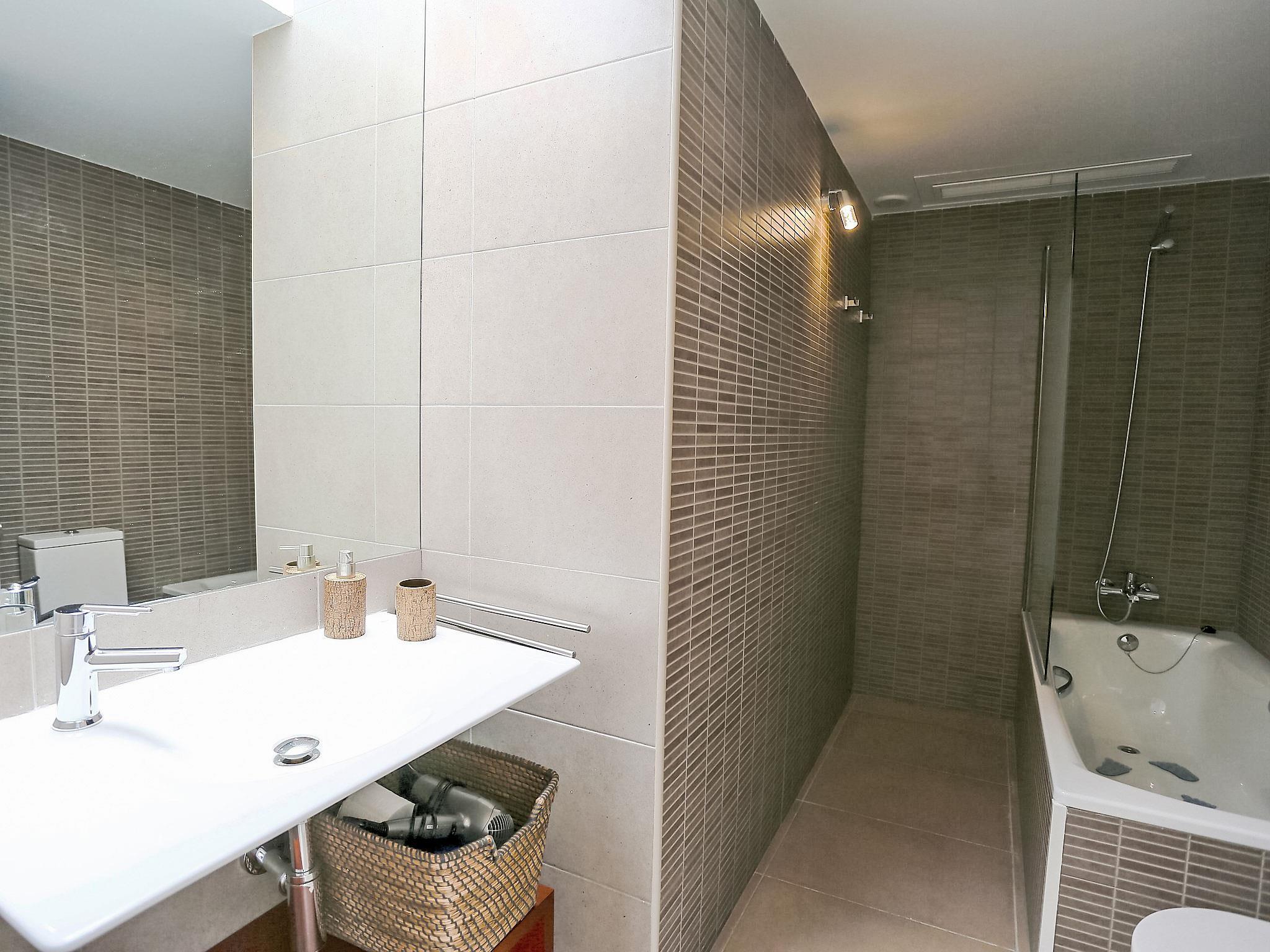"Xaloc", 4-room terraced house 115 m2 on 2 levels. Spacious and bright, comfortable and modern furnishings: living/dining room with dining table, bar, bath/shower/WC, satellite TV, international TV channels, flat screen, DVD, electric heater and air conditioning. Exit to the patio. Large, open kitchen (oven, dishwasher, 4 ceramic glass hob hotplates, microwave, freezer, electric coffee machine). Upper floor: 1 double bedroom with 1 french bed (1 x 190 cm, length 150 cm). 1 double bedroom with 1 french bed (1 x 190 cm, length 150 cm). 1 room with 2 beds (190 cm, length 90 cm). Bath or shower/WC. Large balcony. Balcony furniture, barbecue. Beautiful view. Facilities: hair dryer. Internet (WiFi, free). Parking (2 cars). Suitable for families. Maximum 2 pets/ dogs allowed. HUTTE003219