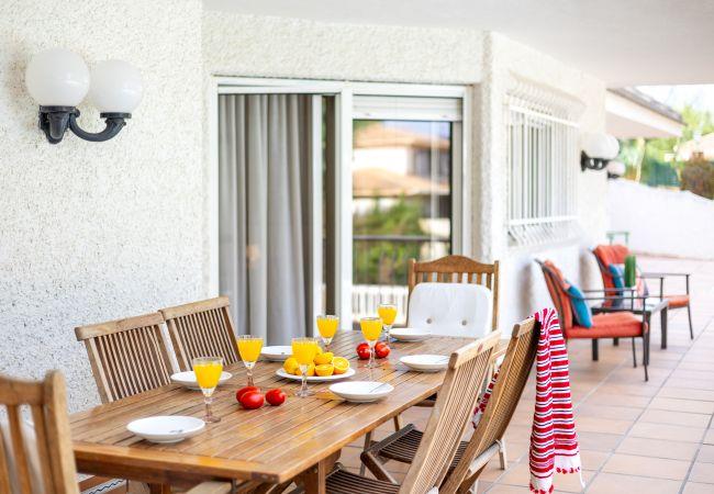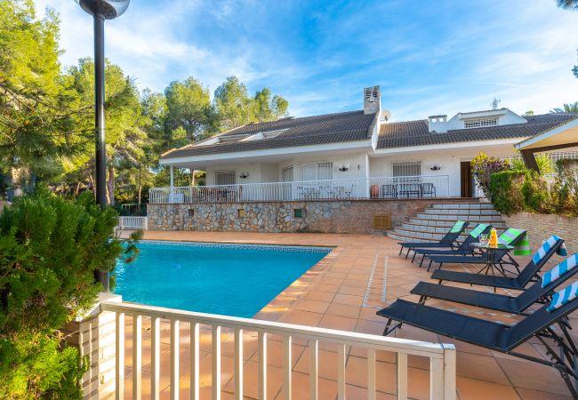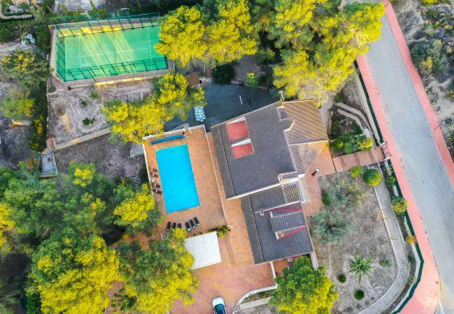 This impressive and spacious two-story villa is tastefully furnished and fully equipped. Once inside you will be greeted by 9 amazing bedrooms, 5 full baths, large modern separate kitchen, accompanied by expansive living spaces. The beautiful fireplace is a great place to gather in the evening and make new memories. The villa is close to beautiful nature and a lake, making it the perfect place to spend time in nature, but also close to shops and restaurants. It also has a garden, and a fenced plot. There are several outdoor amenities to keep the little ones entertained, such as a table tennis court and children's area, paddle tennis court. The villa has capacity for 19 people with a garage space and capacity for 10 cars, which makes Paradise Pines the perfect place to enjoy a vacation with family and friends. It is an amazing place to spend your vacation!