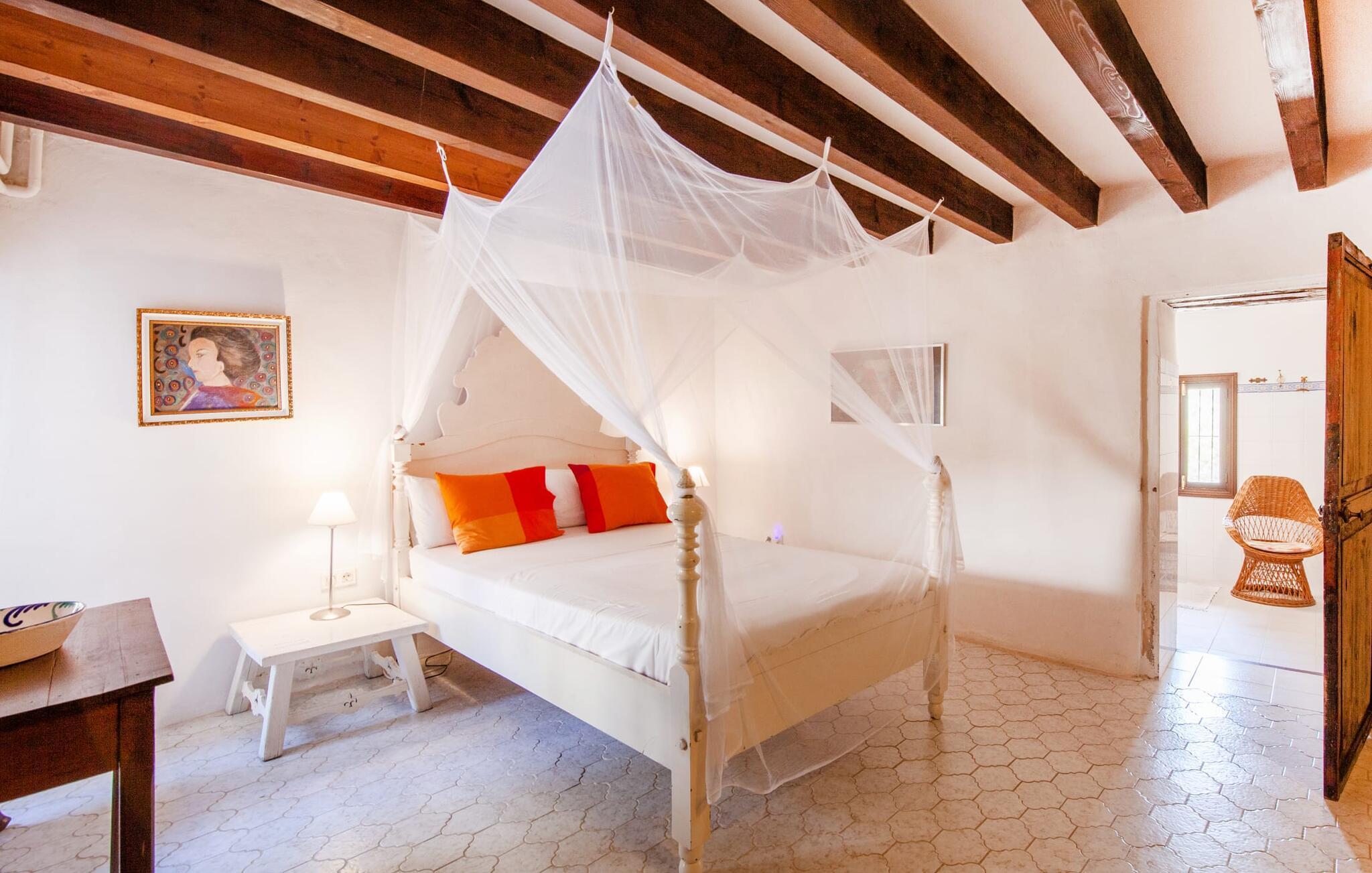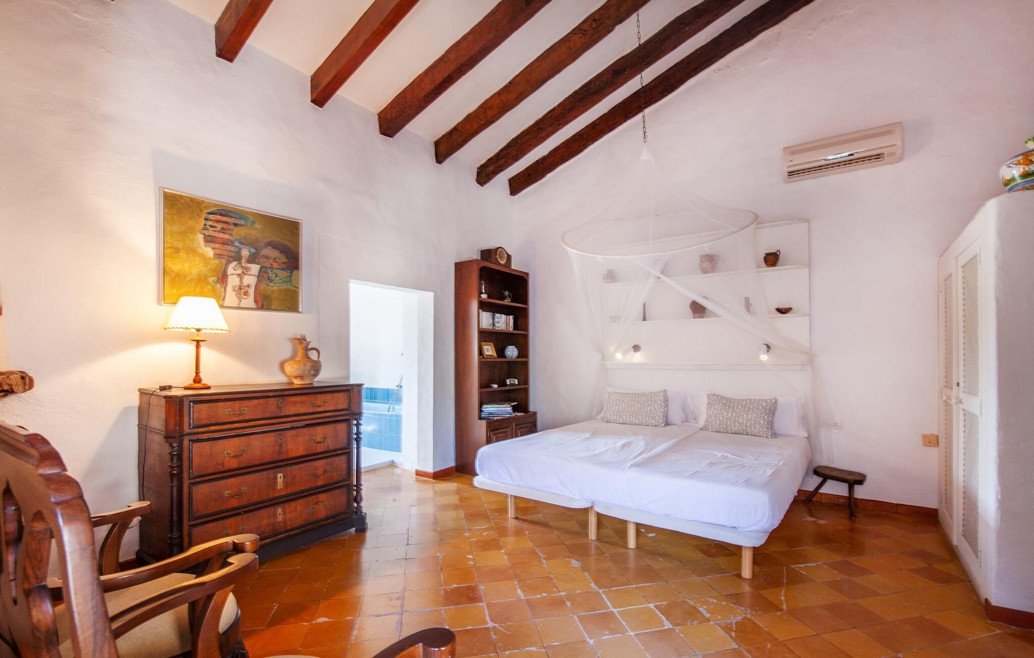 Ganze 500 m² Wohlfühlfläche stehen Urlaubern hier zur Verfügung. Diese Finca auf Mallorca punktet innen mit traditionellem mallorquinischem Charme und einem originellen Mix aus alten und neuen Stilen. Da ist das riesige Wohnzimmer mit Kamin und Sofaecke, das mit ausreichend Sitzgelegenheiten für alle ausgestattet ist. Direkt daneben befindet sich die Küche mit rustikalem Esstisch und dezenten Farbakzenten. Vom Pferdestall bis zur Wohnung: Dieses Haus hält immer Überraschungen bereit und ist für größere Familien einfach praktisch. Es gibt fünf Badezimmer (vier en suite), eine Waschküche und ein weiteres kleines Wohnzimmer mit TV. Darüber hinaus verfügt „La Alqueria Herbst“ über vier Doppel- und zwei Einzelzimmer – drei davon sind von außen zugänglich, sodass hier neben viel Geselligkeit auch maximale Privatsphäre möglich ist.
