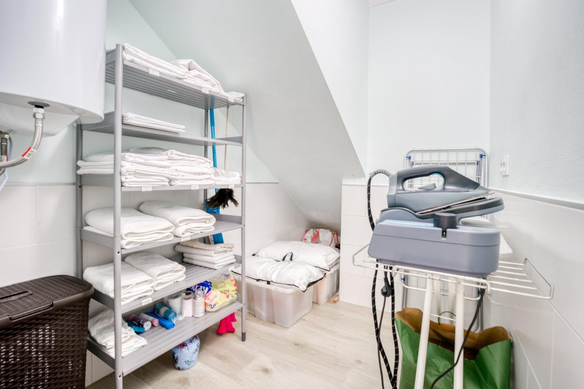Ground floor: (Entrance, Kitchen(dining table, cooker, coffee machine, combination microwave, washing machine), Living/diningroom(dining table), Bedroom with bathroom(double bed, TV, bathtub or shower, toilet), Bedroom with bathroom(double bed, TV, bathtub or shower, toilet), Bedroom with bathroom(single bed, single bed, TV, bathtub or shower, toilet), bathroom(toilet), ironing board, iron, hairdryer) patio, roof terrace