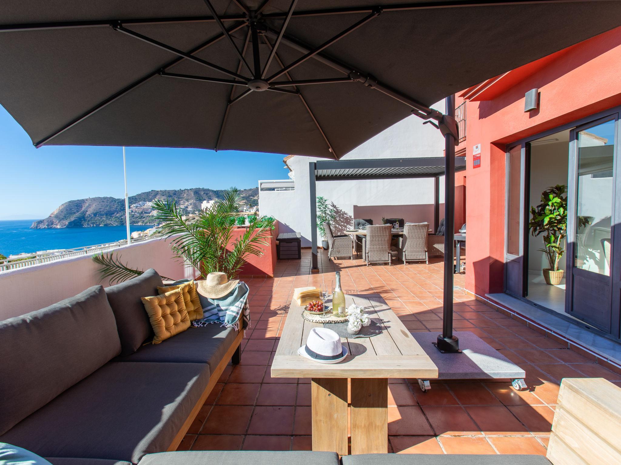 La Herradura: Modern, beautiful, comfortable semi-detached house "Bahia", 3 storeys. In a quiet, sunny position residential area (villas), 700 m from the sea, 700 m from the beach, south facing position. For shared use: lawn for sunbathing, swimming pool angular (16 x 7 m, depth 100 - 175 cm, seasonal availability: 01.Jan. - 31.Dec.). WC in the pool area, outdoor shower, parking space n 3. Shop 700 m, supermarket, restaurant, bar, bakery, café, bus stop 2 km, railway station 60 km, diving center 2 km. Sports harbour 2 km, marina 2 km, golf course (18 hole) 13 km, surf school 55 km, sailing school 2 km. Nearby attractions: Almuñecar, Salobreña, Las Alpujarras, Valle de Lecrin, Nerja, Frigiliana. Well-known ski regions can easily be reached: Sierra Nevada. Hiking paths: Sierra Tejeda, Sierra Almijara. Please note: no lift. The owner does not accept any youth groups. Loading and unloading of baggage is possible at the holiday house. Property ref. ES5400.601.1 is situated on the same property. This beautiful house gets the sun all day and has beautiful views to the bay of la Herradura from every bedroom. Community pool is 30 meters away from property.