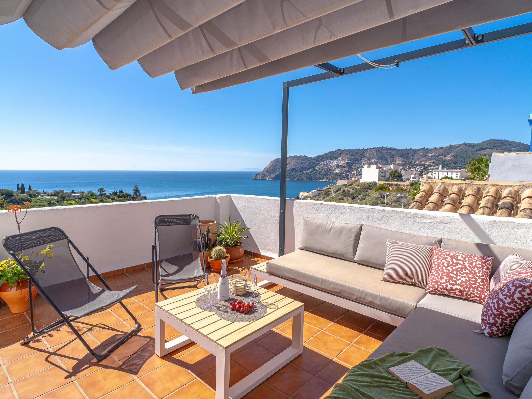 Herradura: Large, beautiful, comfortable terraced house "Melon". In a quiet position in the residential district, residential area (villas), 700 m from the sea, 700 m from the beach, south facing position. For shared use: swimming pool angular (16 x 7 m, depth 100 - 170 cm, seasonal availability: 01.Jan. - 31.Dec. pool opening hours: 10:00-21:00). Shower/WC in the pool area. In the house: WiFi, washing machine. Roofed, parking space n 6. Shop, grocery 700 m, shopping centre 25 km, bakery, pedestrian zone 700 m, bus stop 850 m, railway station "Malaga" 72 km, ferry "Motril", diving center 1 km. Sports harbour 2 km, marina 2 km, golf course (18 hole) 10 km, surf school 700 m. Nearby attractions: Almuñecar, Nerja, Frigiliana, Granada, Malaga, Alpujarras. Well-known ski regions can easily be reached: Sierra Nevada. Hiking paths: Sierra Almijara, Serra Tejeda. Please note: car recommended. The owner does not accept any youth groups. Loading and unloading of baggage is possible at the holiday house.