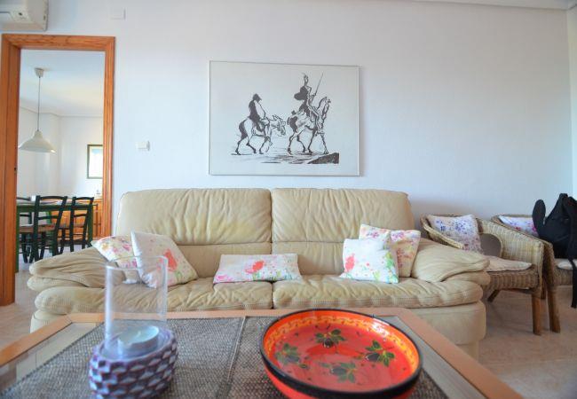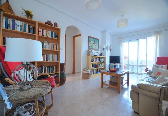 The living room is fully furnished for a comfortable stay: armchairs, sofa, tables, shelves with books.