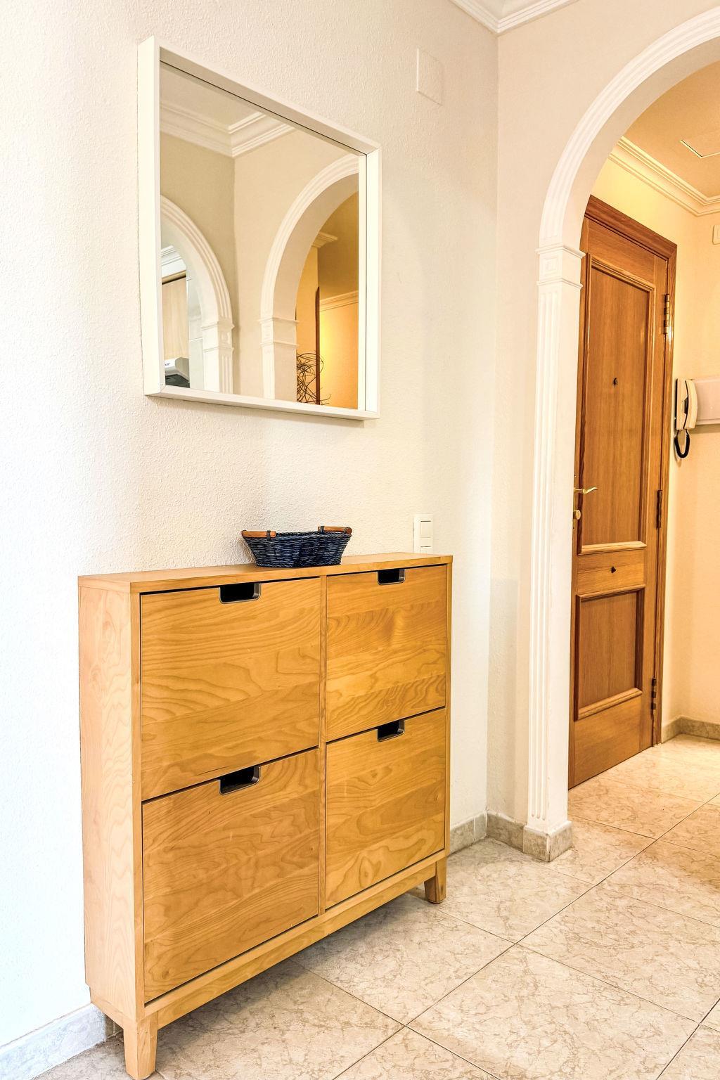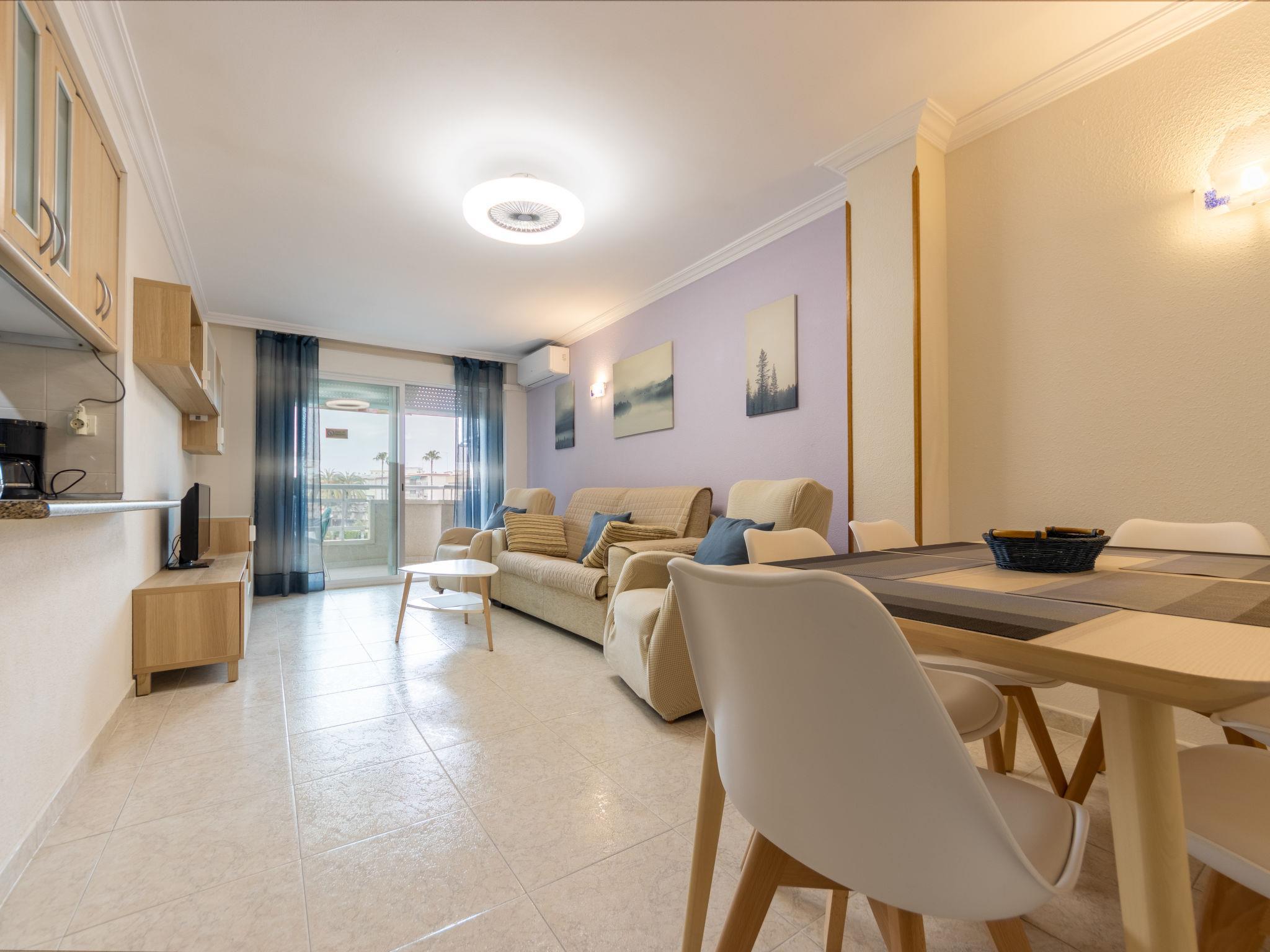 "Aguamarina 7", 3-room apartment 68 m2 on 3rd floor. Simple and practical furnishings: living/dining room with 1 sofabed (135 cm, length 190 cm), digital TV and air conditioning. Exit to the terrace. 1 room with 1 french bed (140 cm, length 200 cm). 1 room with 2 beds (90 cm, length 190 cm). Open kitchen (oven, dishwasher, 1 ceramic glass hob hotplate, 4 gas rings, toaster, kettle, microwave, electric coffee machine). Shower/WC. Heating not available in all rooms. Terrace. Terrace furniture. View of the swimming pool and the garden. Facilities: washing machine, iron, baby cot, hair dryer. Internet (WiFi, free). Parking space n 59 por Pep Ventura (roofed). Please note: non-smoking house. HUTT-062773 // Reg. Nr.: ESFCTU00004302400060773600000000000000000HUTT-0627739