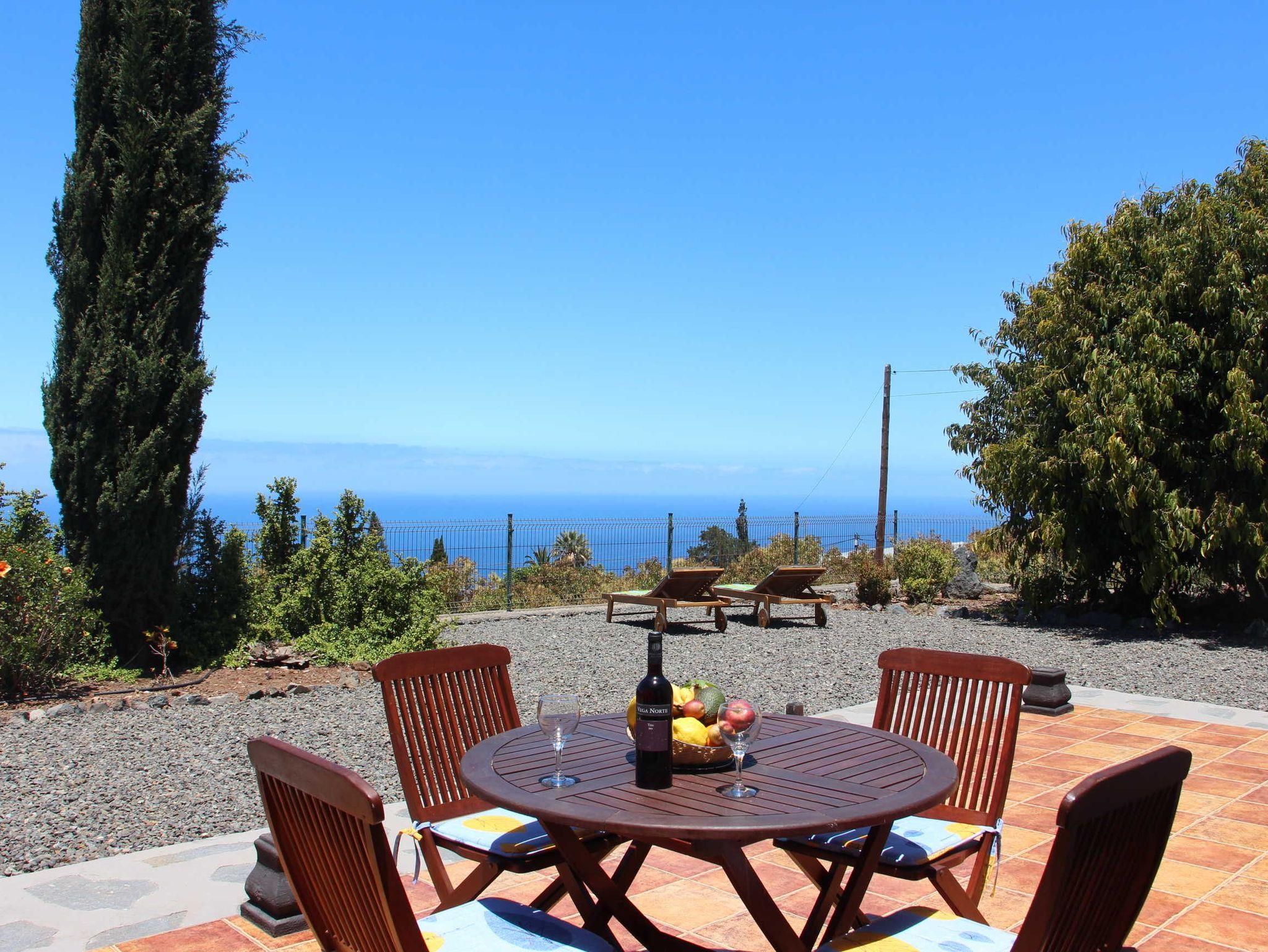 Der Garten rund um die Terrasse, die zur Meerseite liegt, wurde mit hohen Sträuchern bepflanzt, um eine angemessene Privatsphäre für die Gäste zu schaffen. Die Terrasse ist mit einem Tisch und 4 Stühlen ausgestattet. Sonnenliegen und ein Sonnenschirm sorgen für eine perfekte Ruheoase und je nach Tageszeit hat man immer Sonnen- und Schattenplätze. Im Rücken des Hauses ragt der wunderschöne Bergrücken der Caldera hervor und nach vorne hat man einen sehr schönen, freien Blick auf den Atlantik.