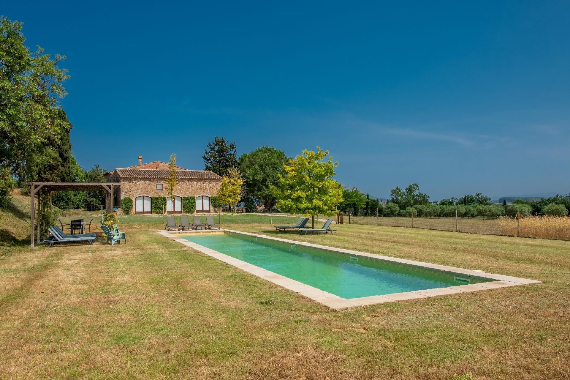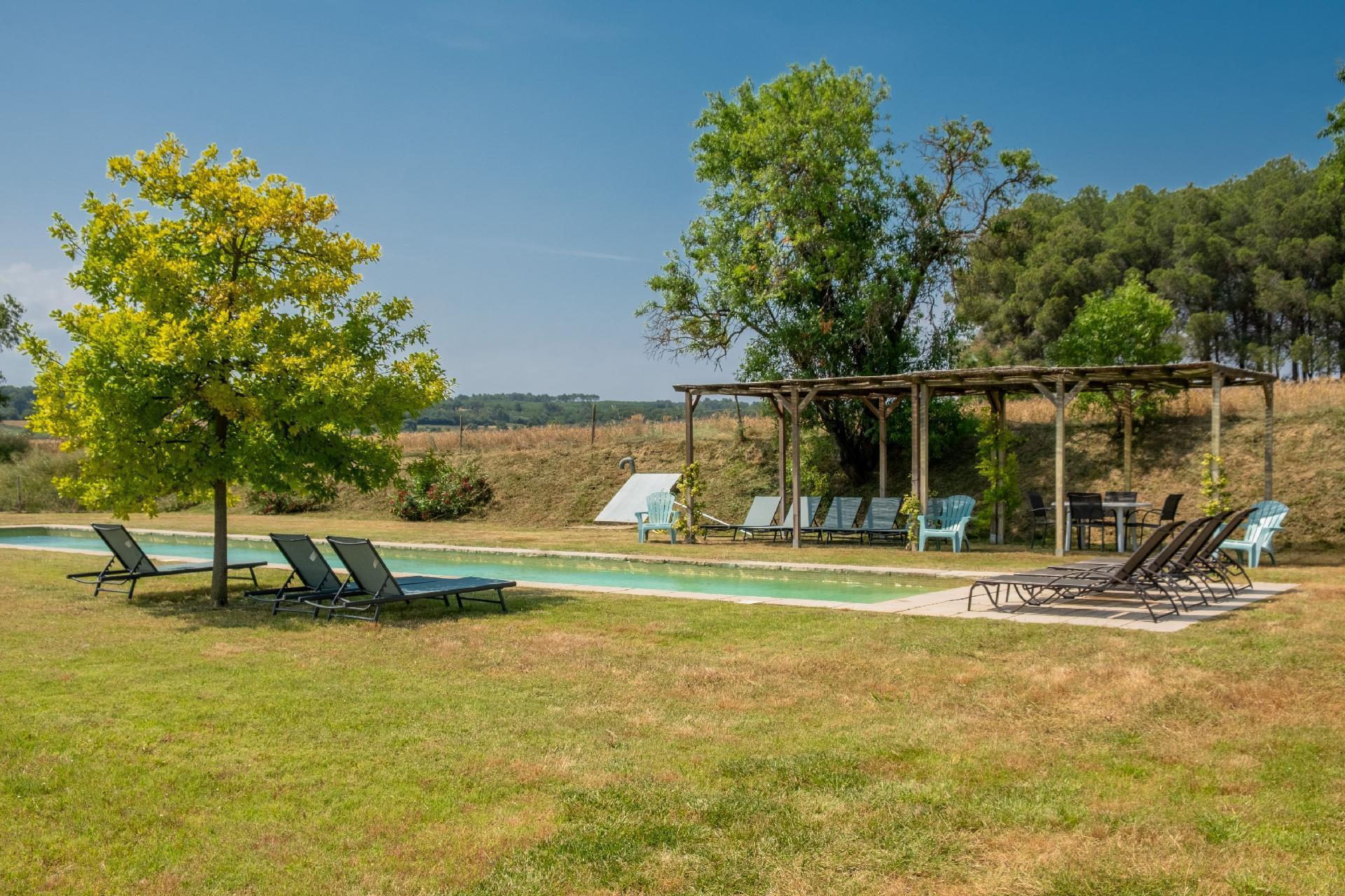 The swimming pool is set in a large fenced area with a beautiful lawn garden, sun loungers and a pergola-covered lounge.