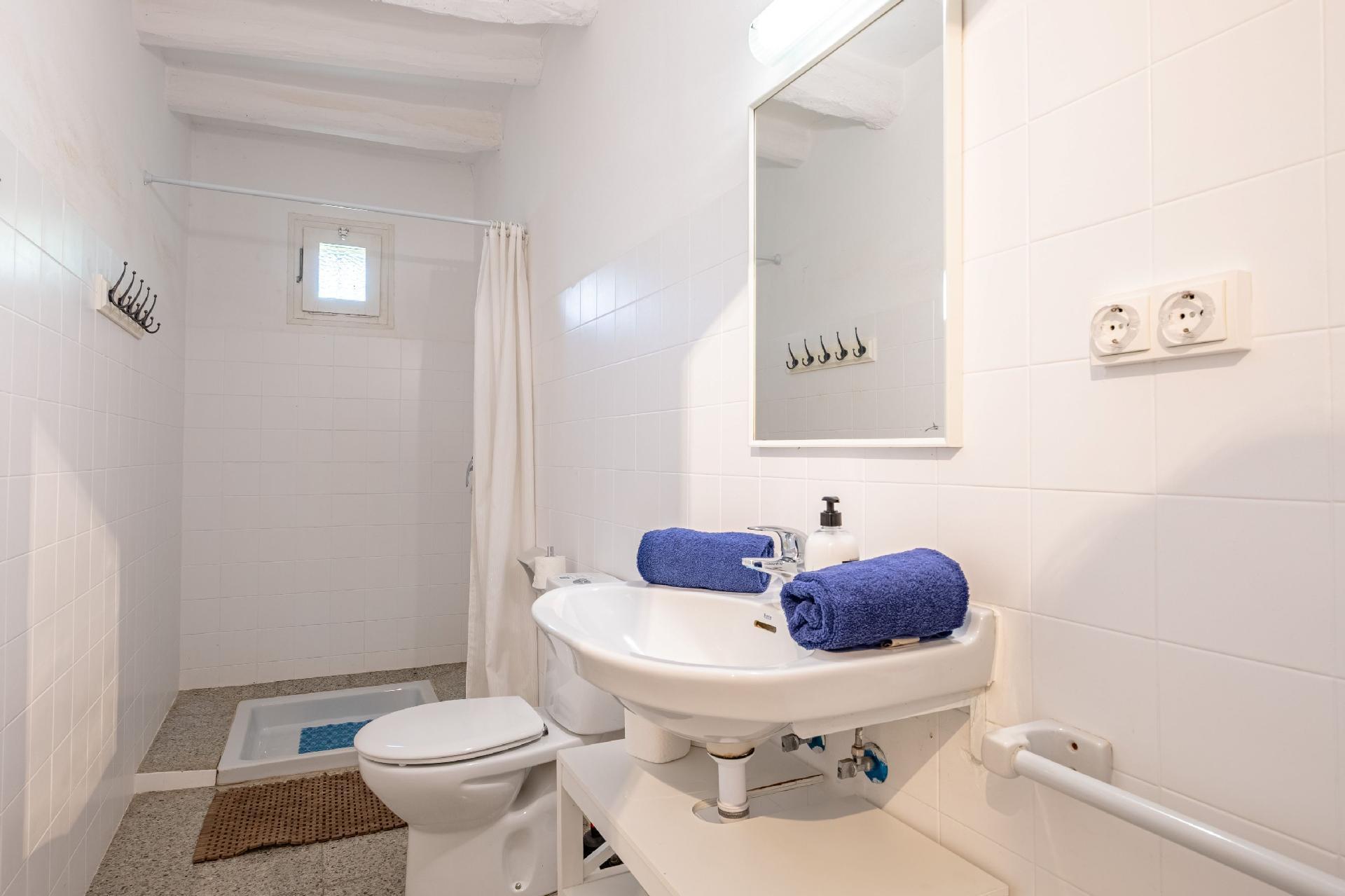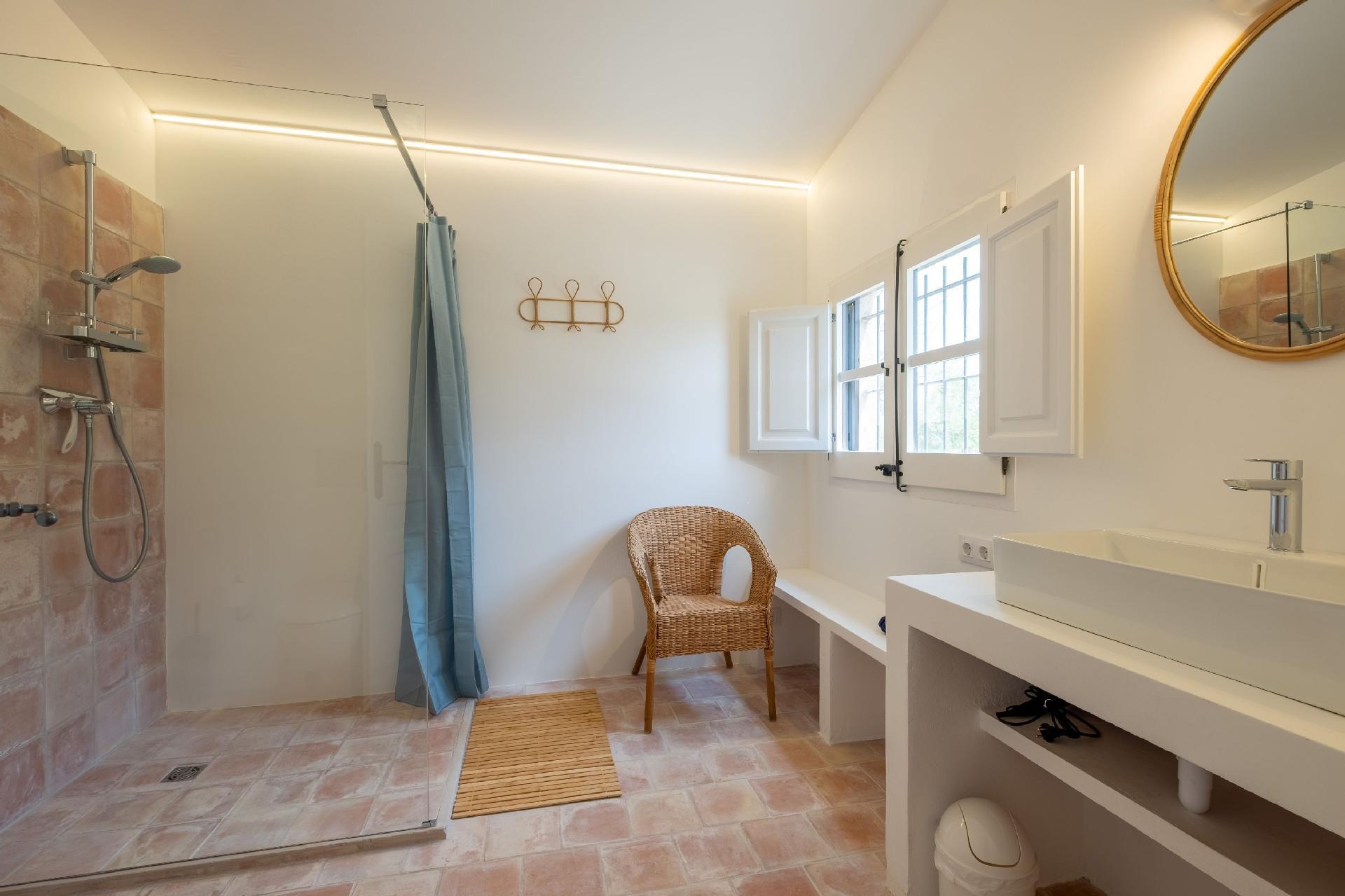 A staircase leads to the upper floor where a hall of 35 m2 leads to three suites (with bathroom and toilet, 2 of them with double bed and the other with two single beds), a double bedroom with 2 single beds, a bedroom for 4 people with 4 single beds, a bathroom with bath and toilet, a separate toilet and a bathroom with shower.