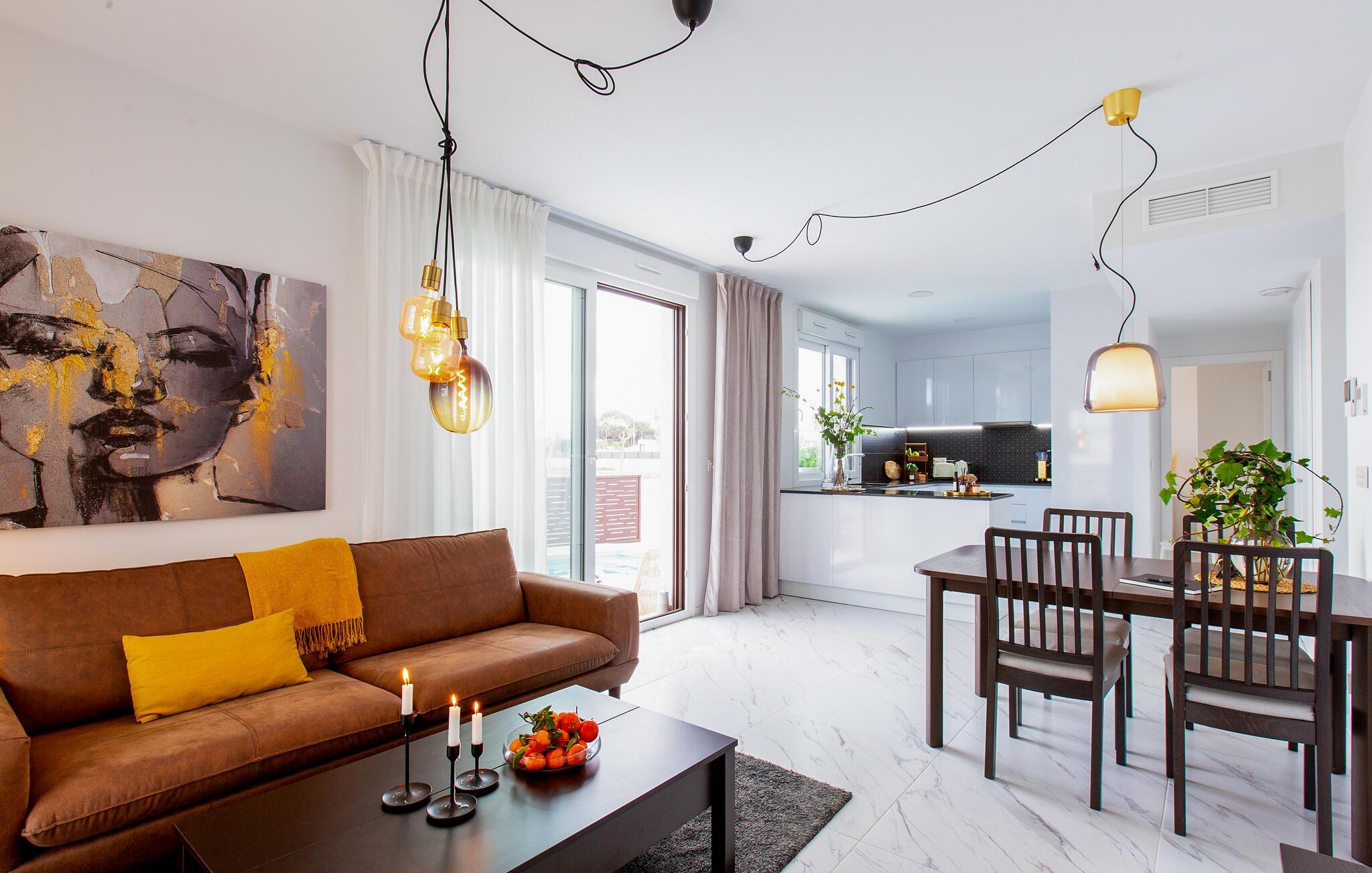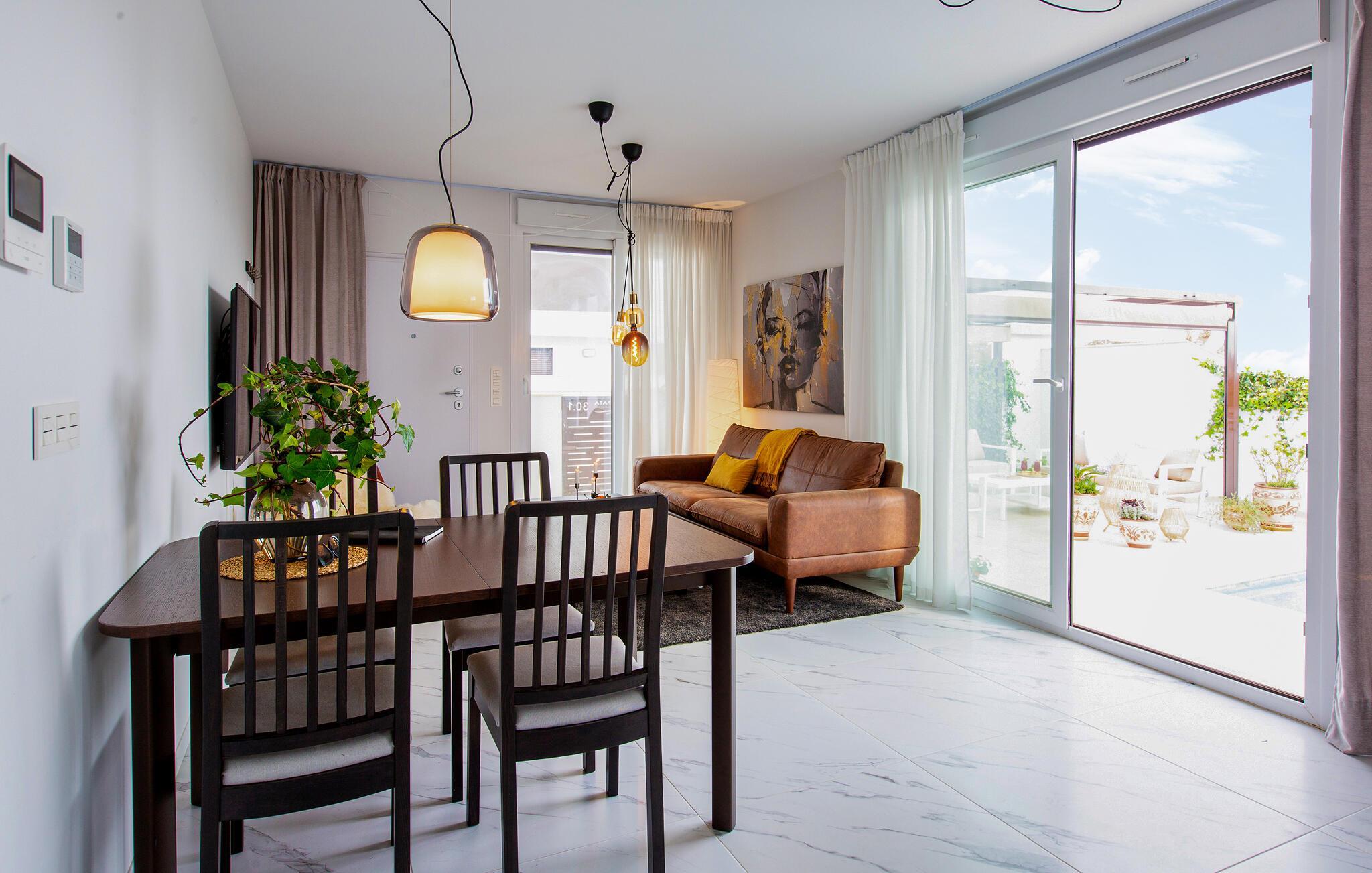 Der offen gestaltete Wohn- und Essbereich ist geschmackvoll eingerichtet und lädt zum Verweilen ein. Kochen Sie nach Lust und Laune in der modernen Küche und genießen Sie Ihre Mahlzeiten gemeinsam am schönen Esstisch. Danach bietet das gemütliche Sofa den idealen Ort zum Ausruhen, Lesen oder für einen Filmabend.