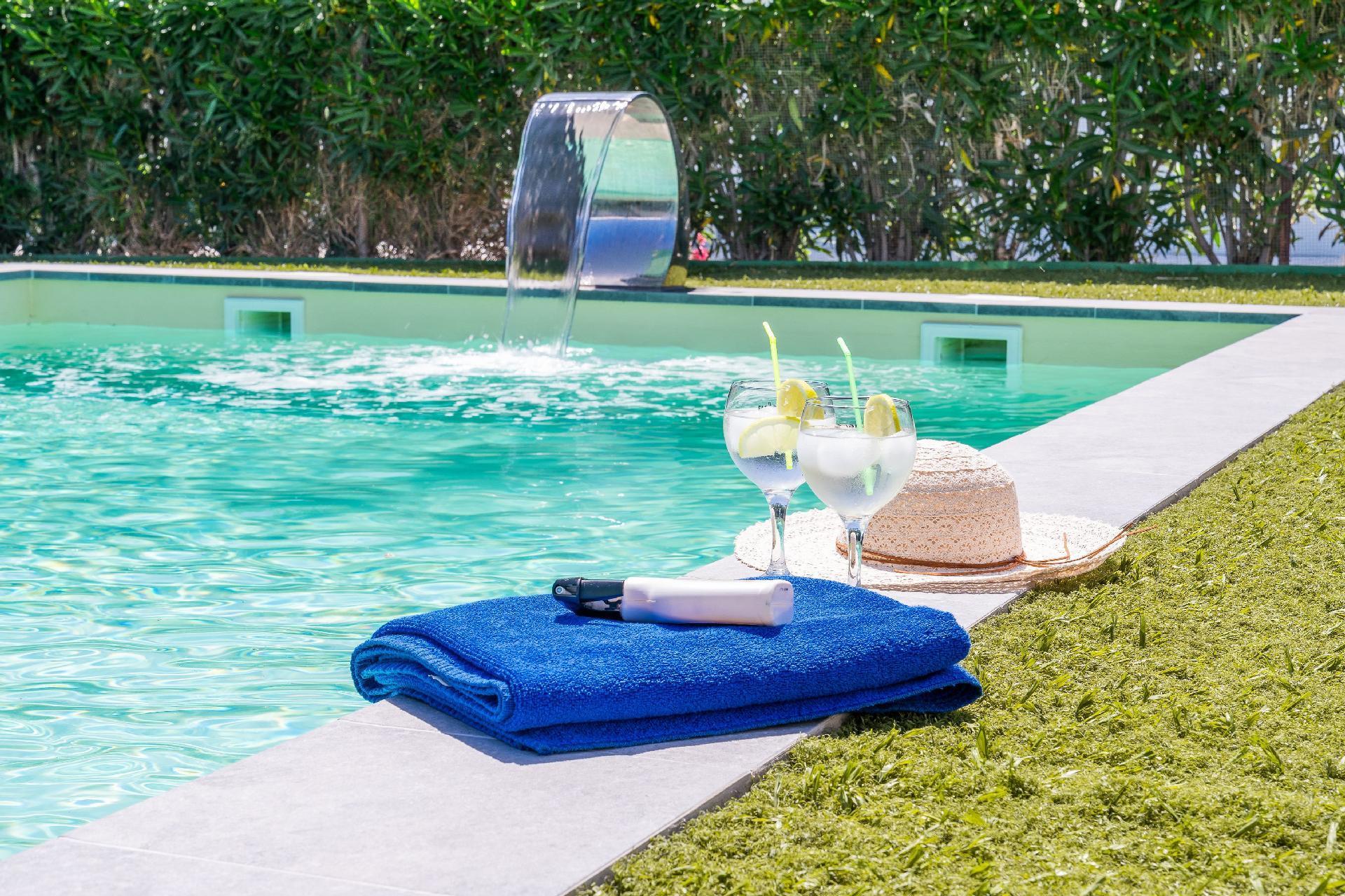 Large salt water pool with waterfall fountain of 8.5 x 4.255 meters and 1.55 deep.