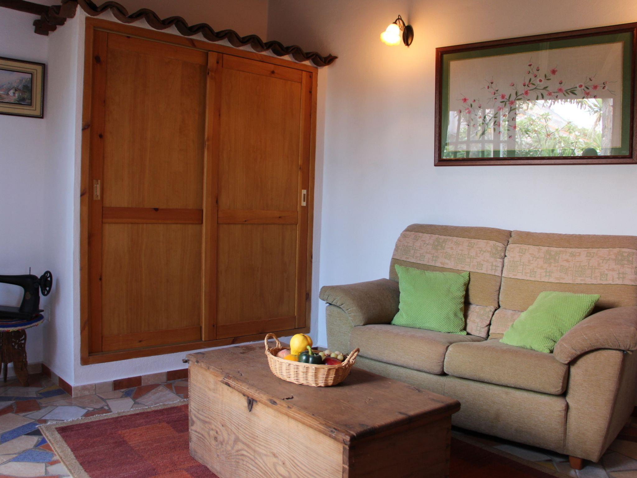 Das Wohnzimmer mit schönem Mosaikboden hat direkten Zugang zum Garten und bietet daher vom Sofa Blick ins Grüne. Ein kleiner, drehbarer Flachbildschirm wurde an der Wand angebracht. Als Couchtisch dient eine alte Holztruhe. Eine kleine Schiebetür führ zum kleinen Bad mit Dusche/WC, auch hier wurde die originale Natursteinwand des Hauses erhalten.
