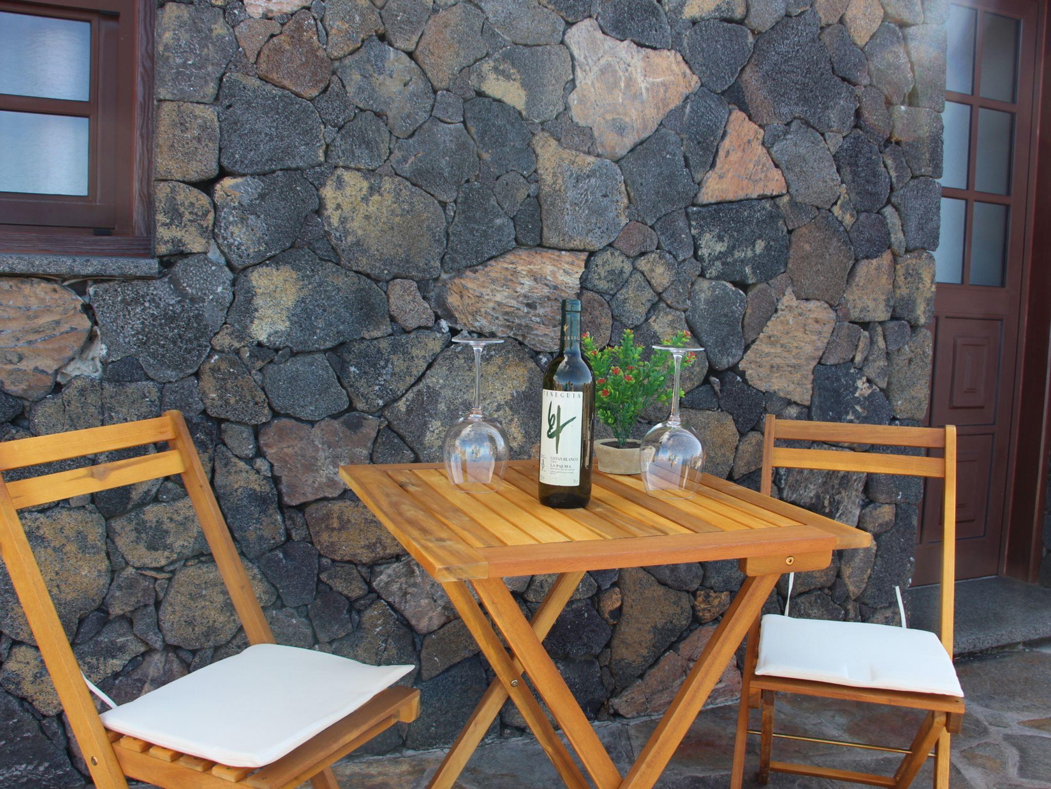 Die separate Küche ist gut ausgestattet, eine Wand wurde in Naturstein belassen. Dekorative Elemente wie z.B. eine alte Nähmaschine oder ein altes Spinnrad werden gekonnt in Szene gesetzt und verstärken den orginalen Charakter des Hauses. Zwei alte Kutschräder wurden zu einer Bank umfunktioniert. An der Wand zeigen alte Bilder Fuencaliente aus früheren Zeiten und kurz nach dem Vulkanausbruch. Von der Küche hat man Zugang direkten Zugang in den Garten.