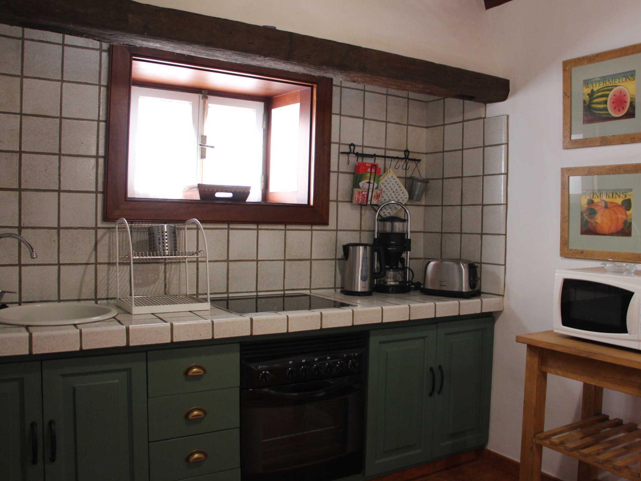Das Haus ist schlauchförmig und so geht man von Raum zu Raum. Das Wohnzimmer ist sehr gemütlich mit schöner Holzdecke, einem Sofa und zwei bequemen Sesseln. Der kleine Kamin heizt den Raum im Winter schnell auf. Die kleine Küche ist zum Wohnzimmer offen und gut ausgestattet. An einem kleinen Fenster findet ein Esstisch und 4 Stühlen Platz. An den Wänden finden sich viele Handarbeiten der Familie wieder. Im Bad mit Dusche/WC findet auch die Waschmaschine ihren Platz. Letzter Raum ist das Schlafzimmer mit zwei zusammenstehenden Einzelbetten. Eine Tür führt in den Außenbereich.