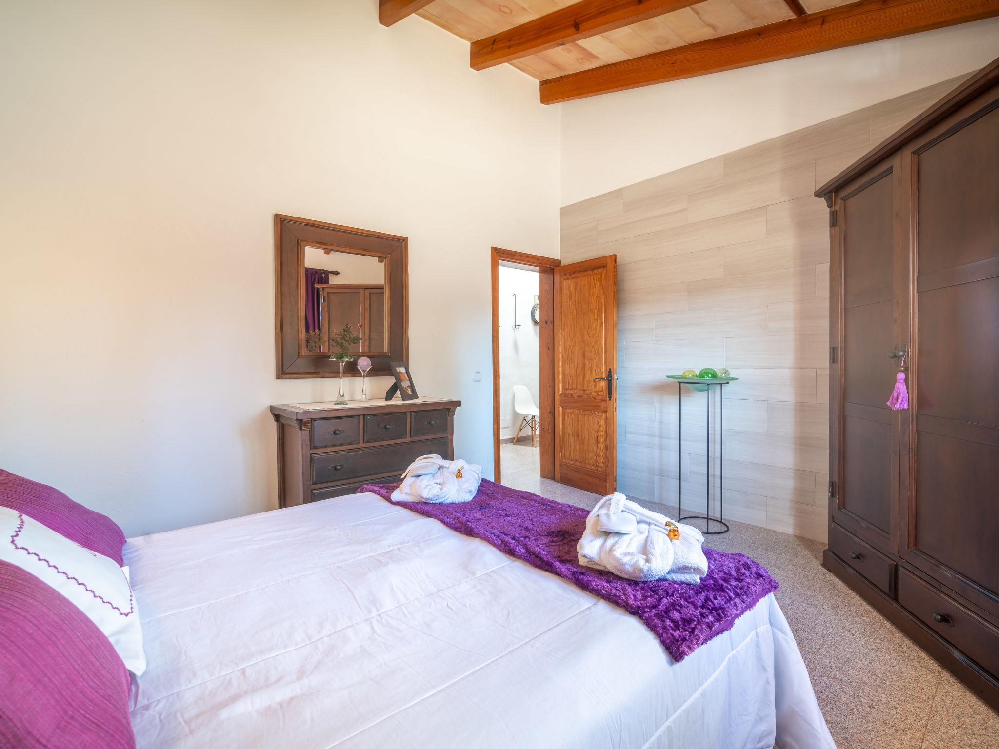 "Son Mulet", 3-room house 115 m2. Spacious and bright, comfortable and rustic furnishings: living/dining room with open-hearth fireplace, dining table, satellite TV, air conditioning and forced-air heating. Exit to the patio. 1 double bedroom with 1 french bed (1 x 160 cm, length 190 cm), air conditioning and forced-air heating. 1 double bedroom with 2 beds (90 cm, length 190 cm), air conditioning and forced-air heating. Open kitchen (oven, dishwasher, 4 ceramic glass hob hotplates, toaster, kettle, microwave, electric coffee machine). Shower/WC. Air-conditioning, forced-air heating. Heating not available in all rooms. Natural stone floors. Large patio. Terrace furniture, barbecue, deck chairs, covered balcony, box-room. Very beautiful view of the countryside. Facilities: washing machine, iron, mosquito net, children's high chair, baby cot for up to 2 year olds, hair dryer, baby changing unit. Internet (WiFi, free). Parking (roofed, 1 car). Suitable for families. ETV/19