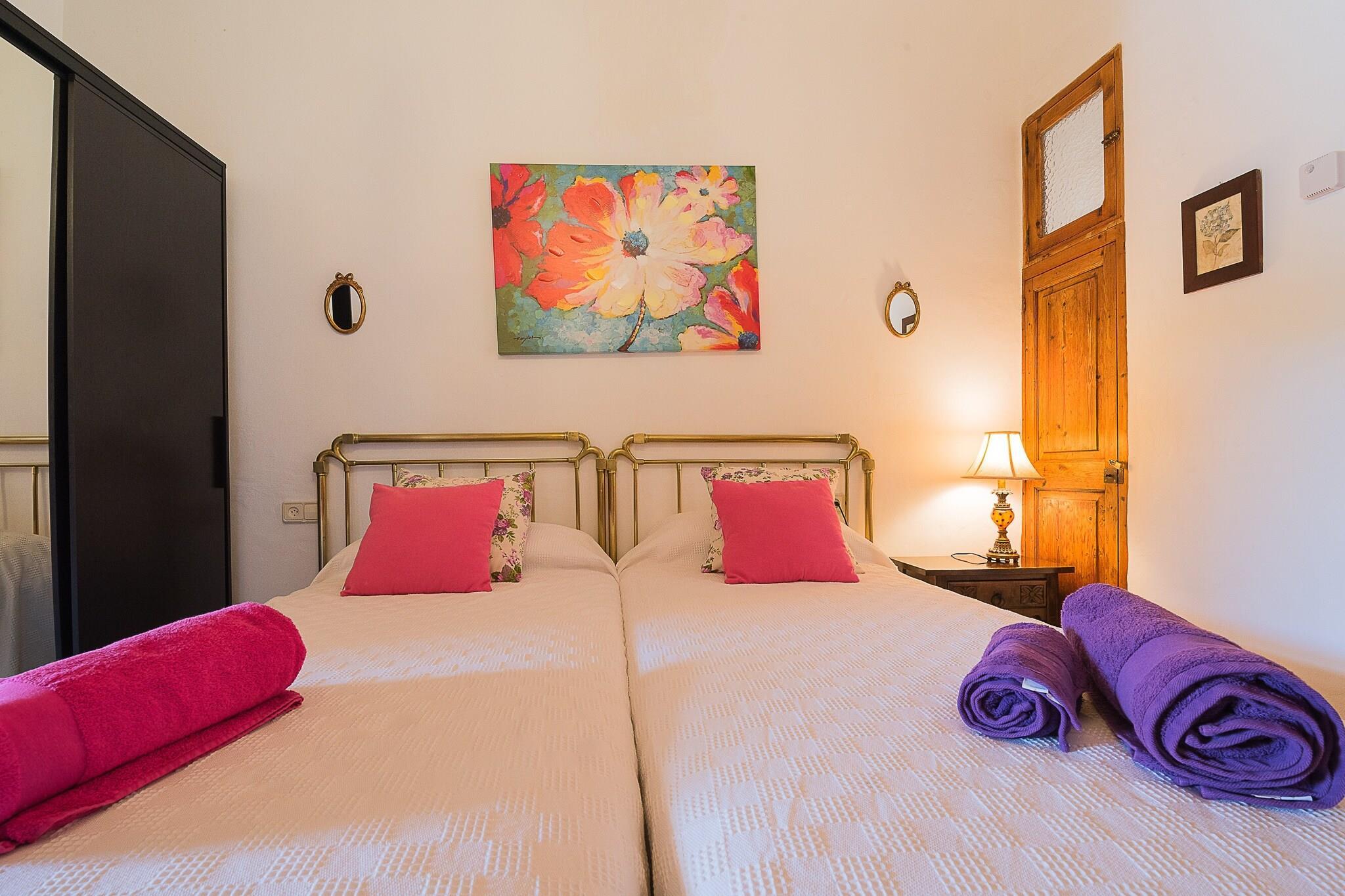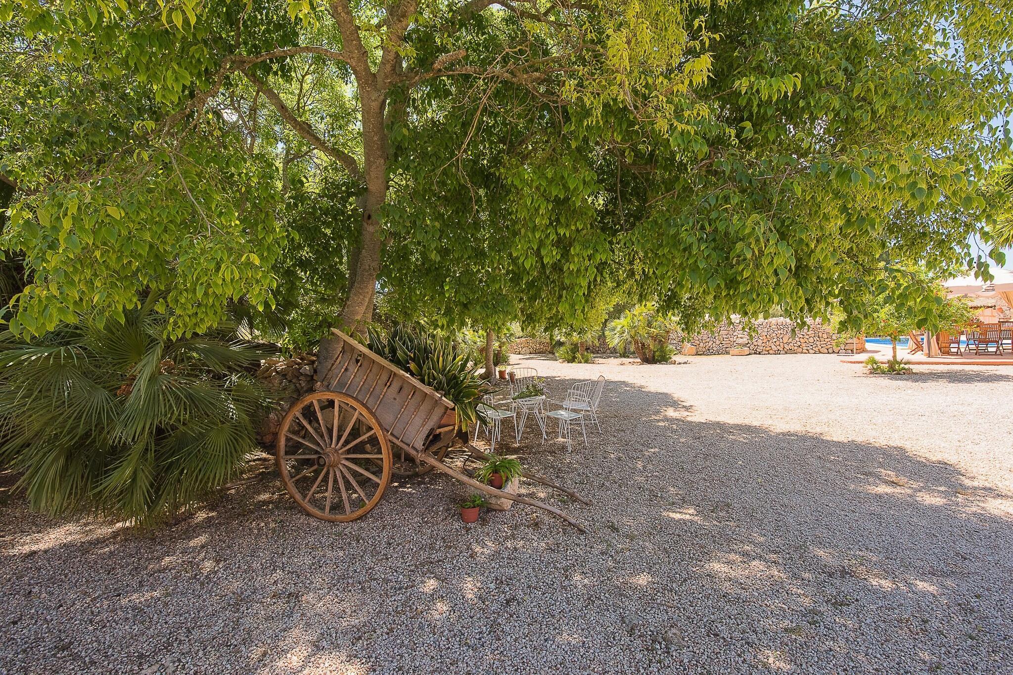 This is a wonderful Majorcan countryside house. It is very well preserved and it has all the comfort to make your holiday an unforgettable experience! The ‘possessió’ of Son Caldes is located near the town of Llucmajor and is more than 500 years old, which enhances the attractiveness of the place. The main building has three en suite bedrooms, a spacious living room, dining room and a fully furnished kitchen with capacity for all the guests. Some old features of the house have been very well preserved. At the same time, the house is equipped with new electrical appliances, central heating and a mix of new furniture with some restored pieces. There is a wine cellar as well where you will be able to see some hand-made barrels, which were made more than 200 years ago! In front of the main building you will find another house which is part of the whole group. This is a 2-storey house which has a very well decorated living room, a fully furnished kitchen and a bathroom on the ground floor. On the loft there is a bedroom, which is opened to the living room, with closet and two single beds. This building hasn’t got central heating, but there is a fireplace and that maintain the perfect temperature all year-round. The 4 bedrooms have AC. Outside the houses there is a big terrace and the pool area where you can refresh yourself during hot summer days! The terrace is furnished with tables, chairs and sun beds to enjoy dinners with family and friends or just relax sunbathing. There is a natural Mediterranean forest area and views to the countryside from everywhere! A short drive will take you to Palma city center or to beautiful beaches as Es Trenc, Cala Pi and Sa Rápita. The town of Llucmajor is just 1.5 km away and you will be able to find facilities as local markets, supermarkets, shops, bars and restaurants. This house is a charming place which is a little part of the history the island. At the same time, it is adapted to nowadays life and it has the comfort and personality to be the perfect place to spend your holiday! Do not hesitate to visit this vestige of the Mediterranean! Note: This accommodation is intended for families and guests over 25 years old who are looking for a peaceful stay. Bookings for parties or celebrations are not accepted. A copy of the identification document of all guests will be required to confirm the reservation. Consult the advertiser for possible charges. Pets are not allowed. The holding of events is forbidden. There is exterior parking for 4 cars. Distances Beach: 12 km - Cala pi Airport: 15 km - Palma Golf course: 17 km - Son Antem Town: 1.5 km - Llucmajor Train station: 20 km - Palma Bus stop: 1.5 km - Llucmajor Ferry: 20 km - Palma Hospital: 18.5 km - Son Llatzer Tourist license: ETV/3535Single Rental Registry: ESFCTU0000070180000403250000000000000000000000ET35359The Ecotasa (tourist tax) must be paid cash on site when checking in. The amount varies between 0.55EURO/night and guest during the low season and 2.2EURO/night and guest during the high season. The tax is reduced by half from the 9th day of your stay. All guests have to pay the Ecotasa, except people under 16 years. You will have to pay the deposit amount at the arrival to the owner.