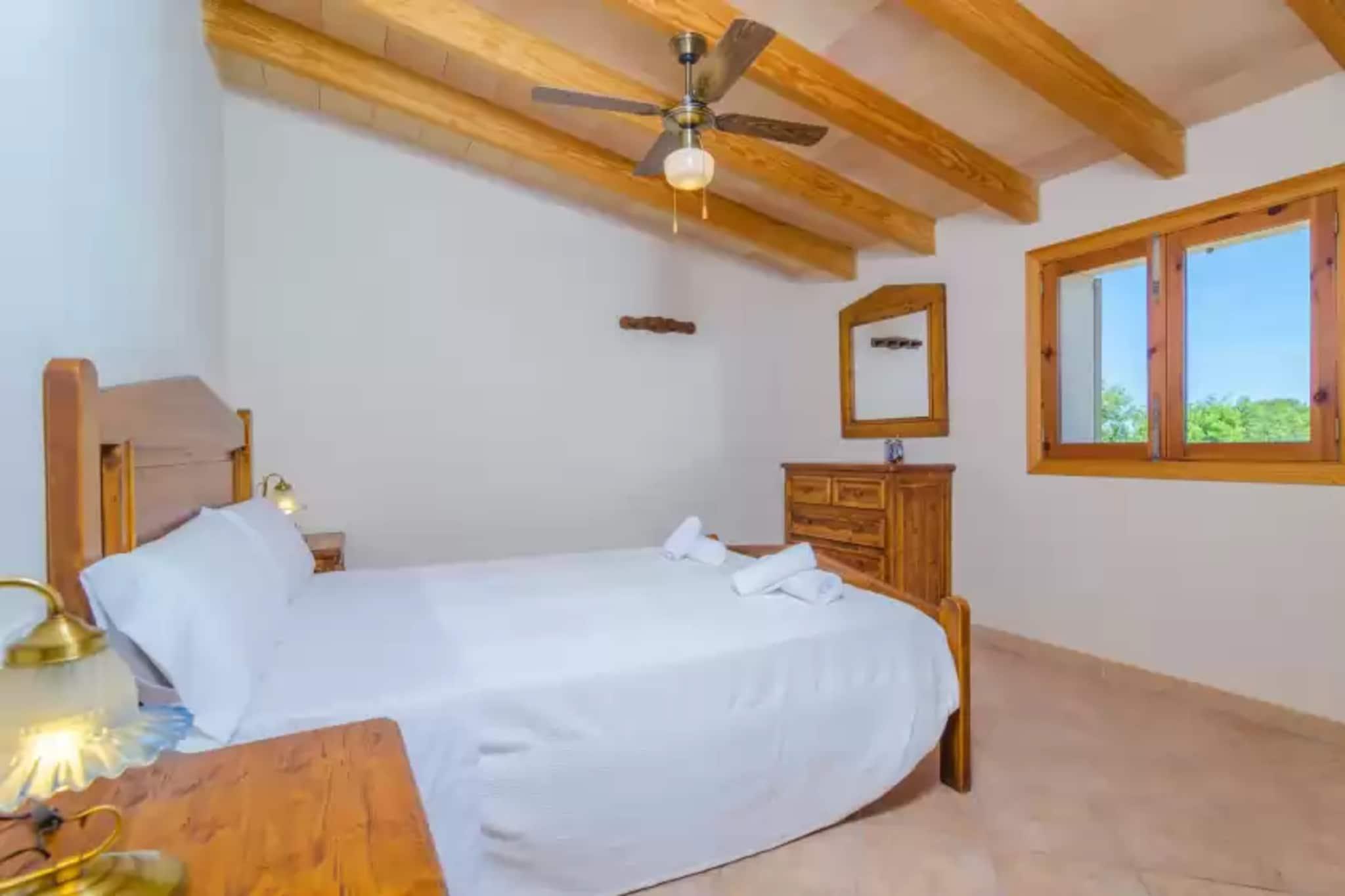 Resting peacefully within a natural environment, guests benefit from a 2.3m x 4.1m private chlorine pool with a depth ranging from 1.3m and 1.4m. Enjoy a lazy afternoon basking in the sun on one of the loungers or have lunch on the porch furnished for 6 people, overlooking the pool and the countryside. You will have access to the garden with fruit trees like plum and orange trees. It is a very idyllic place surrounded by meadows with sheeps. The plot is fenced and there are no direct neighbors, so you'll enjoy your privacy. The rooms are distributed over one floor and 190m2. When entering, there's an ample and bright living-dining room with satellite-TV, stove and a dining table for 8 people. The spacious kitchen with gas hob, fireplace and cooking utensils has another dining table for 6. There are three bedrooms, two with a double bed, fan and wardrobe - additionally, one has a bath with bathtub en-suite. The third bedroom comes with two twin beds, wardrobe and en-suite bathroom with shower. Another shower bathroom is available for the whole house. If you come with your baby, we can prepare a cot and a high chair. The house offers a laundry room with washing machine, iron and ironing board. This nice house is located at the foot of the hill Puig e Randa. In Llucmajor, 4.5km from the house, you'll find supermarkets, restaurants and everything else you may need during your stay. The beautiful beach Es Trenc with crystal clear waters and fine white sand is 24 km from the house. Note: This accommodation is intended for families and guests over 30 years old who are looking for a peaceful stay. Bookings for parties or celebrations are not accepted. A copy of the identification document of all guests will be required to confirm the reservation. Consult the advertiser for possible charges. Pets are not allowed. The holding of events is forbidden. There is exterior parking for 2 cars. Distances Beach: 23.6 km - Es Trenc Airport: 19.7 km - Aeroport Son Sant Joan Golf course: 11.4 km - Golf Son Antem Town: 4.5 km - Llucmajor Train station: 32.9 km - Estació Intermodal de Palma Bus stop: 4.7 km - Av. Carles V, Llucmajor Ferry: 31.1 km - Port de Palma Hospital: 28.4 km - Hospital Son Llàtzer Tourist license: ETV/3886Single Rental Registry: ESFCTU00000701800008782500000000000000000000ETV/38865There's a mandatory tourist tax in Balearic Islands, called Ecotasa. All guests, except people under 16 years, have to pay this tax. The amount varies between 0.55EURO/night and guest during the low season and 2.2EURO/night and guest during the high season .The tax is reduced by half from the 9th day for your stay.