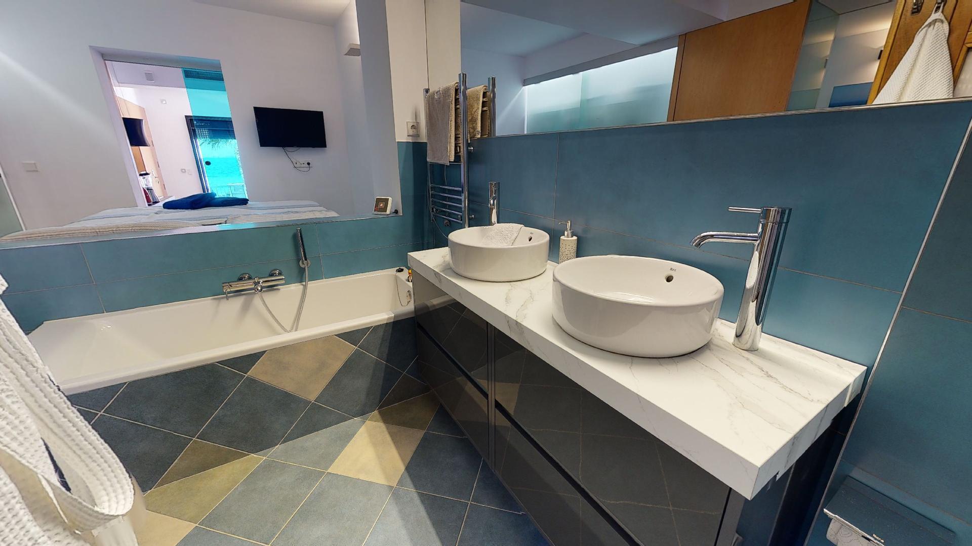 The master bedroom has an en-suite bathroom with two washbasins, shower and bathtub and a walk-in wardrobe. Two further guests share a sofa bed and a separate bathroom with shower and WC.