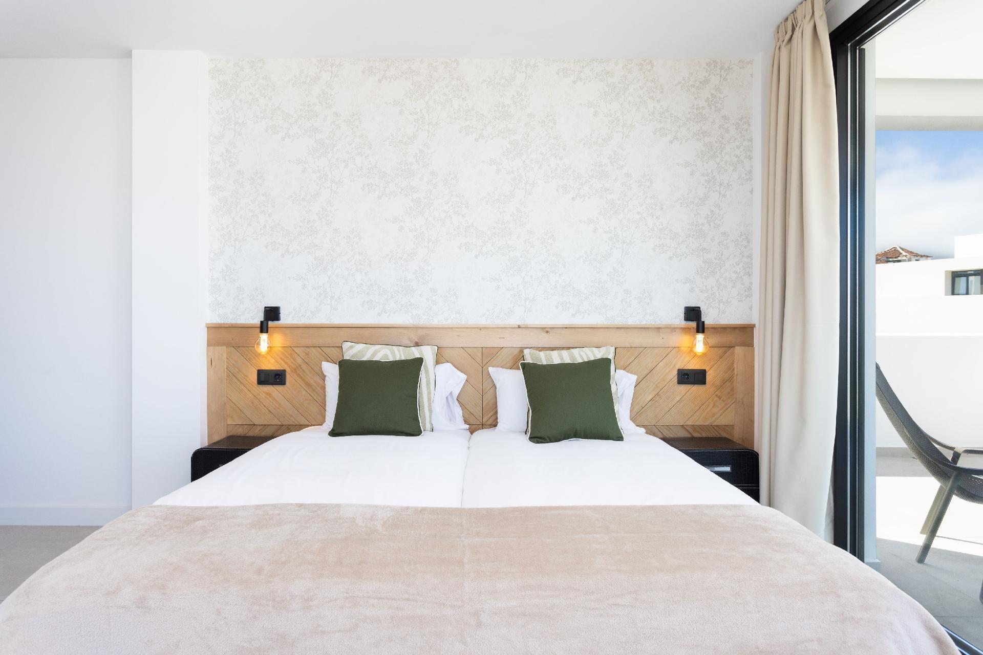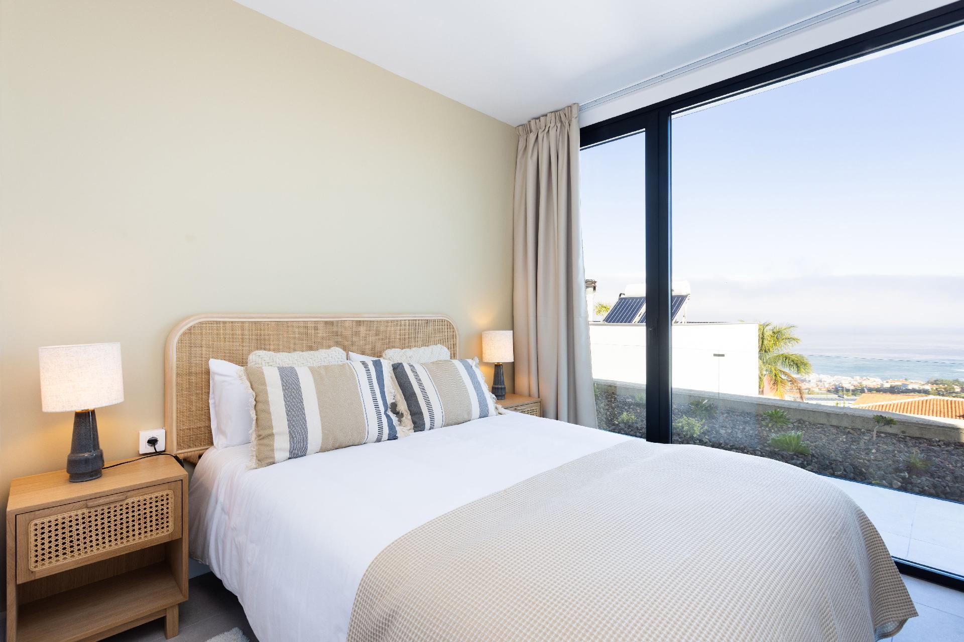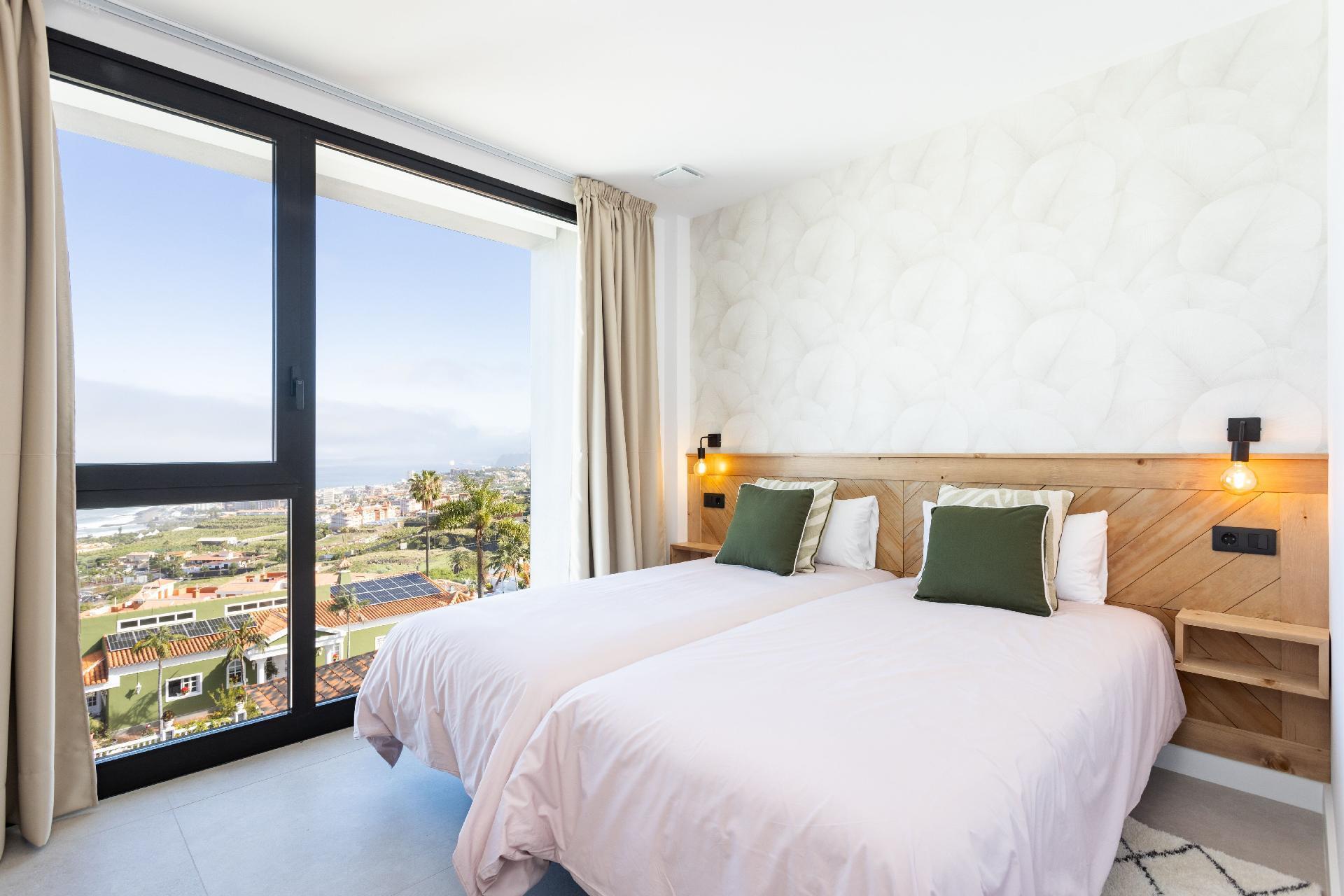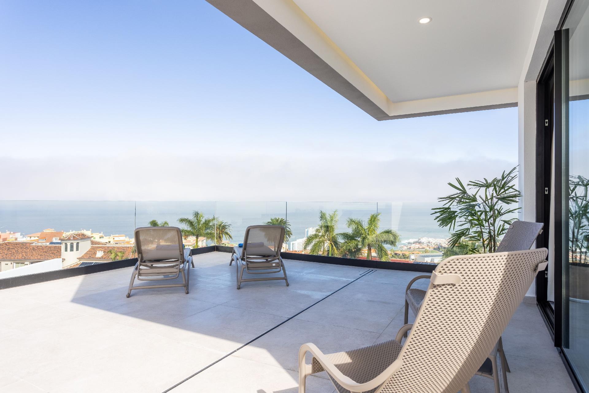 The upper floor has two bedrooms with single beds and two bathrooms, one of which has spectacular views of Puerto de la Cruz. The master bedroom also has a spacious balcony overlooking the pool.
