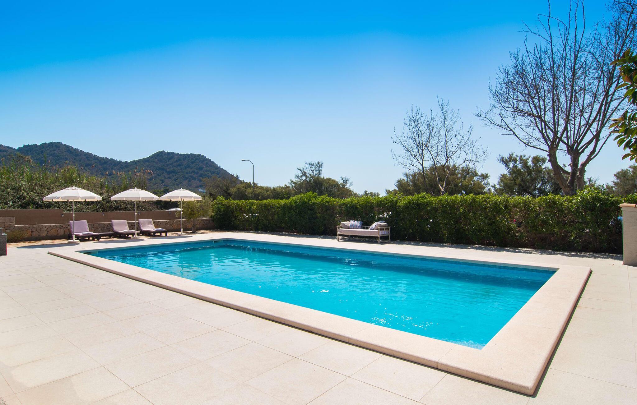 Die auf einem 1.200 m² großen Grundstück in der exklusiven Siedlung Costa dels Pins im Osten der Insel gelegene Villa „Luz del Sol“ – was übersetzt „Sonnenlicht“ bedeutet – liegt nicht nur direkt am Meer, sondern bietet auch einen fantastischen Ausblick Blick auf die grünen Berge auf der anderen Seite. Geschmackvoll im traditionellen Villenstil gestaltet, ist das Haus mit braunen Holzfensterläden fast vollständig von gepflasterten Terrassenflächen umgeben – zahlreiche Sitzgelegenheiten mit schattenspendenden Sonnenschirmen laden zu ein paar wohlverdienten Pausen ein. Wer jeden Sonnenstrahl genießen möchte, kann sich auf die großzügige Dachterrasse zurückziehen und in aller Ruhe den Blick auf das blau schimmernde Wasser genießen. Zum Schwimmen und Planschen bietet sich nicht nur das nahegelegene Meer an, sondern auch der großzügige, abfallende Pool, umgeben von beeindruckend hohen Palmen und duftenden Lavendelsträuchern: Dank der beachtlichen Beckenlänge lässt es sich hier wunderbar schwimmen Runden Sie Ihre Runden oder entspannen Sie sich einfach auf der Lilo mit einem Cocktail in der Hand.