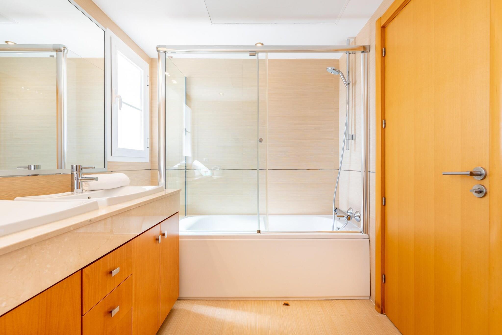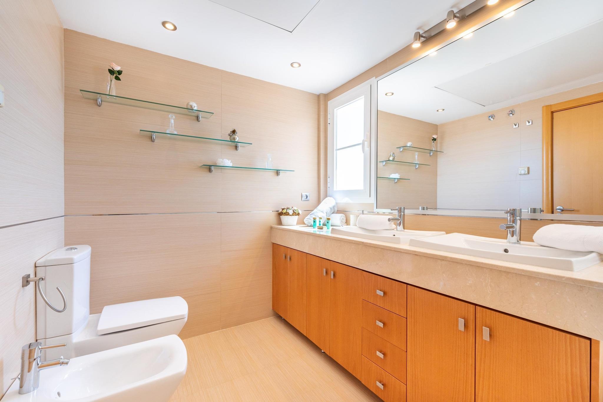 On the 1st floor: (Kitchen(boiling water tap, toaster, cooker, oven, microwave, dishwasher, fridge-freezer, Juicer), Living/diningroom(TV, dining table, seating area, balcony or terrace, air conditioning), bedroom(single bed, single bed, air conditioning), bedroom(single bed, single fold-away bed, air conditioning), Bedroom with bathroom(double bed, TV, bathtub or shower, washbasin, washbasin, toilet, air conditioning), bathroom(shower, washbasin, toilet)) parking, swimming pool(shared with other guests), tennis court(shared with other guests)