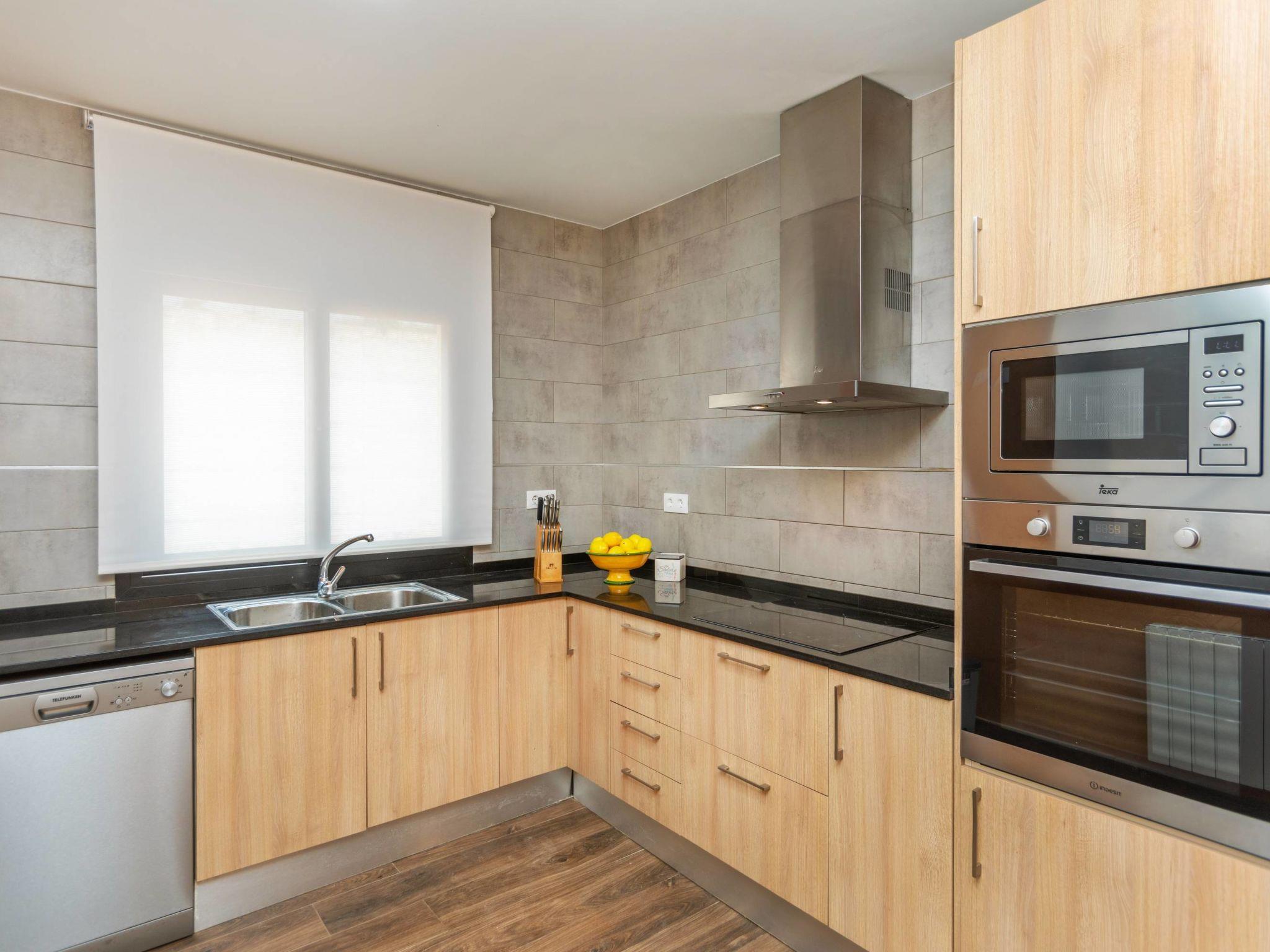 "Esteva", 6-room house 120 m2. Practical and cosy furnishings: living/dining room with dining table and digital TV. 1 double bedroom with 1 french bed (135 cm, length 190 cm). 1 double bedroom with 1 french bed (135 cm, length 190 cm). 1 double bedroom with 2 beds (90 cm, length 190 cm). Kitchen (oven, dishwasher, 3 ceramic glass hob hotplates, toaster, kettle, microwave, freezer, electric coffee machine). Shower/WC. Gas heating. On the lower ground floor: playroom. 1 children's room with 2 beds (90 cm, length 190 cm). Terrace furniture, barbecue, deck chairs, covered balcony, sitting area. View of the resort. Facilities: washing machine, iron, children's high chair, baby cot for up to 2 year olds, hair dryer. Internet (WiFi, free). Please note: 1 small pet/ dog allowed. TV only ES. HUTG-034296-71 // Reg. Nr.: ESFCTU00001701800048038800000000000000HUTG-034296-718