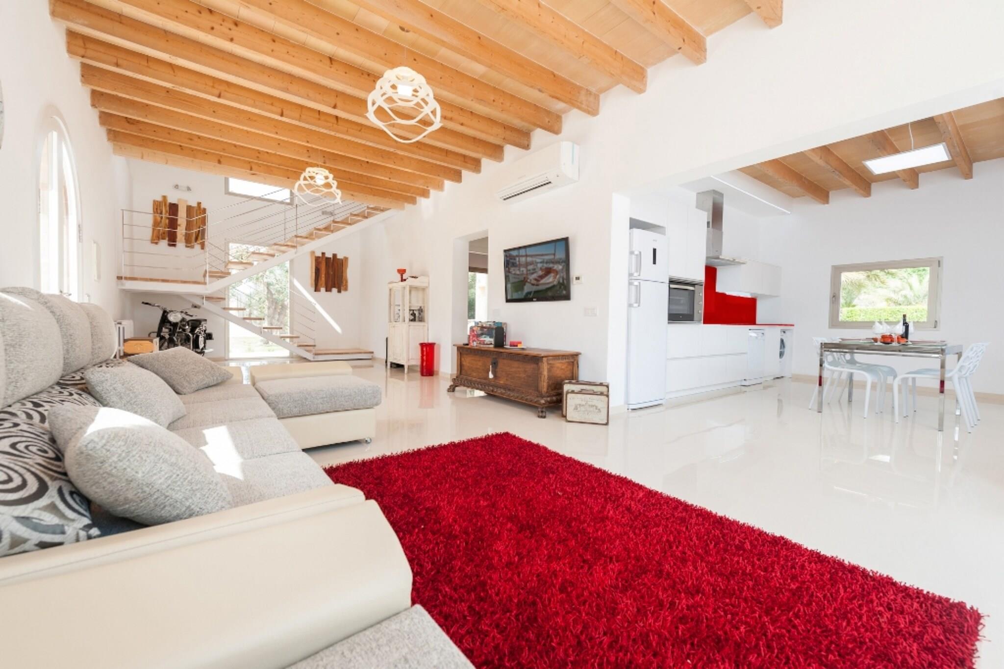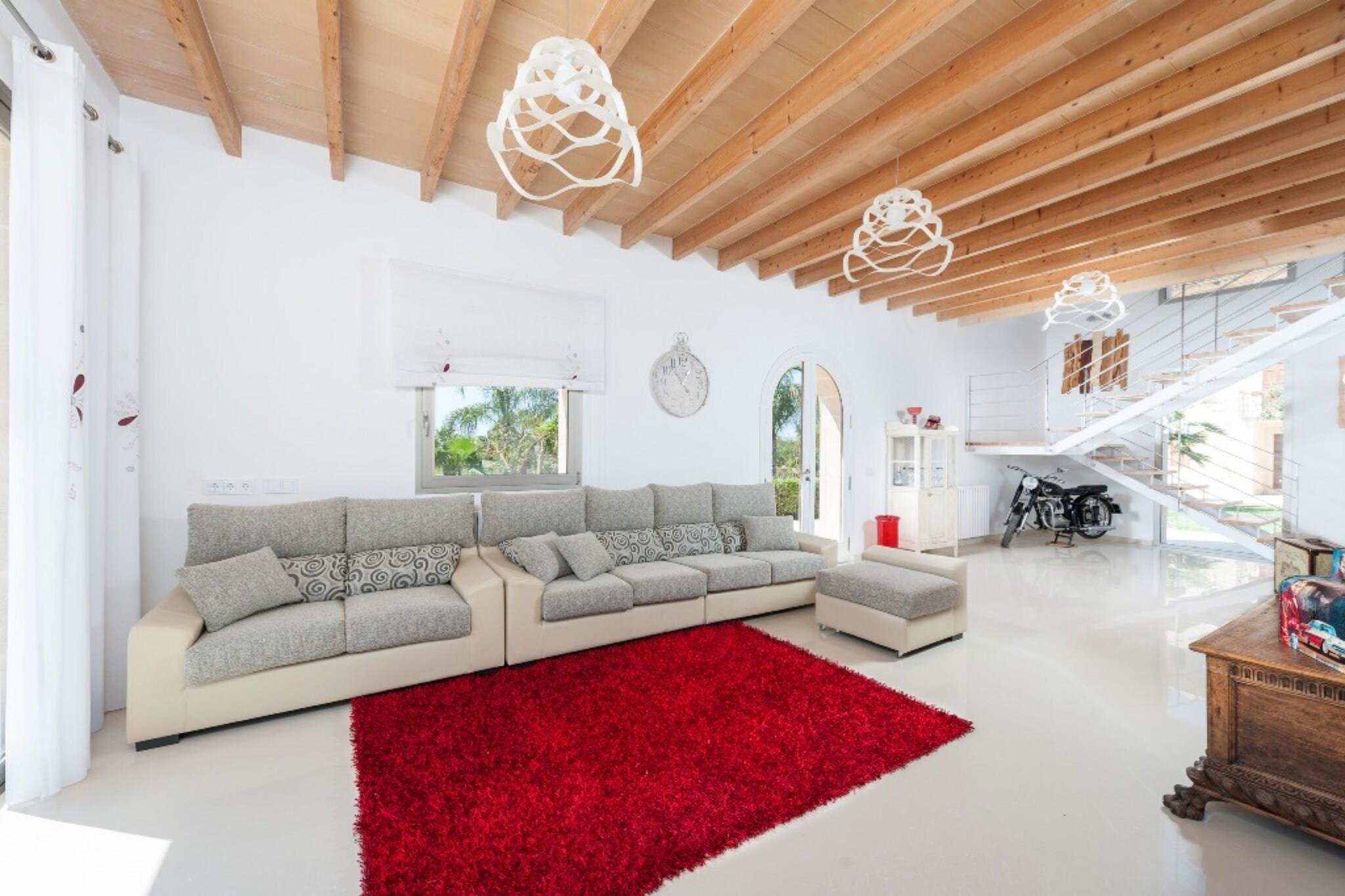 The impressive 186 m2 house, which mixes a modern style with the antique original house furniture, is located in a more than 300.000 m2 plot. It offers ample gardens and large paths that invite to have a walk and will make you feel a fantastic sensation of freedom. Just on the other side, there are some old houses where the housekeepers live. Nevertheless, all installations are fully private, and no one will interfere in your privacy. In these beautiful gardens, the wonderful salt pool highlights. It sizes 8x4 metres and its depth goes from 1.40 to 2 metres. It is surrounded by 4000 m2 of green lawn, ideal to sunbathe on one of the 10 sunbeds or have fun with the little ones. The two storey house will make you feel at home thanks to the mixture of whites and wooden stuff, with some coloured touches. It offers some peculiar decorative elements like the Rieju bike, completely restored, at the stairwell. The ground floor provides a spacious living room open to the dining kitchen which is air-conditioned and where you will relax on the comfortable sofa watching satellite TV. The kitchen offers all you need to cook delicious recipes during your vacation, including a vitro top, an oven, a microwave, a toaster, an electric coffee maker,...The stainless steel and glass table can accommodate 10 people. In this same floor there is a toilet, a double bed bedroom with a en-suite shower bathroom and access to the terrace. The other three bedroom are upstairs. One has twoo single bed and the other two offer double beds. The three of the offer an en-suite shower bathroom and closet, and they are vey well decorated. Of course, there is a cot and a high chair available, as well as a washer, an iron and an ironing board. The house is fully equipped with central heating for the winter season with a little extra cost. Outside, a terrace surrounds the whole building, the perfect place for great summer outdoors evenings, squeezing the barbecue expressly built for our guests. You will find an outside dining area for 8 people with a great pergola. In this finca you will find peacocks, sheep, horses and other farm animals that you can visit if you wish. In addition you can have long walks through the forest area at the back of the property. Maria de la Salut is a little town in the centre of Mallorca. The town square is the perfect place to enjoy outdoor dinners in summer and the street market takes place on Fridays. In the village you will find all you need for your stay: pharmacy. supermarket, sports area, bars, restaurants,... The beach in can Picafort is just 15 minutes away by cae. It is a sandy beach ideal to practice water sports and have a drink in the evening at some beach bar. Other virgin beaches like Cala Torta and s’Arenalet des verger, are only 30 minutes away. There is a fully equipped bicycle workshop with tools and other utensils. Note: This accommodation is intended for families and guests over 30 years old who are looking for a peaceful stay. Bookings for parties or celebrations are not accepted. A copy of the identification document of all guests will be required to confirm the reservation. Consult the advertiser for possible charges. Pets are not allowed. The holding of events is forbidden. There is exterior parking for 5 cars. Distances Beach: 13 km - Can Picafort Airport: 42.9 km - Son Sant Joan Golf course: 26 km - Alcanada Town: 3.5 km - Maria de la Salut Train station: 8 km - Sineu Bus stop: 3.5 km - Maria de la Salut Ferry: 25 km - Port D'Alcúdia Hospital: 17 km - Hospital Comarcal d'Inca Tourist license: ETV/5876Single Rental Registry: ESFCTU00000701100051355400000000000000000000ETV/58760The Ecotasa (tourist tax) must be paid cash on site when checking in. The amount varies between 0.55EURO/night and guest during the low season and 2.2EURO/night and guest during the high season. The tax is reduced by half from the 9th day of your stay. All guests have to pay the Ecotasa, except people under 16 years. You will have to pay the deposit amount at the arrival to the owner.Homerti - Central de Reservas CR/33 Electricity (January - December): 0.35 EUR/KW (mandatory)