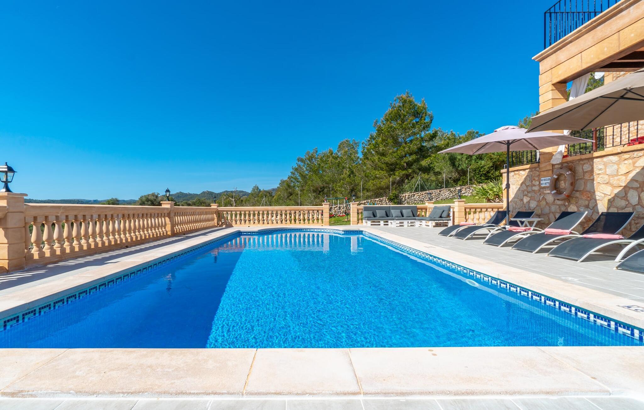Vom Pool oder der Terrasse gelangt man über mehrere bodentiefe Fenster in das Innere des Hauses. Der großzügige Küchenbereich liegt hinter großen Fensterelementen, deren bogenförmige Formen an einen Weidenkorbgriff erinnern und den Raum mit angenehmer Helligkeit durchfluten. Die Küche verfügt über zahlreiche Schränke und eine Theke im amerikanischen Stil mit mehr als ausreichend Stauraum. Die 3 farbigen Hocker unterstreichen den modernen und offenen Charakter dieses Bereichs. Unter „vollmöbliert“ versteht man nicht nur die fest installierten Elektrogeräte wie Backofen, Mikrowelle, große Kühl-Gefrierkombination und Herd, sondern auch Mixer, Kaffeemaschine, Toaster, Wasserkocher und vieles mehr. Der Wohnbereich mit den braunen Bodenfliesen und bequemen Sofas rundet seine gemütliche Atmosphäre mit Hilfe eines Kamins ab. Die Schlafzimmer sind alle modern eingerichtet, verfügen über bequeme Betten und sind teilweise mit hochwertigen Mustertapeten geschmückt. Von einigen Schlafzimmern im ersten Stock gelangen Sie auf den großen Balkon, den Sie bei Sonnenuntergang unbedingt nutzen müssen, um bei einem guten Glas mallorquinischem Rotwein die Stille und den herrlichen Naturblick zu genießen. Es stehen 4 moderne Badezimmer, teilweise mit Eckbadewanne oder Dusche, zur Verfügung, wobei 2 Badezimmer en-suite sind.