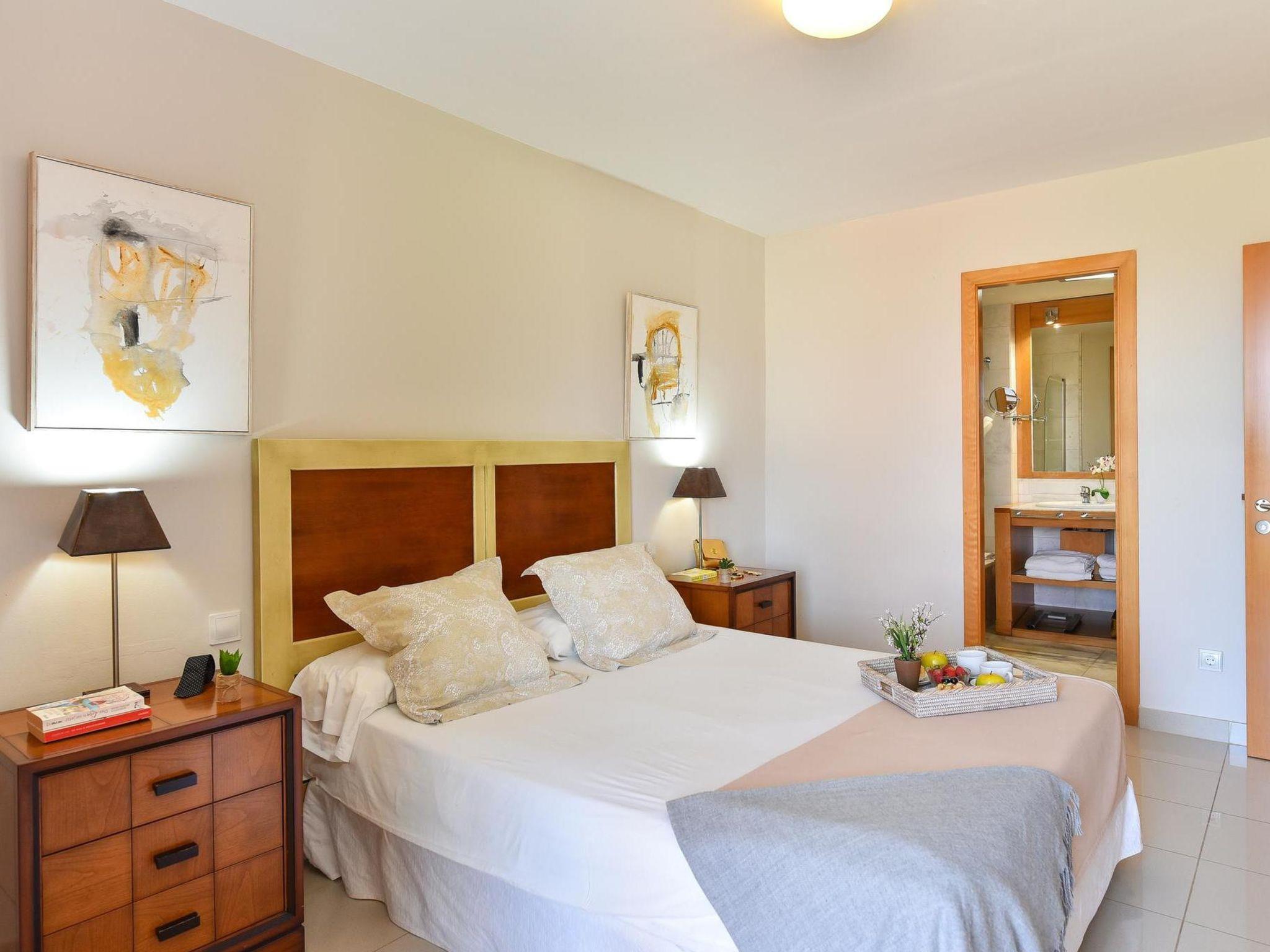 "Tipo Nº6", 3-room house 105 m2 on 2 levels. Comfortable and modern furnishings: living/dining room with dining table, satellite TV, digital TV, hi-fi system, DVD and air conditioning. Exit to the patio, to the swimming pool. 1 room with 1 french bed, bath/bidet/WC and air conditioning. Exit to the garden, to the swimming pool. Open kitchen (oven, dishwasher, 4 ceramic glass hob hotplates, toaster, kettle, microwave, freezer, electric coffee machine). Upper floor: 1 room with 2 beds, bath/WC and air conditioning. Exit to the terrace. Patio. Terrace furniture, barbecue, deck chairs. View of the mountains and the garden. Facilities: washing machine, dryer, safe, iron, children's high chair, baby cot for up to 2 year olds, hair dryer. Internet (WiFi, free). Parking (1 car). Please note: non-smoking house. Maximum 1 pet/ dog allowed. 2017/263 // Reg. Nr.: ESFCTU0000350120003181590000000000000VV-35-1-00003180