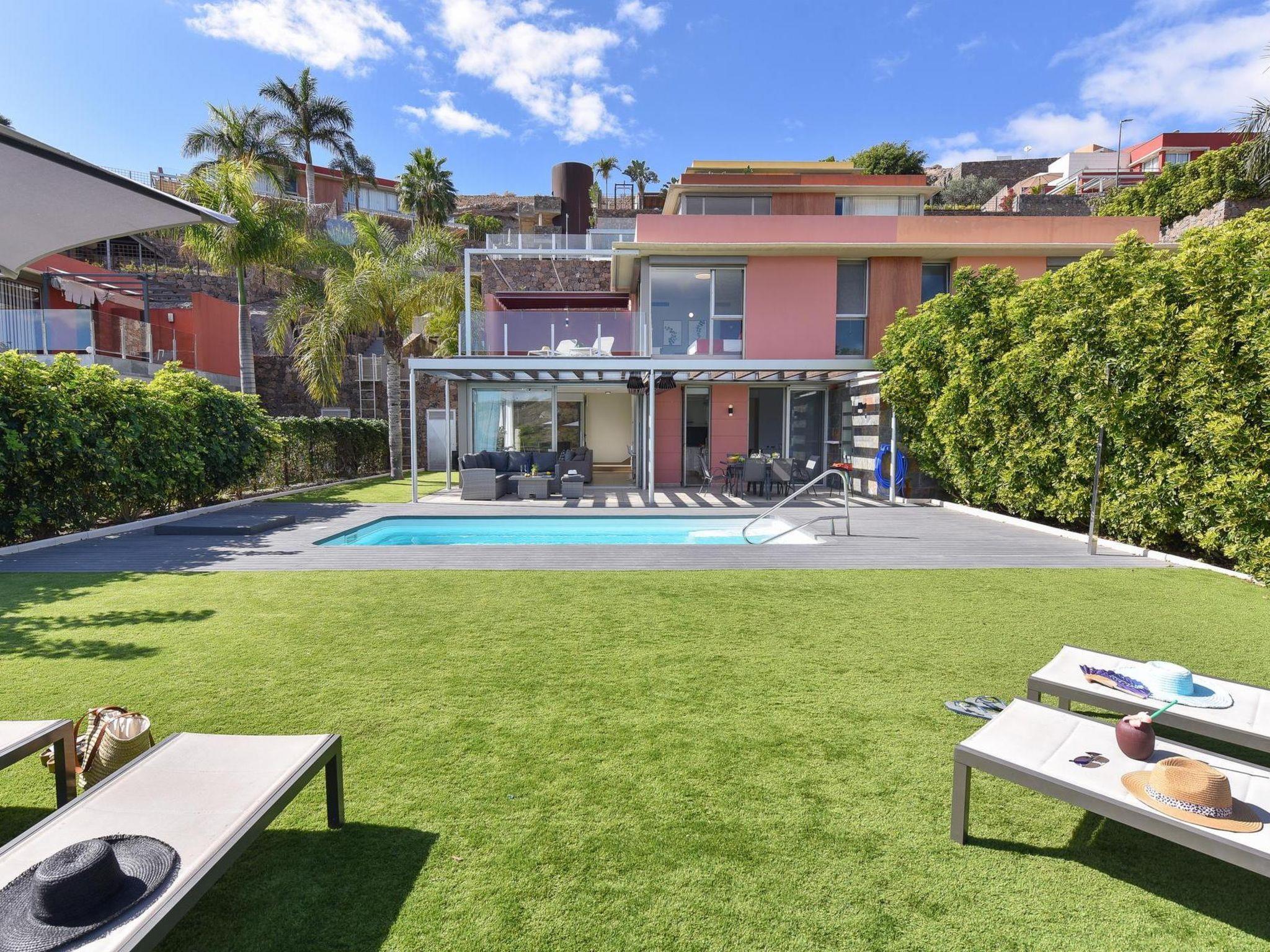 Modern, comfortable villa "Los Dragos 13". In the centre of Maspalomas, in a quiet, sunny position. Private: garden (fenced) with lawn, swimming pool angular (6 x 3 m, depth 100 - 100 cm, seasonal availability: 01.Jan. - 31.Dec.). Outdoor shower. In the house: sun terrace, air conditioning. Parking on the premises, public parking on the road. Bus stop "Las Crucitas" 19 km. The owner does not accept any youth groups. Please note: airfield 40 km from the property. Neighbourhood highly sensitive to noise. Quietness and good behaviour expected.
