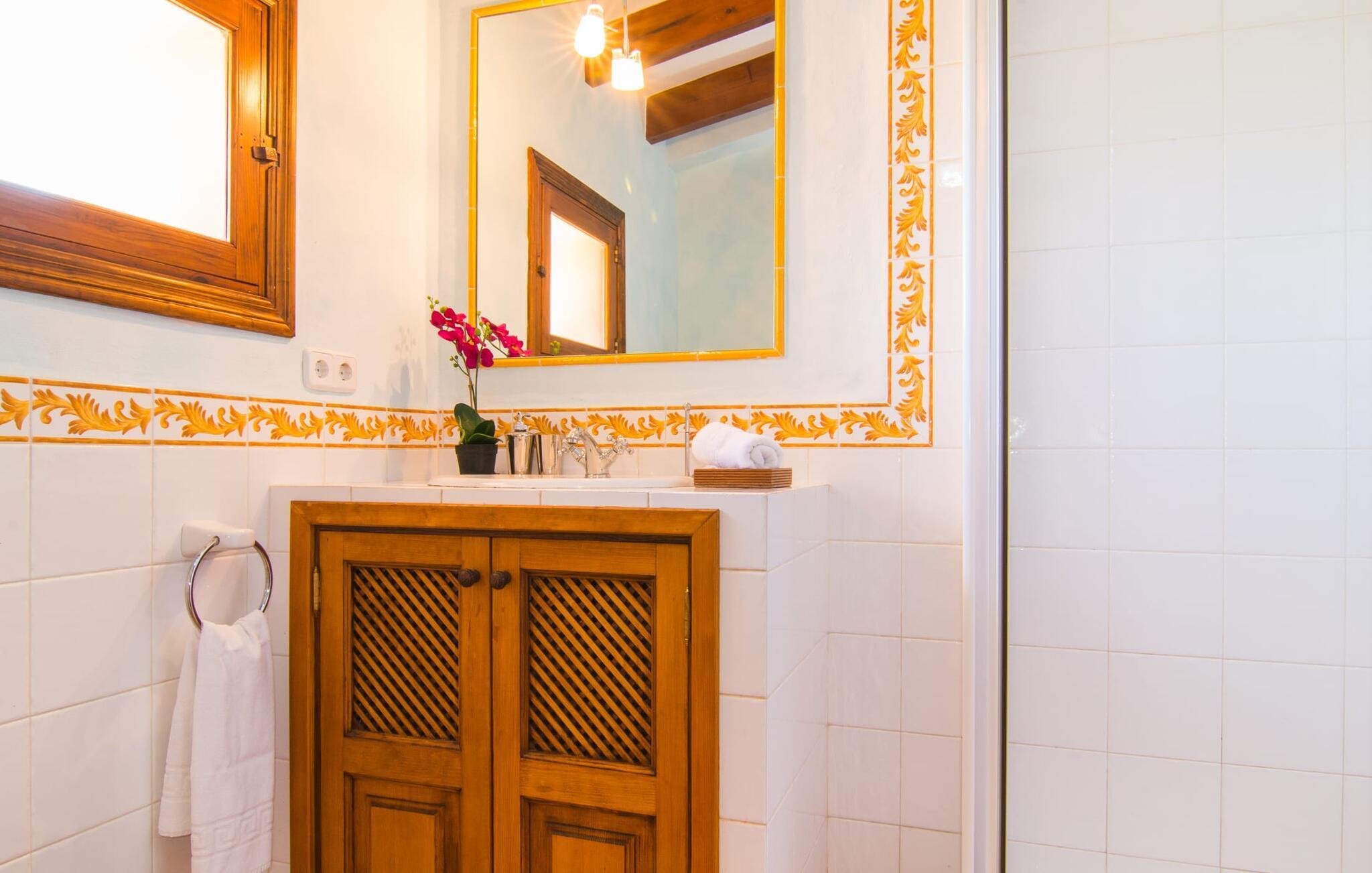 Gleichzeitig ist hier auch der Fernseher bequem untergebracht. Die Mahlzeiten können am urigen Esstisch eingenommen werden. Sollten Sie sich anders entscheiden, können Sie es bei schönem Wetter draußen genießen. Die kleine, teilweise ummauerte Küche ist hell und geräumig und verfügt über einen Kühlschrank, einen Backofen, einen Herd, eine Mikrowelle und vieles mehr. Ein Fernseher ist ebenfalls vorhanden; Allerdings empfängt es nur spanische Übertragungen, da in diesem Naturschutzgebiet keine Satellitenverbindungen erlaubt sind. Dezente Farbtöne sowie Deckenbalken aus Massivholz runden die gemütliche Atmosphäre dieses Hauptwohnzimmers harmonisch ab. Das Schlafzimmer empfängt den Gast in einem heimeligen und zugleich eleganten Ambiente. Warme Elemente wie das Licht und das Holz an der Decke, an den Fenstern und den Möbeln verbreiten eine angenehme Atmosphäre. Einzigartig auch von hier aus: der fantastische Ausblick aus dem Fenster. Das Tageslichtbad ist ebenso modern und funktionell ausgestattet und in fröhlichen Farben gehalten.