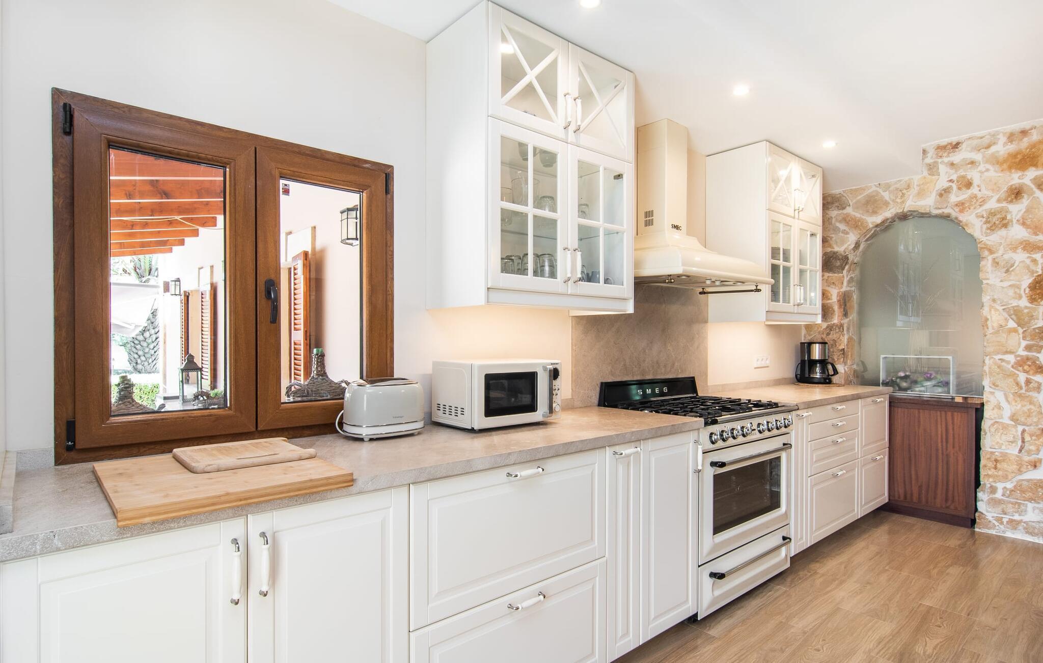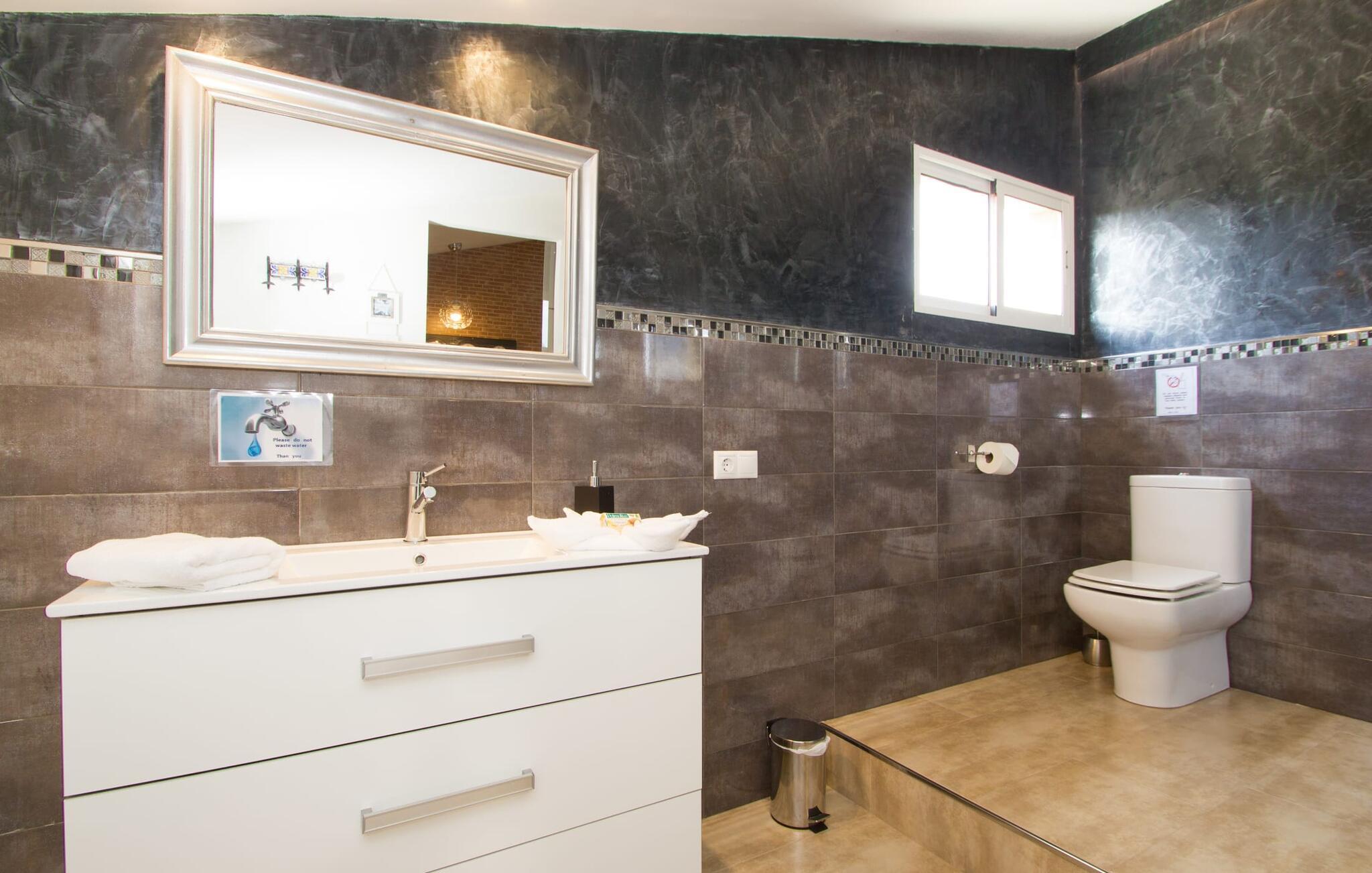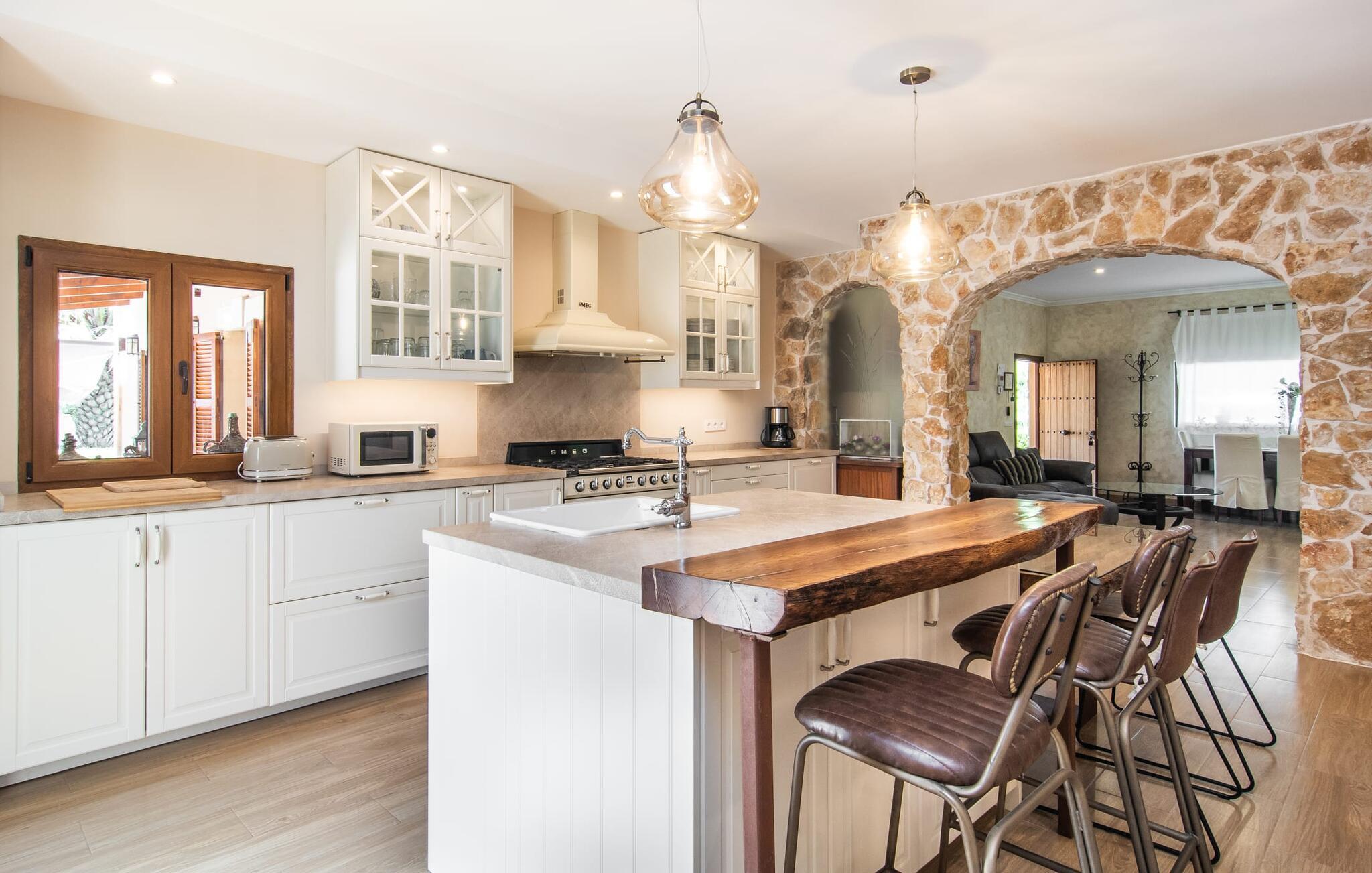 Ein rustikales Interieur voller moderner Elemente bietet die sympathische Umgebung für Ihre Indoor-Aktivitäten. Die Natursteinelemente setzen sich hier fort und werden von pastelligen und kräftigen Farbtönen sowie verschiedenen dekorativen Bodenbelägen begleitet. Wer gerne kocht, kann in der geräumigen Küche, die komplett mit Herd, Backofen, Geschirrspüler, Kühl-/Gefrierkombination, Mikrowelle, Wasserkocher und Filterkaffeemaschine ausgestattet ist, nach Lust und Laune kochen. Wie wäre es, ein typisch spanisches Gericht zuzubereiten und es gemeinsam auf der Terrasse zu probieren? Wenn das Wetter nicht mitspielt und Sie drinnen essen möchten, können Sie dies perfekt am großen Esstisch in der Küche tun oder im gemütlichen Wohn-/Esszimmer im Nebenzimmer, das über einen Rundbogen zugänglich ist und in dem sich auch eine große , sehr bequemes Sofa für perfekte Entspannung. Hier können Sie einen Abend mit Filmen verbringen, der Flachbildfernseher mit Satellitenanschluss steht bereit. Wer gerne im Internet surft, kann dies jederzeit mit der kabellosen DSL-Verbindung tun. Die Schlafzimmer sind in sehr unterschiedlichen Stilen gehalten. Jeder findet den idealen Ort zum Entspannen entsprechend seinem persönlichen Geschmack – sei es für die Erwachsenen im grau-weißen Zimmer mit begehbarem Kleiderschrank oder im rosa-violetten Zimmer oder für die Kinder in den unterschiedlich und farbenfroh eingerichteten Zimmern. Alle diese Ruhezonen sind klimatisiert und bieten die Bettgrößen 1,50 x 1,90 m (2x) und 0,90 x 1,90 m (2x). Im Erdgeschoss befinden sich die beiden Kinderzimmer, ein Doppelzimmer und ein Badezimmer mit Badewanne und Dusche; entsprechend befinden sich das zweite Badezimmer (mit Dusche) und ein Schlafzimmer im Obergeschoss – mit kleiner Terrasse plus Chill-Out-Ecke! - untergebracht. Die beiden Badezimmer bieten Platz, Komfort und Tageslicht, ein Fön ist ebenfalls vorhanden.