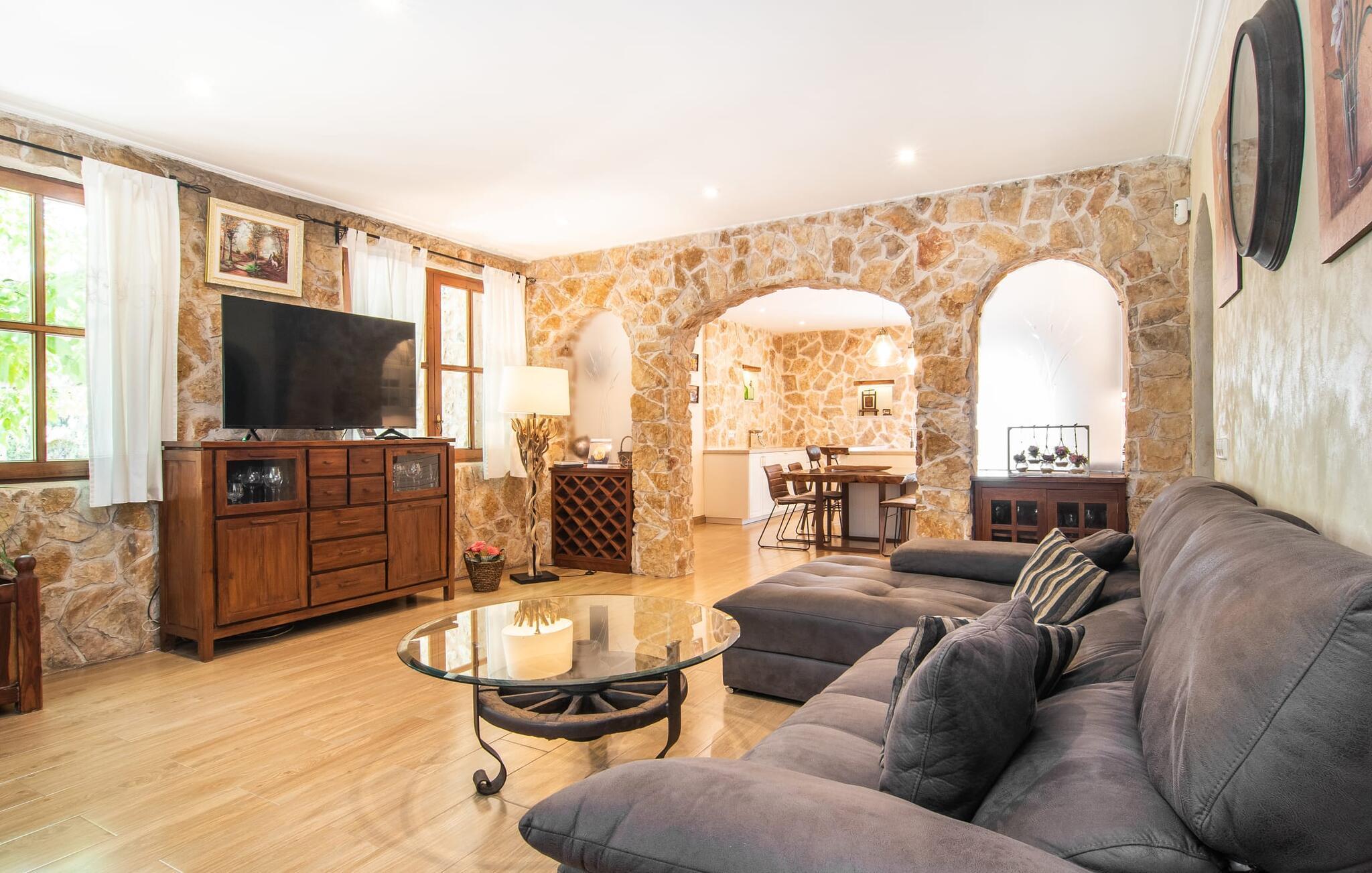 Umgeben von einem mit viel Liebe gepflegten Garten finden Sie die Villa „Miralles“ mit ihrer typisch spanischen Natursteinfassade sowie ansprechender Architektur, die sich harmonisch in die umliegende Landschaft einfügt. Von Juni bis September könnte dies Ihre Sommerresidenz sein, in der Sie Ihren Urlaub in Privatsphäre und geschmackvoller Atmosphäre verbringen können. Sie genießen eine gute Anbindung an andere Städte, insbesondere nach Búger – Sie können dort in nur 5 Minuten mit dem Auto ankommen und Ihre täglichen Einkäufe erledigen. Grünes Gras, Palmen, Blumen und andere mediterrane Pflanzen prägen den gepflegten Außenbereich, der zu allerlei Freizeitaktivitäten unter der Sonne einlädt. Man spürt, dass sich die Eigentümer hier besonders um die Räumlichkeiten kümmern. Ein kleiner Teich, eine Hängematte und eine Spielecke für Kinder sind kleine, aber feine Hingucker, die ebenso wie der wunderbar erfrischende Pool mit seinem dekorativen Delfinmosaik den individuellen Charme dieses Objekts ausmachen. Die Tiefe des Pools variiert zwischen 1,20 und 2,20 m und ist über eine Treppe und Leiter erreichbar. Vor dem Haus, mit Blick auf den Pool, finden Sie eine überdachte Terrasse, auf der ein schöner Esstisch und ein Außensofa zum Entspannen im Schatten einladen. Mit einem leckeren Getränk in der Hand und dem Blick in den Garten können Sie hier Ihre innere Ruhe finden und den Alltagsstress angenehm ausklingen lassen. Eine praktische Outdoor-Küche macht das Leben im Freien noch einfacher. Vielleicht möchten Sie den ganzen Tag draußen sein? Das ist in Ordnung – wir haben hier sogar einen weiteren Kühlschrank!