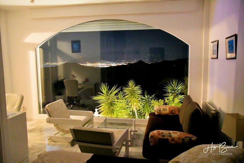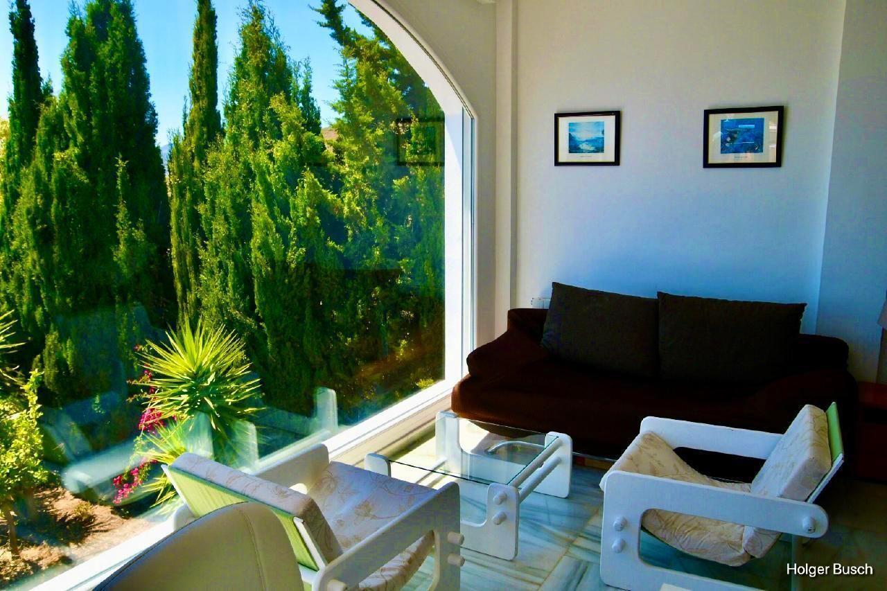 The outdoor area of the villa unfolds in all its splendour on a plot of 8500 m², the upper part of which is fenced and includes a terrace of approx. 200 m² between the house and the pool. From here there is an incomparable view of the lights of Málaga or cruise ships entering the harbour. Equipped with a large lounge sofa, a dining table for 8 people, sun loungers and a barbecue, as well as additional sun protection provided by a pergola and an awning for the dining area, nothing stands in the way of cosy hours under the Spanish sun. The heated pool has an interesting shape with an integrated bench and allows you to sit in the water and enjoy the spectacular view.