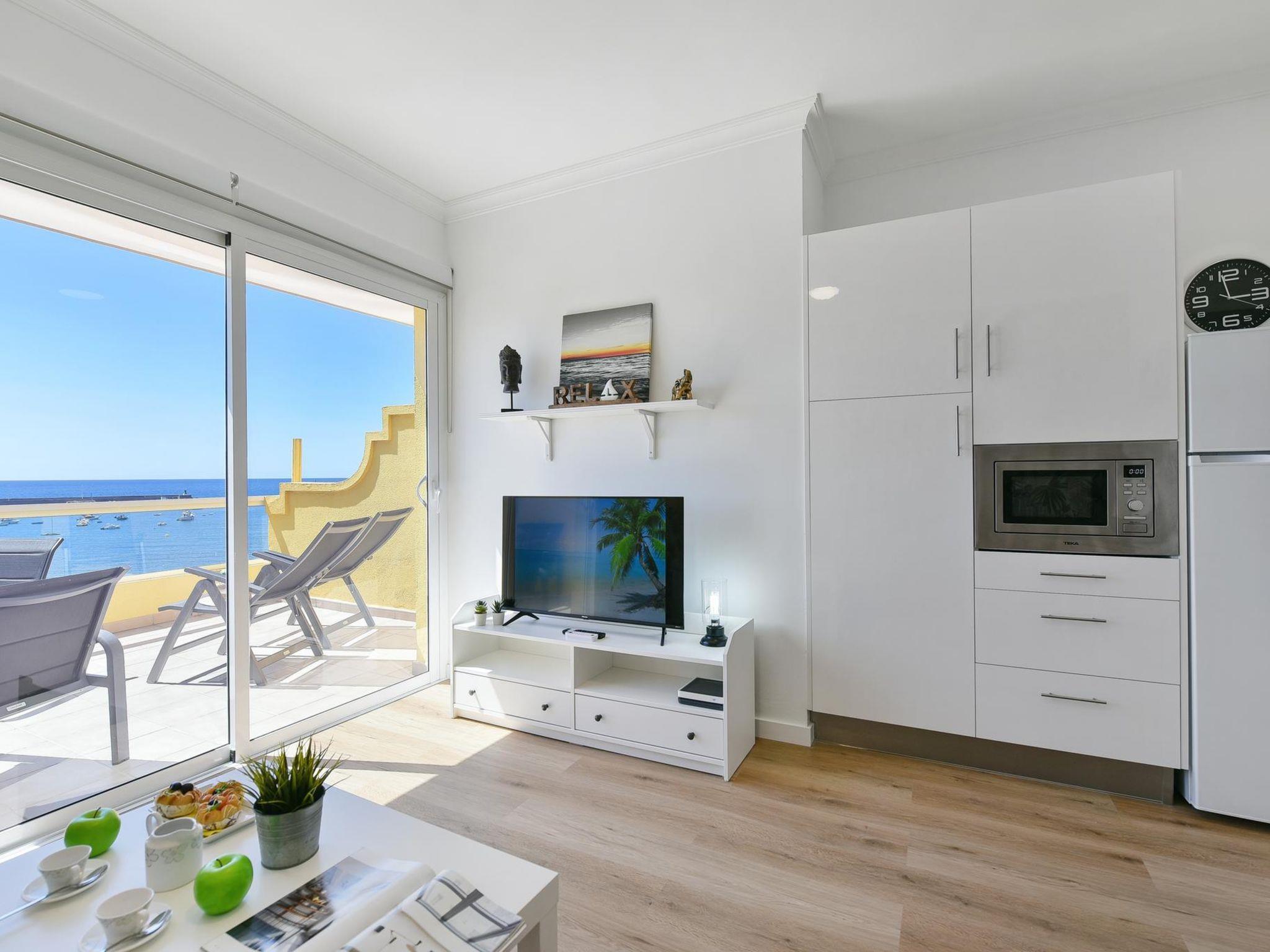 "305 FP", 2-room apartment 40 m2. Object suitable for 2 adults + 1 child. Bright, comfortable and modern furnishings: living/dining room with dining table, satellite TV, digital TV, flat screen and fan. Exit to the balcony with shower/WC. Open kitchen (2 ceramic glass hob hotplates, toaster, kettle, microwave, electric coffee machine). Parquet floors. Balcony furniture, deck chairs, sitting area. Very beautiful panoramic view of the sea. Facilities: iron, children's high chair for up to 2 year olds, hair dryer. Internet (WiFi, free). Please note: suitable for families. Non-smoking house. Maximum 1 small pet/ dog allowed. 2023-T9619 // Reg. Nr.: ESFCTU0000350210001282790000000000000VV-35-1-00201588