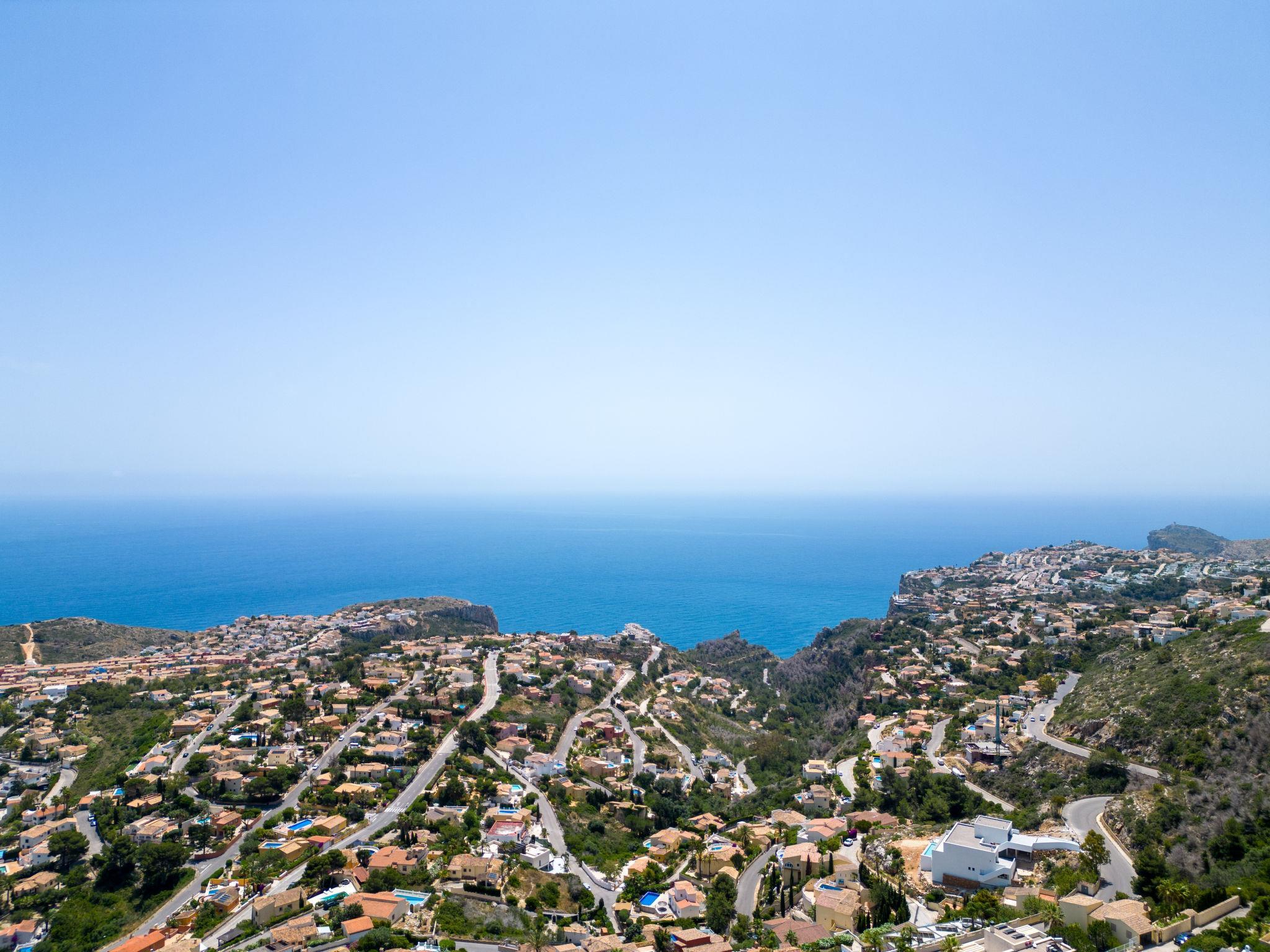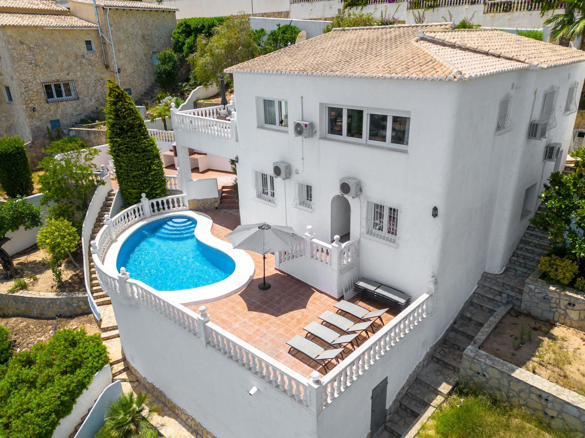 Cumbre del Sol: Beautiful villa "Dalias", 2 storeys. In the resort 8 km from the centre of Moraira, in a quiet, sunny, elevated position residential area (villas), traffic calmed area, 3 km from the sea, 3 km from the beach. Private: property (fenced), terraced garden, swimming pool (8 x 4 m, depth 120 - 200 cm, seasonal availability: 01.Jan. - 31.Dec.). Outdoor shower, terrace, barbecue. Supermarket 1 km, restaurant 1 km, shingle beach "Cala del Moraig" 3 km. Sports harbour 9 km, marina 9 km, golf course 11 km. Nearby attractions: Aqualandia, Mundomar, Terra Mítica, Terra Natura, Benidorm Palace (Benidorm), Les Fonts de l'Algar. Please note: car recommended.
