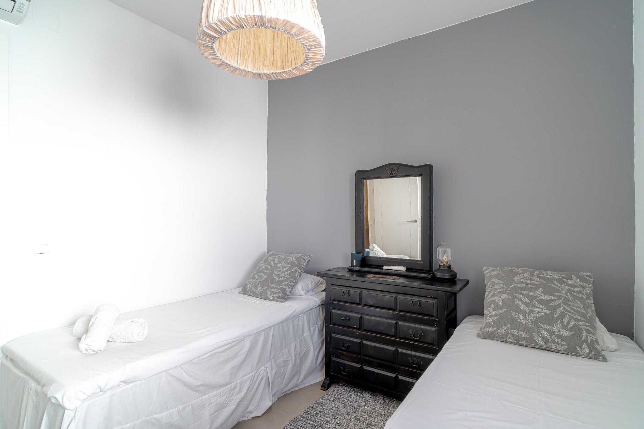 Los Aguacates Bellavista is a charming holiday home with stunning views of the Mediterranean Sea, located in Nerja's peaceful Capistrano area. This two-bedroom property offers a serene escape, just 2 kilometers from the beach. Enjoy the sea views from both the master bedroom and living room, and wake up to a picturesque start every day. The home features two terraces, one of which is accessible from the lounge and leads to the communal swimming pool, ideal for relaxation and enjoying the Mediterranean climate. The spacious master bedroom offers a high-quality double bed, facing the sea with a private terrace perfect for sunbathing. The second bedroom is furnished with two comfortable single beds. The property also includes a fully equipped kitchen, air conditioning, high-speed internet, and international TV channels. A modern bathroom with a shower and an additional toilet on the living room floor add convenience for guests. The beautifully landscaped Urbanisation Aguacates Bellavista offers botanical gardens, avocado trees, and a well-maintained pool area. Parking is easy to find, even during the high season. For added convenience, you can book an airport transfer and request a welcome pack with cold drinks and snacks. Personalized check-in is available from 16:00, with a host manager to greet you and ensure a smooth arrival.