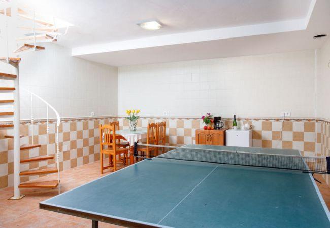 In the basement (1st floor) there are two bedrooms with 2 single beds each. It has a living room, ping pong table, refrigerator and a bathroom with a bathtub.