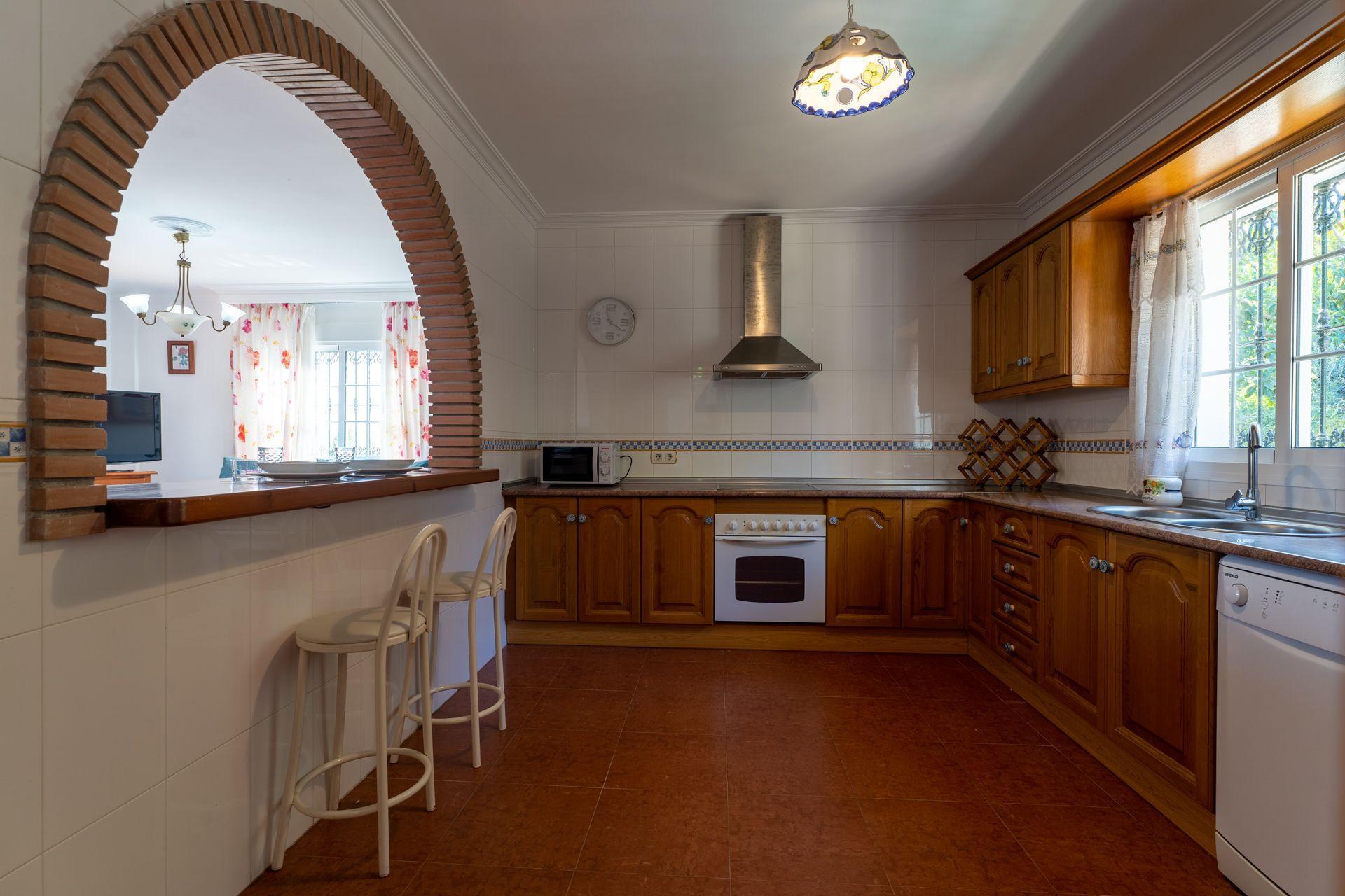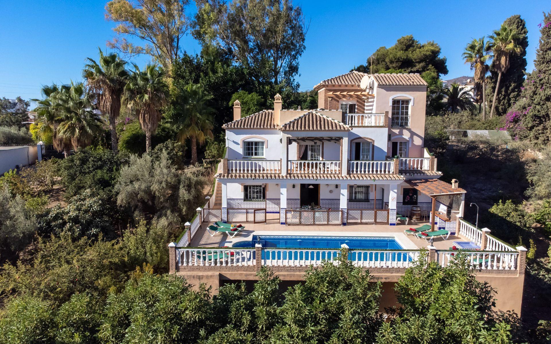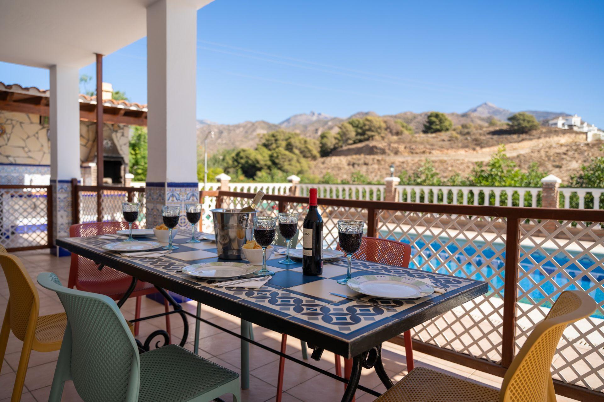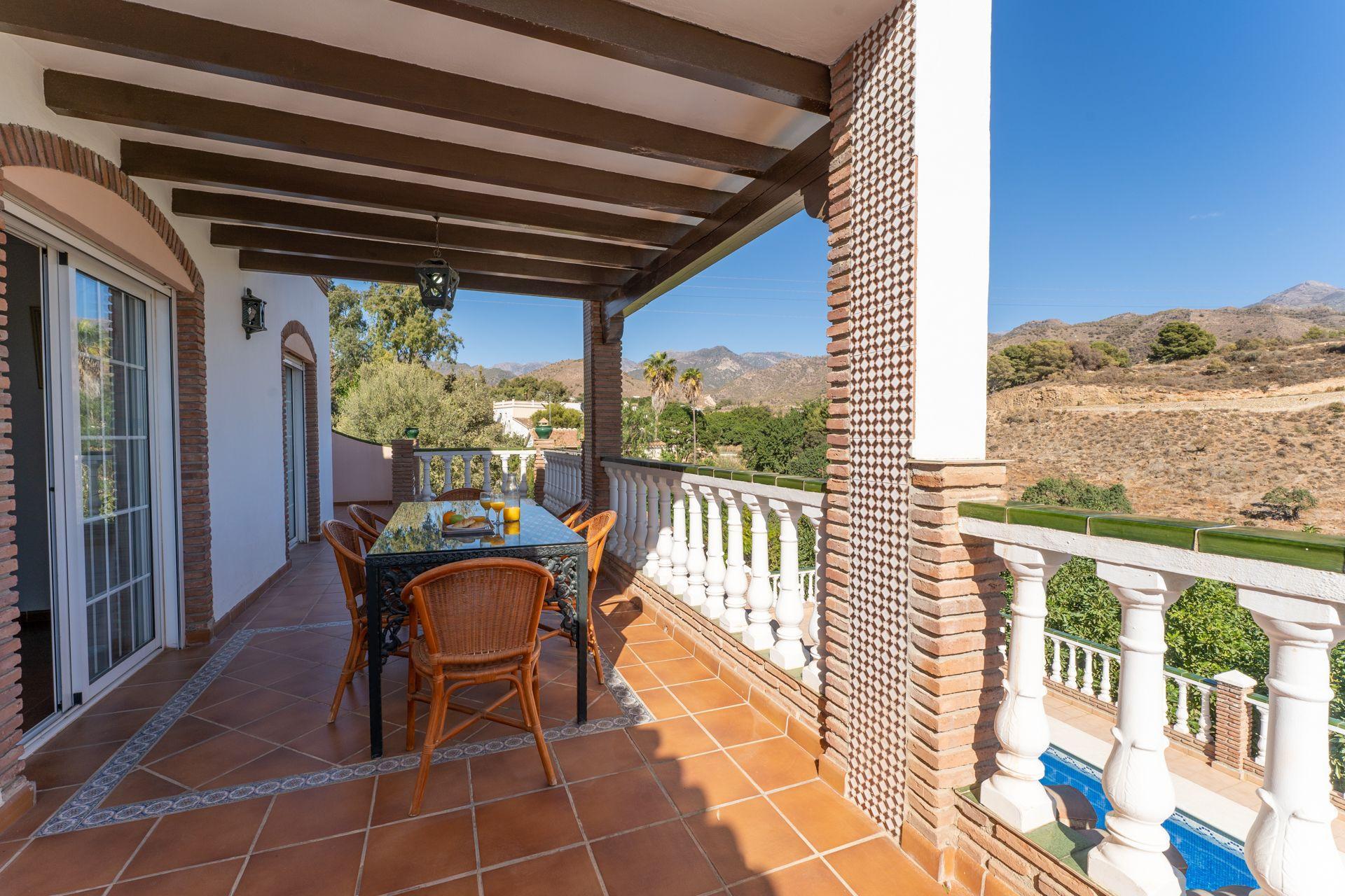 If you are looking for a villa close to the town centre and the beach, then this may be the right choice. This comfortable villa is located in the Exotica area of Nerja just a short drive from the town centre and the beach. Well appointed throughout, offering spacious accommodation, this is the ideal choice for large families or groups of friends. Outside, a delightful covered terrace overlooks the pool and offers wonderful views of the countryside, the mountains, and the Mediteranean coastline.
