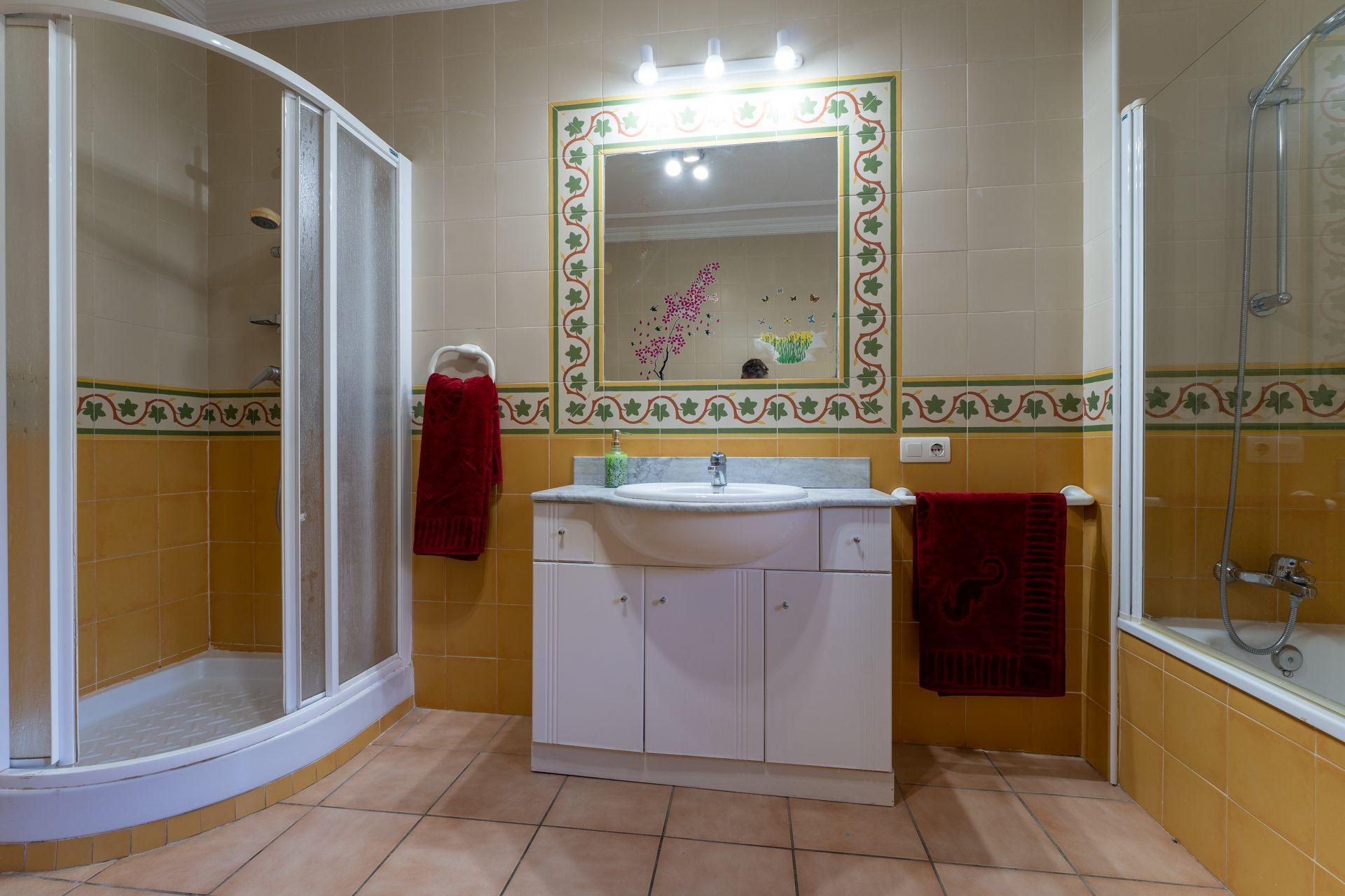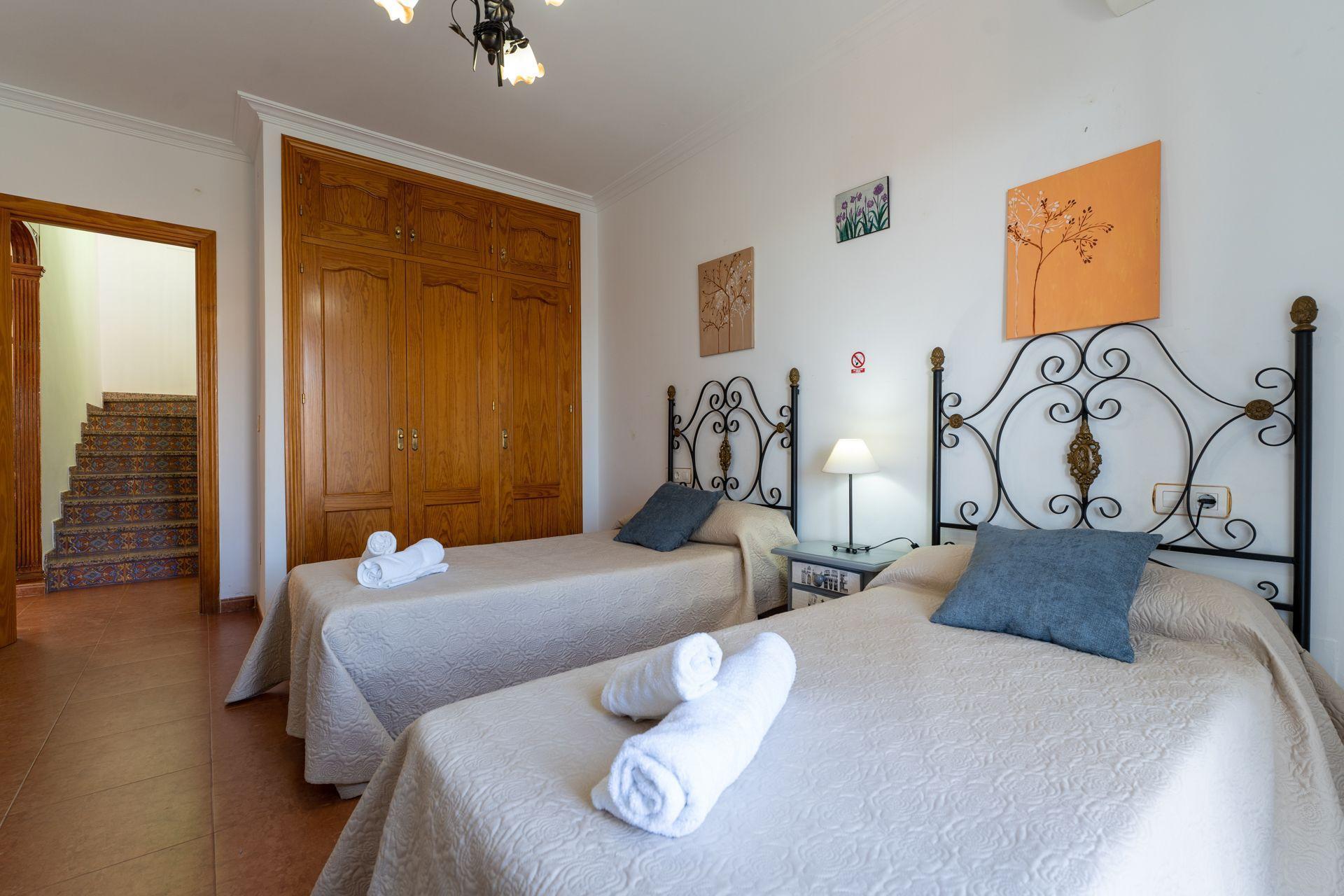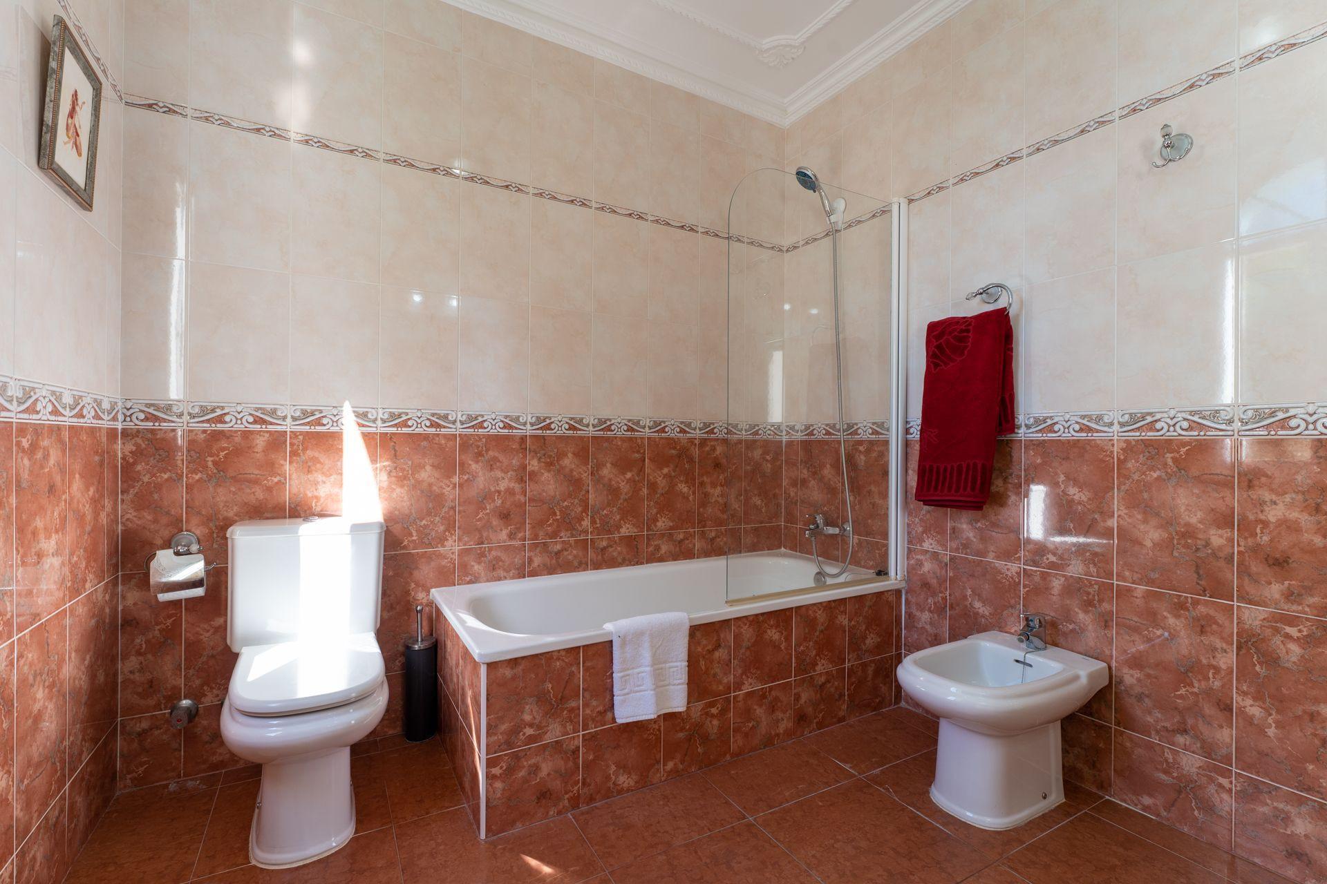 On the first floor is the main dining/living room with sofas, dining table, satellite-TV, and DVD. The second kitchen is semi-independent and well equipped with a dishwasher, microwave, a 4 ringed vitro-hob, oven, and fridge/freezer. There are two twin bedrooms on this floor and a good size bathroom with an over bath shower, WC, a single washbasin, and a bidet.
