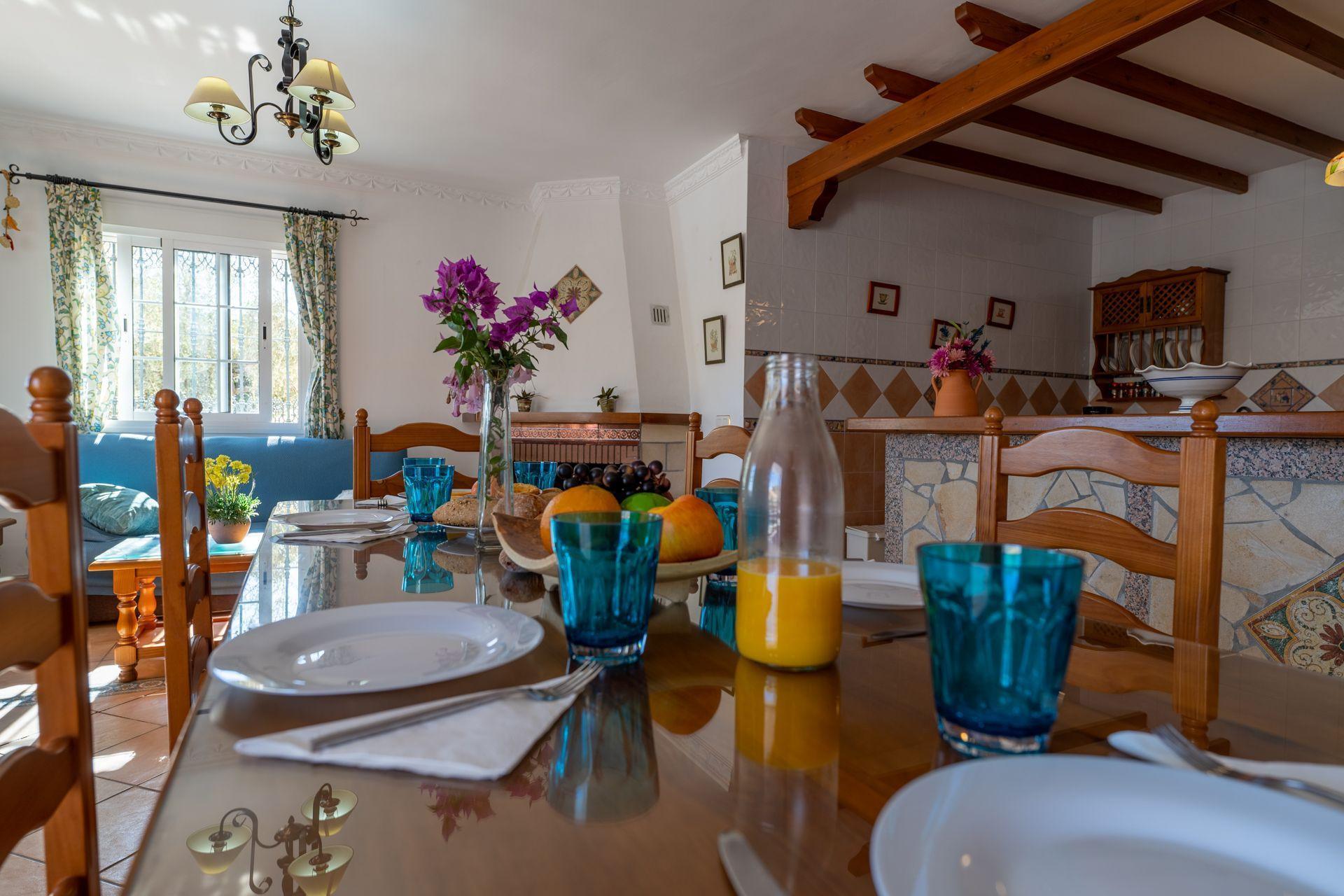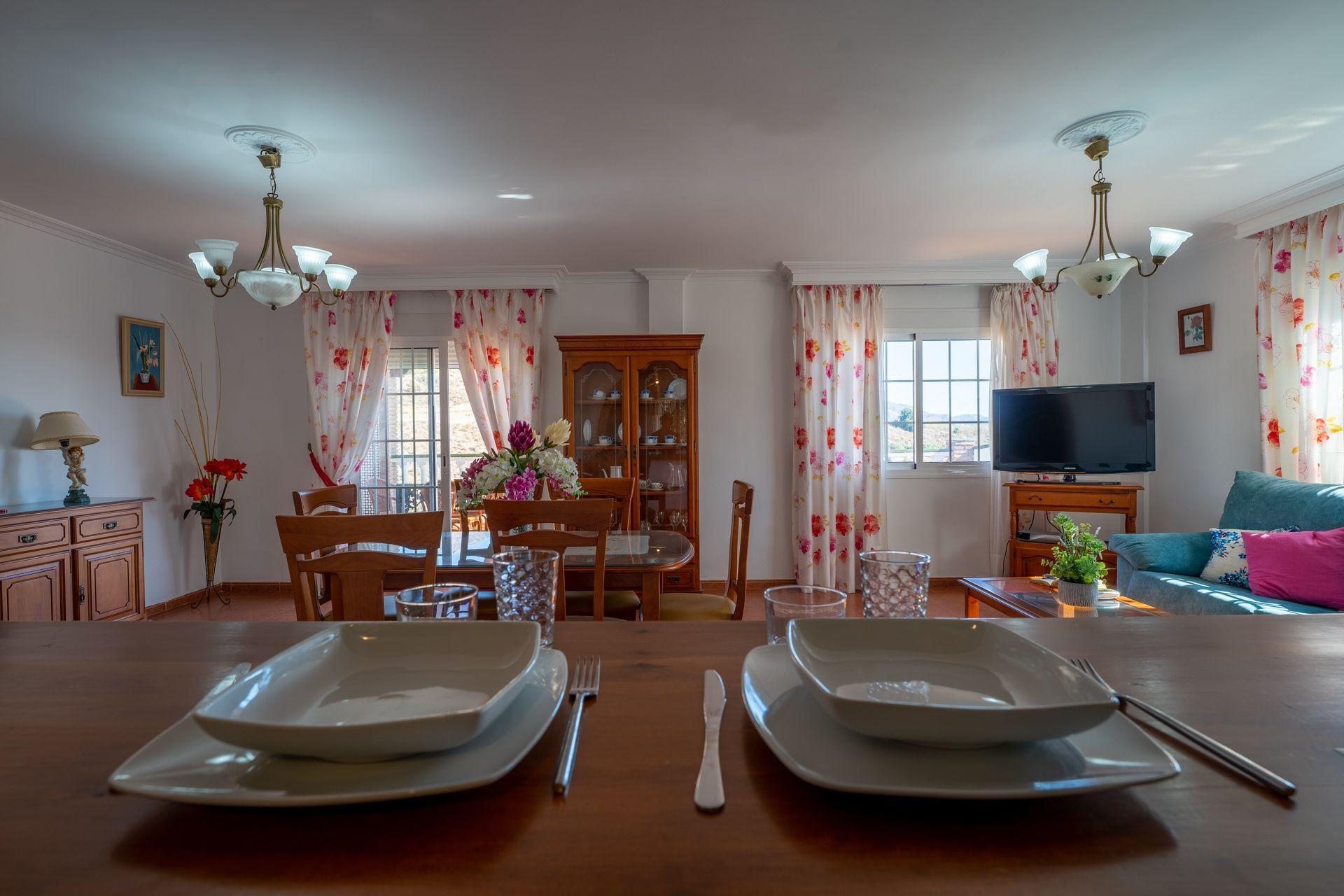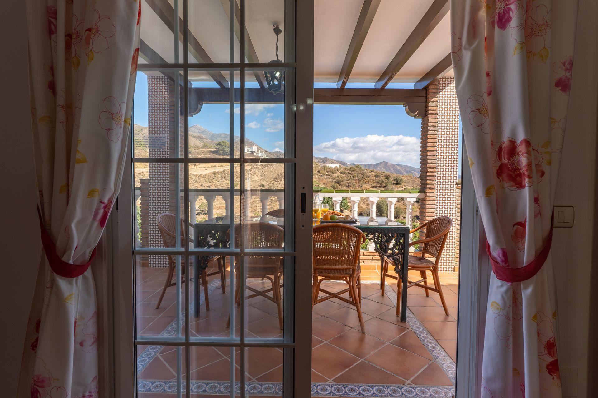 The Exotica area holds the middle between a rural and urban location, enjoying the best of both worlds. From the pool, the villa looks out over the countryside below with avocado, olive and citrus fruit trees. The views to the south are out to Nerja with the Mediterranean behind. All together, a very convenient location at a 5 minute drive from the town centre of Nerja (2,2 km) and the beaches . If you prefer to leave the car at home, then you can easily walk to a supermarket (Lidl) at 800m and to the restaurant of Hotel Almazara at 1,2 km. The access to the villa leads through a lawned garden, from where the villa is accessed on the first floor. The pool (7m x 3m; 1,40m - 1,80m deep) is set on ground floor lower level and surrounded by a spacious terrace with sun and shade, complete with patio furniture, sun loungers and barbecue. On the first floor you will find a covered terrace with panoramic views, ideal for dining al fresco!