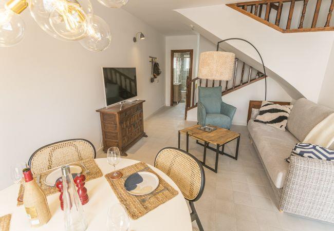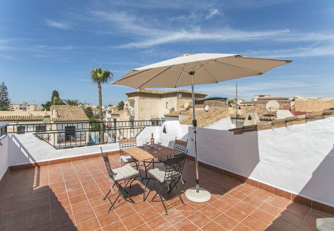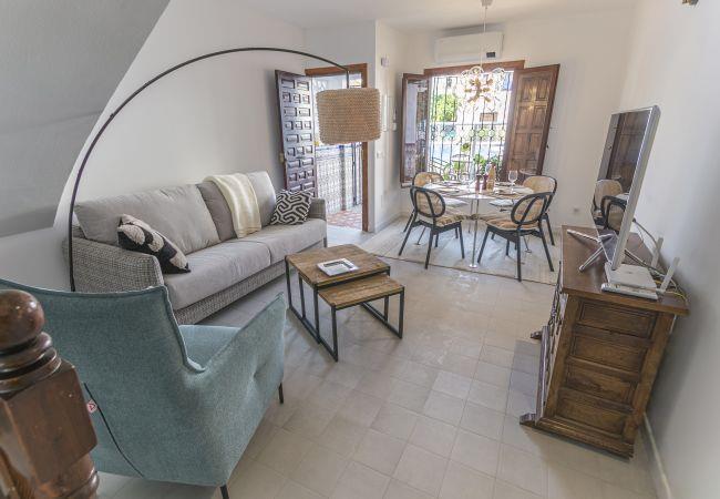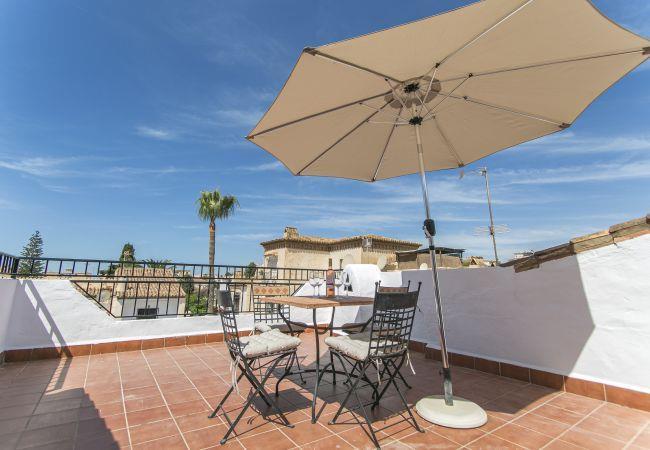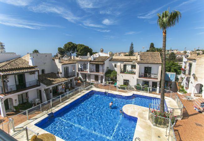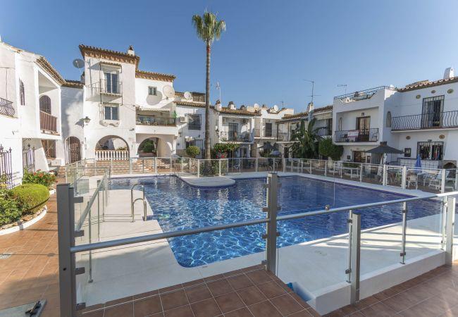 Holiday rental house in Nerja. Excellent recently renovated terraced houses with a swimming pool and just a few metres from the beach. Located in the heart of Nerja within a residential complex with an Andalusian feel. They have 2 bedrooms and a roof terrace to enjoy your holidays and sunbathe, communal swimming pool, air conditioning and free WiFi. They are situated in the exclusive Parador de Nerja area, with walking access to the famous Burriana beach and the Balcón de Europa.