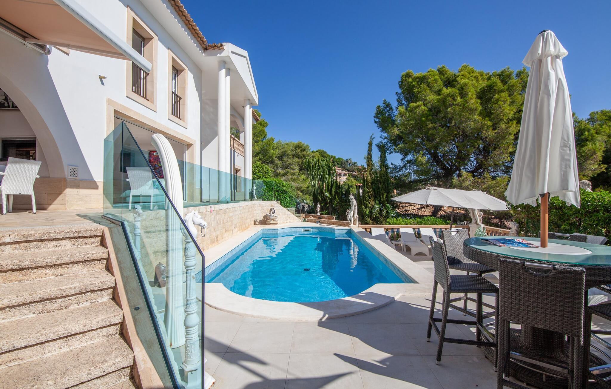 Durch die Lage in den Hügeln von Portal Nous genießen Sie von der Villa „Ocean View“ den perfekten Blick auf das Meer. Gleichzeitig erwarten Sie im abwechslungsreichen Außenbereich zahlreiche Highlights: Ein Pool mit umlaufender Terrasse und Sonnenliegen, eine Außenküche/Bar mit TV und Billardtisch, eine professionelle Grillstation und eine Chillout-Lounge. Auch für die kleinen Gäste bietet der Kinderspielplatz mit Piratenschiff jede Menge Spielmöglichkeiten. Ein überdachter Essbereich am Haus ermöglicht die Einnahme Ihrer Mahlzeiten in familienfreundlicher Atmosphäre. Auch von den Balkonen und Terrassen der Schlafzimmer genießen Sie faszinierende Panoramablicke. Das luxuriöse Ferienhaus liegt eingebettet in die mediterrane grüne Hügelkulisse und thront eindrucksvoll über dem Meer.