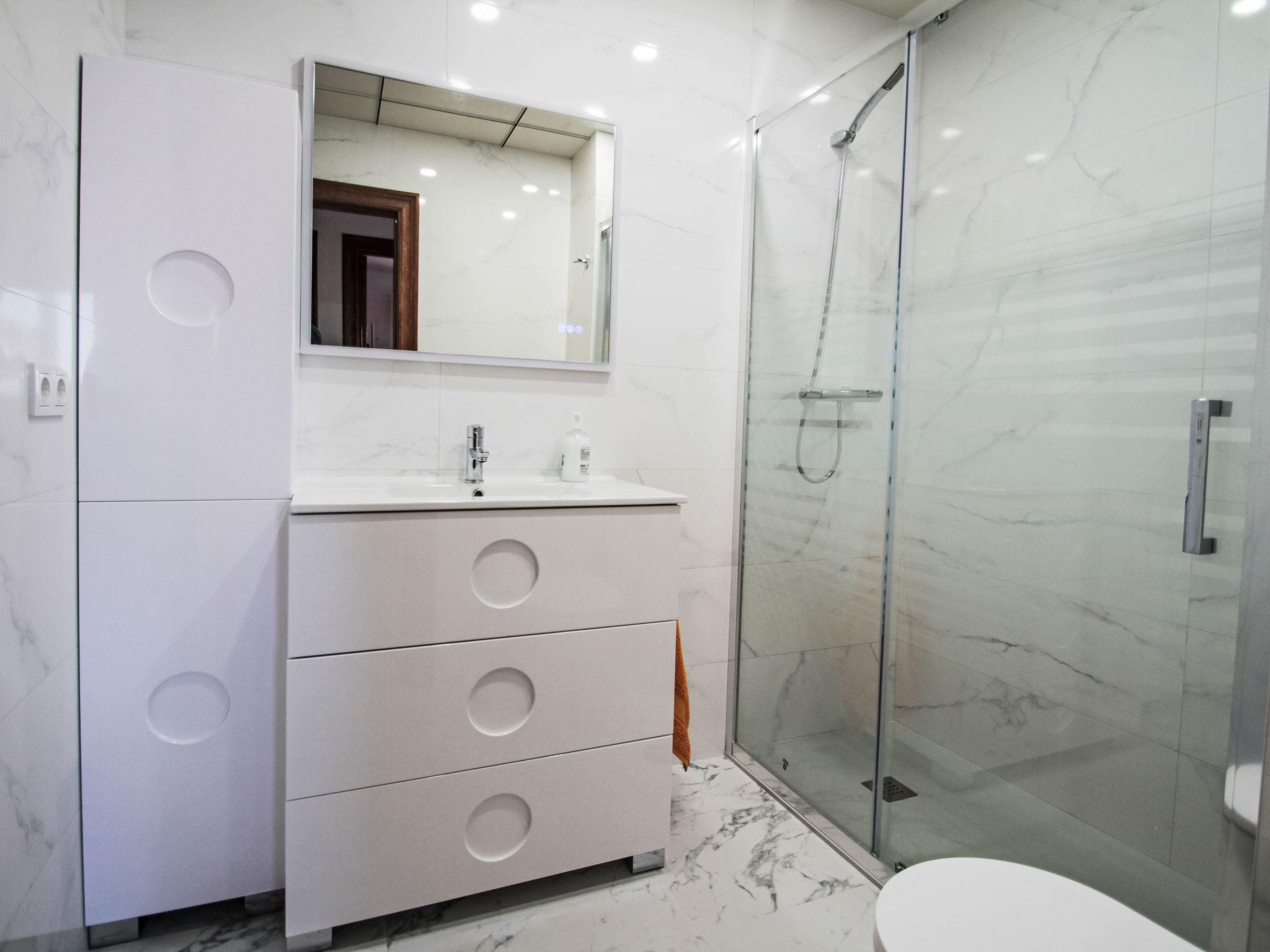 3-room apartment 67 m2. Bright, comfortable furnishings: living/dining room with dining table, international TV channels, flat screen, radio, hi-fi system, air conditioning and forced-air heating. Exit to the terrace. 1 room with 1 french bed (150 cm, length 190 cm), electric heating and fan. 1 room with 1 pull-out bed (2 x 90 cm, length 190 cm), fan. Kitchen (oven, dishwasher, 4 ceramic glass hob hotplates, toaster, microwave, freezer, electric coffee machine). Shower/bidet/WC. Electric heating. Terrace. Terrace furniture. Very beautiful view of the sea. Facilities: washing machine, dryer, iron, hair dryer. Internet (WiFi, free). Parking. Please note: suitable for families. Non-smokers only. Private entrance, smoke alarm. VT-467042-A // Reg. Nr.: ESFCTU00000304800056809700000000000000000VT-467042-A4