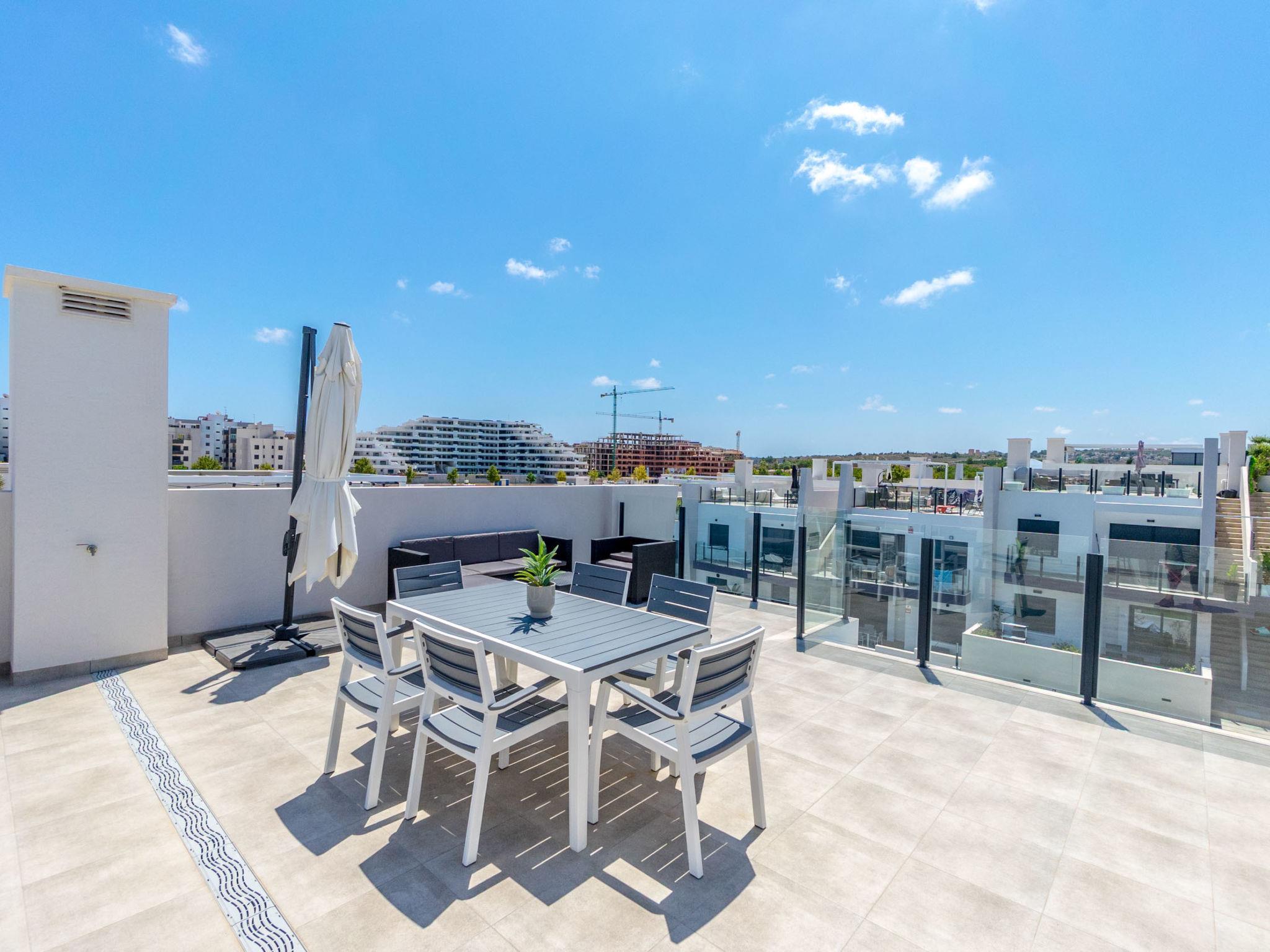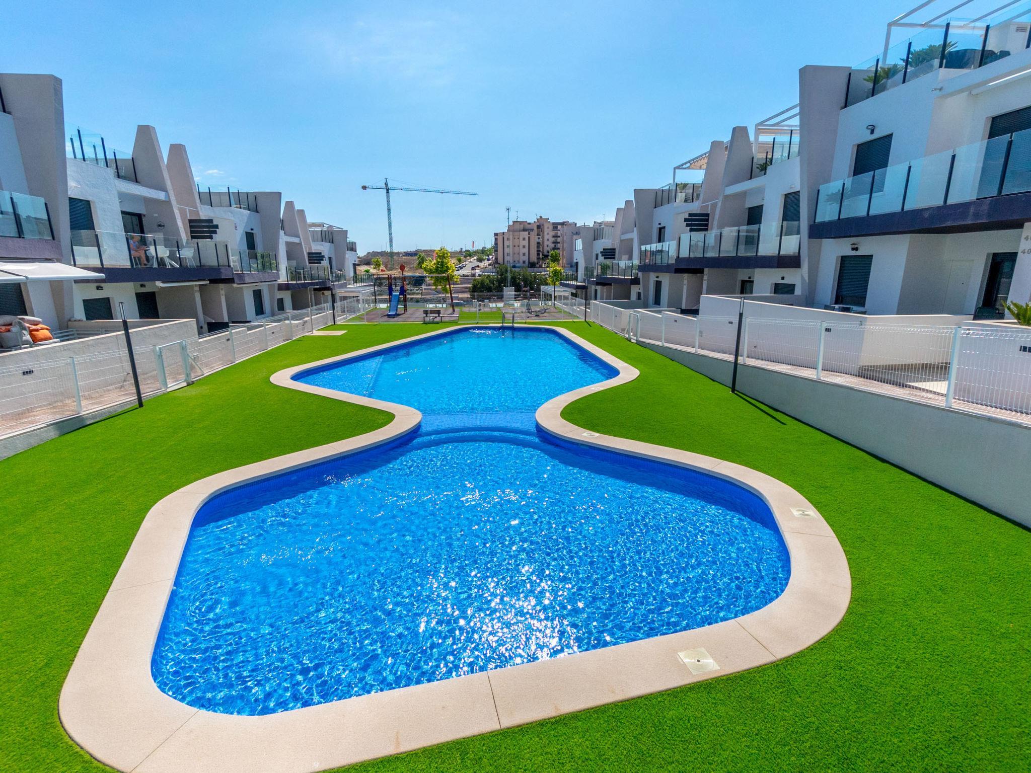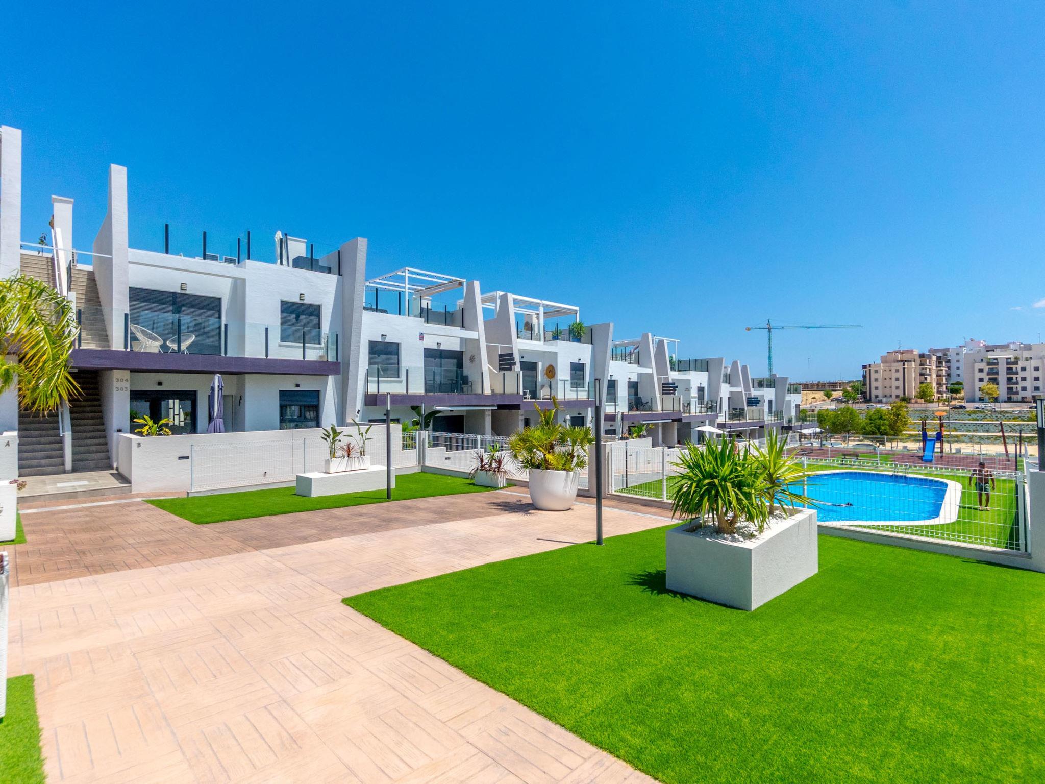 Modern, beautiful apartment block "Residencial Saoco", 2 storeys. 1.5 km from the centre of San Miguel de Salinas, 11 km from the centre of La Zenia, in a quiet, sunny position, traffic calmed area, 11 km from the sea, 11 km from the beach. For shared use: property (fenced), swimming pool (seasonal availability: 01.Jan. - 31.Dec.). Children's pool, outdoor shower, children's playground (slide, swing). In the house: roof terrace. Grocery 1.7 km, supermarket 1.7 km, restaurant 2 km, bus stop 1.9 km, sandy beach "Playa de La Zenia" 11 km. Golf course (18 hole) 9 km.