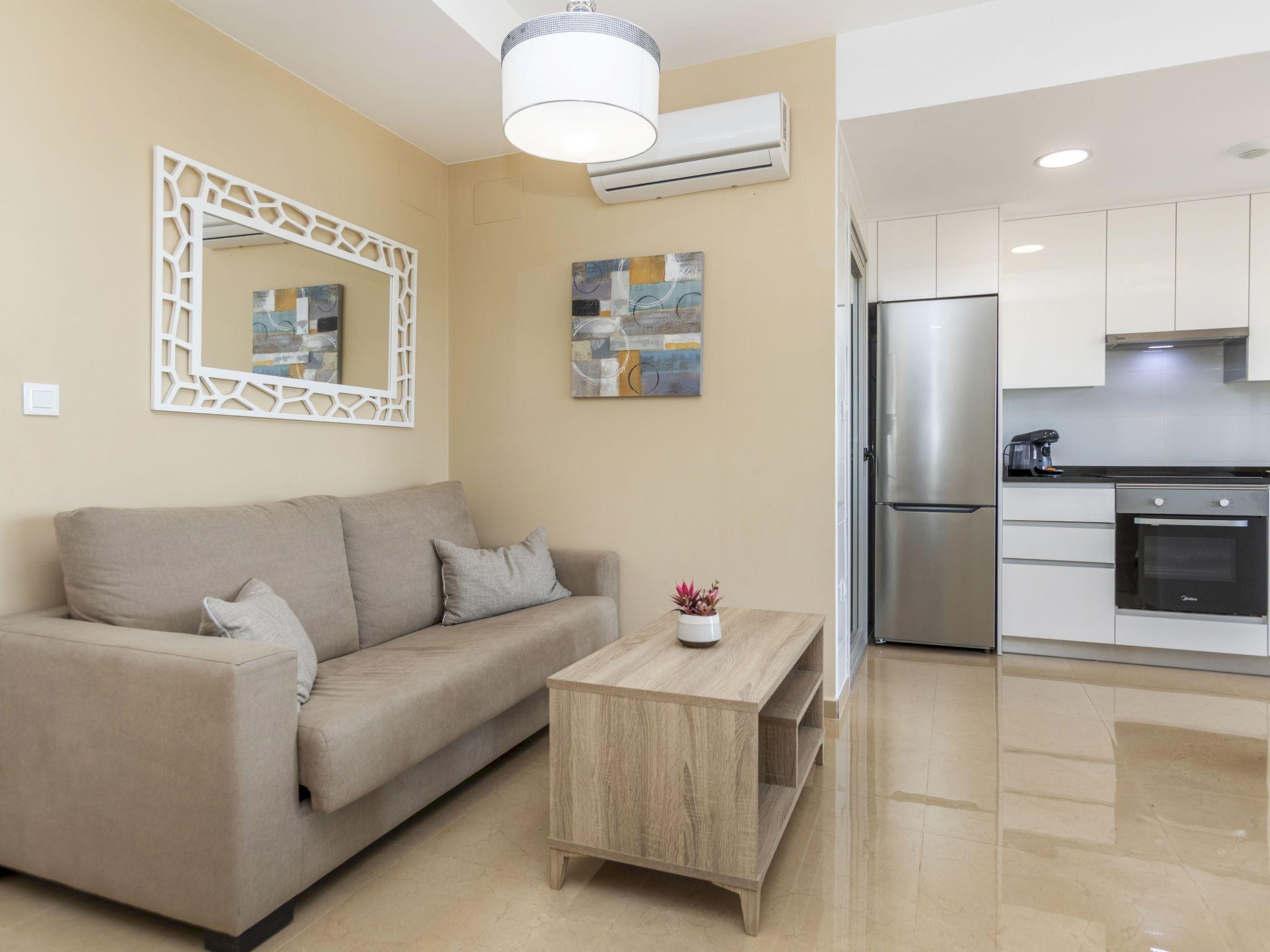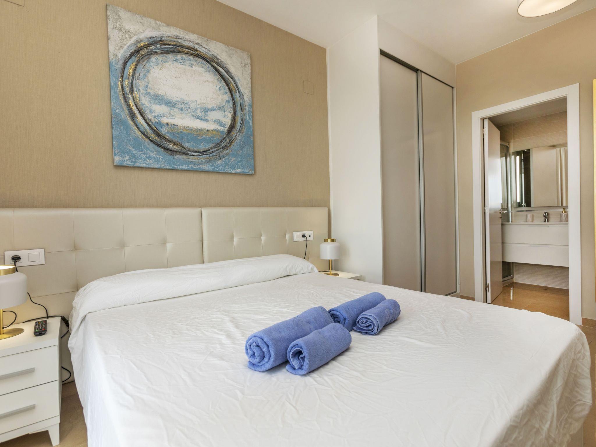 "Ciudad Jardin II", 3-room apartment 80 m2 on 7th floor. Practical and comfortable furnishings: living/dining room with dining table, digital TV, air conditioning and forced-air heating. Exit to the terrace. 1 room with 1 french bed (150 cm, length 200 cm), shower/bidet/WC. 1 room with 2 beds (90 cm, length 200 cm). Kitchen (oven, dishwasher, 3 induction hot plates, toaster, kettle, microwave, freezer, electric coffee machine, Capsules for coffee machine (Nesspresso) extra). Shower/bidet/WC. Large terrace 19 m2. Terrace furniture. Side view of the sea and the resort. Facilities: washing machine, iron, hair dryer. Internet (WiFi, free). Parking space n 309 (roofed) at the house. Please note: non-smokers only. A tener en cuenta : obras alrededor del edificio. R000000001