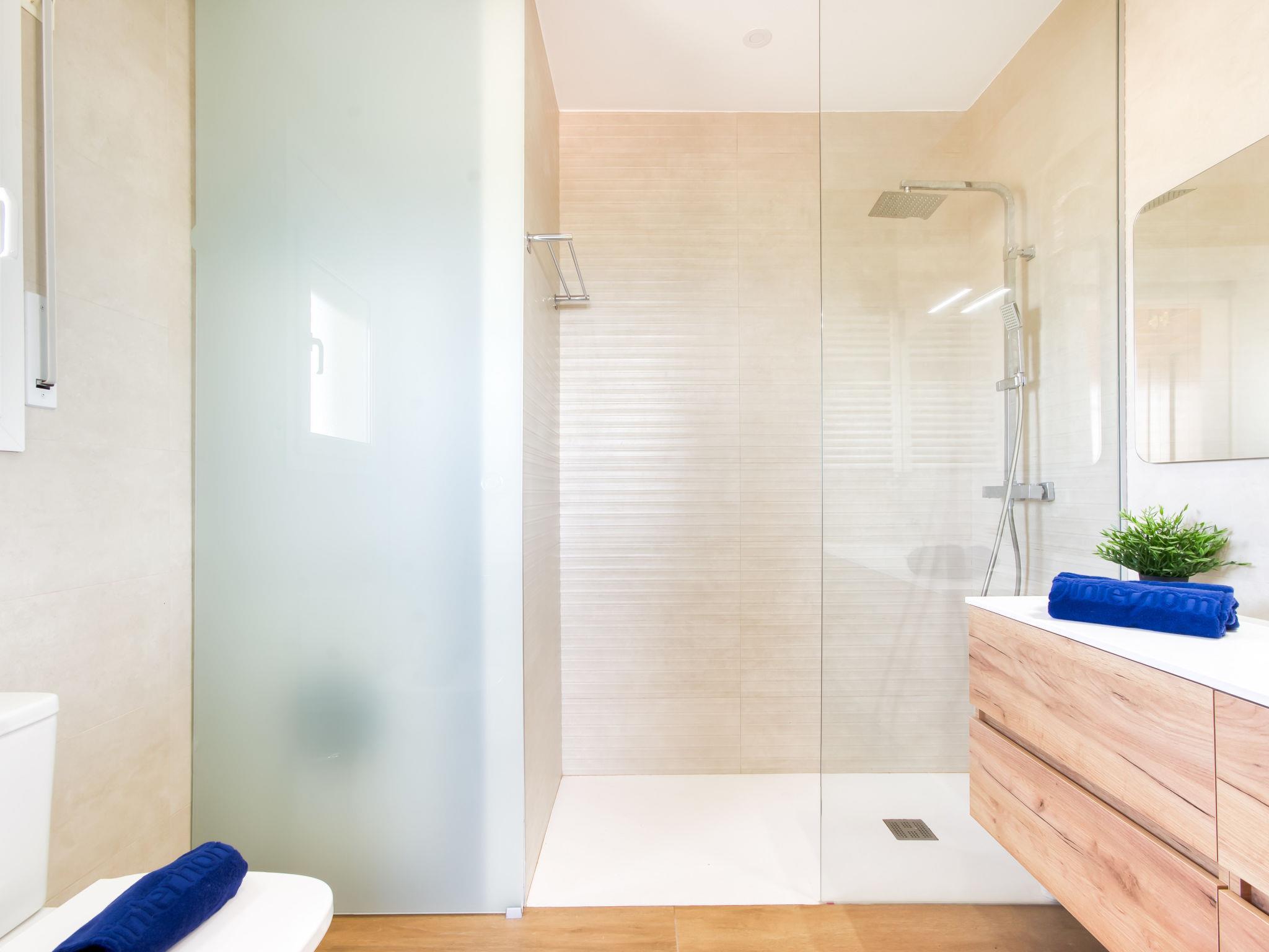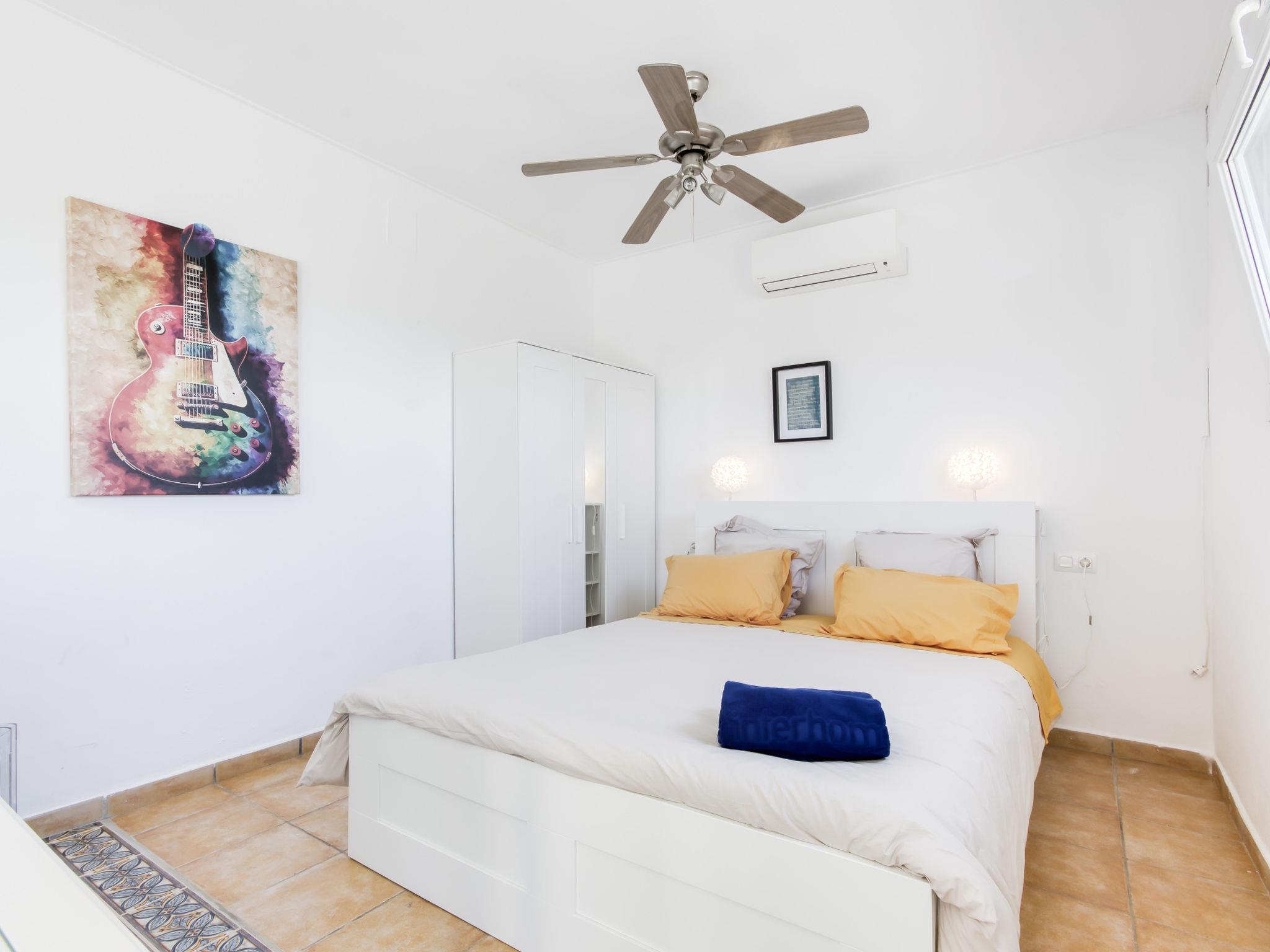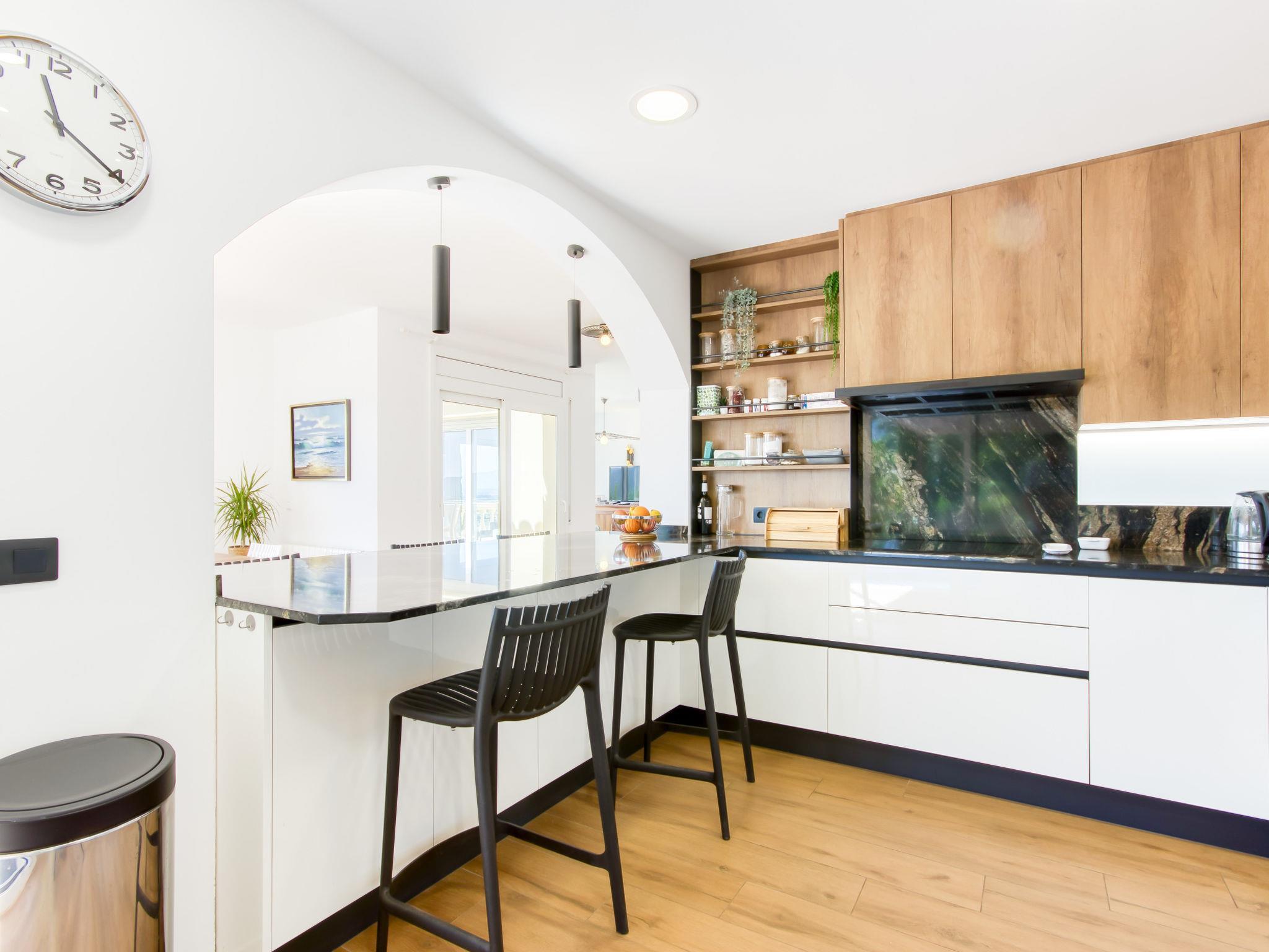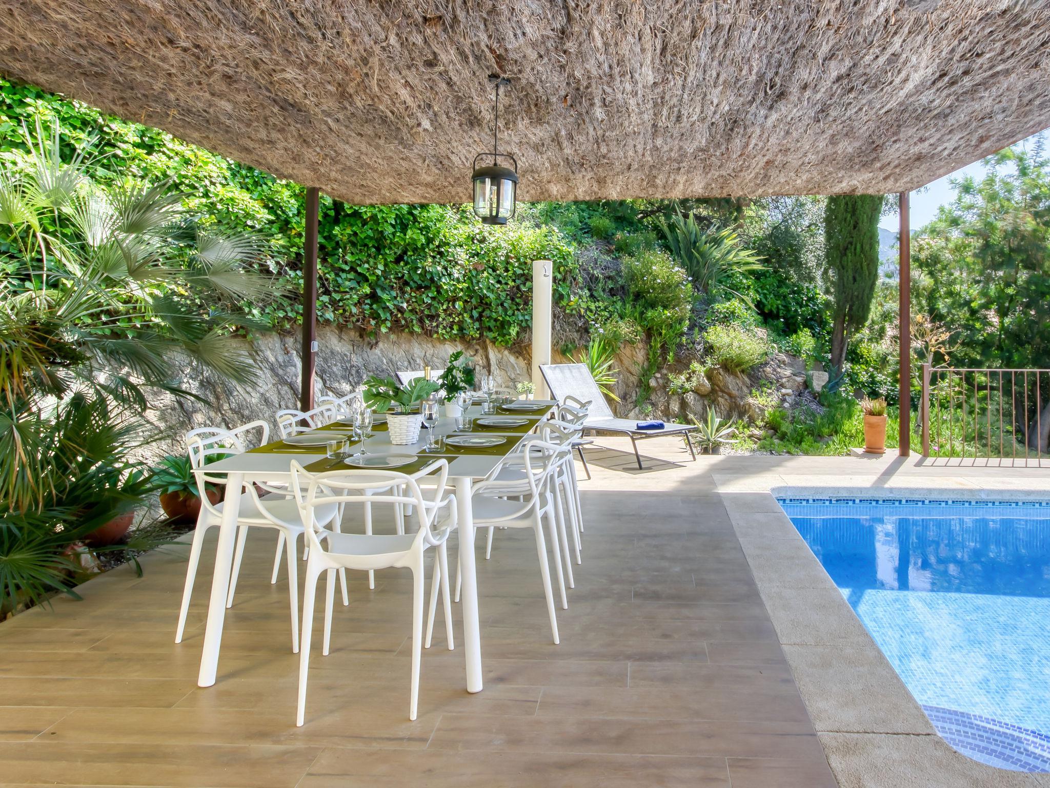 6-room villa 318 m2 on 4 levels. Spacious and bright, modern and stylish furnishings: living/dining room with dining table, satellite TV and digital TV (flat screen). Exit to the terrace, to the swimming pool. Large, open kitchen (oven, dishwasher, 3 induction hot plates, toaster, kettle, microwave, freezer, electric coffee machine). Sep. WC. On the lower ground floor: (exterior staircase) living/dining room with fan. Exit to the terrace. 1 room with 1 french bed (160 cm, length 190 cm), air conditioning, fan and forced-air heating. 1 room with 2 beds (90 cm, length 190 cm), fan. Kitchenette (kettle, microwave). Shower, sep. WC. Upper floor: 1 room with 2 beds (90 cm, length 190 cm), air conditioning, fan and forced-air heating. 1 room with 1 french bed (160 cm, length 190 cm), air conditioning, fan and forced-air heating. Bath/shower/WC. 2nd upper floor: 1 large room with 1 french bed (180 cm, length 190 cm), shower/WC, air conditioning, fan and forced-air heating. Exit to the terrace. Large terrace. Terrace furniture, barbecue, deck chairs. Marvellous panoramic view of the sea and the mountains. Facilities: washing machine, iron, hair dryer. Internet (WiFi, free). Parking at the house. Please note: non-smoking house. TV only FR, DE, ES. No lift. The rooms on the lower floor belong to a separate apartment. HUTG-010952 // Reg. Nr.: ESFCTU00001700800055768500000000000000000HUTG-0109528