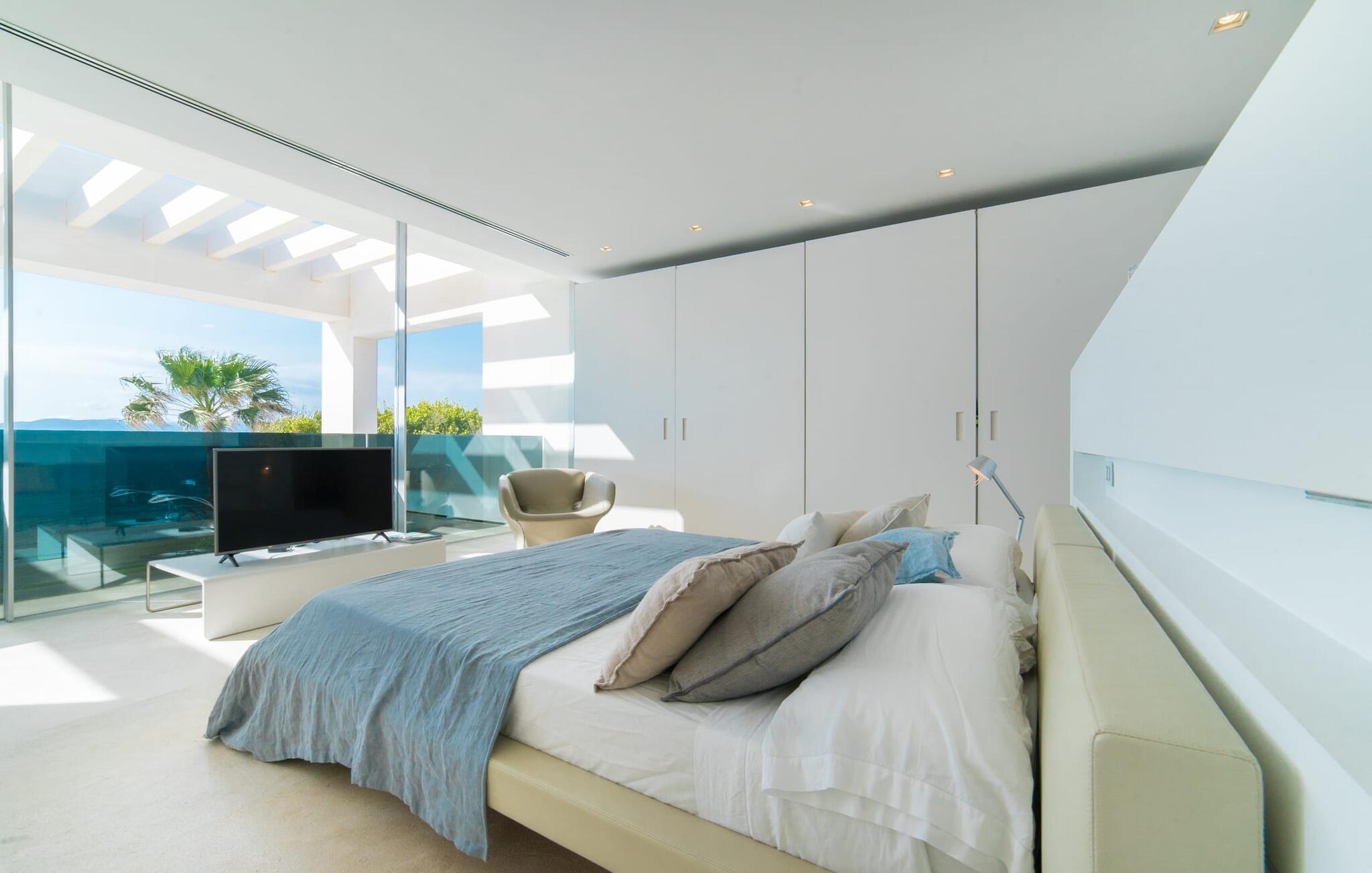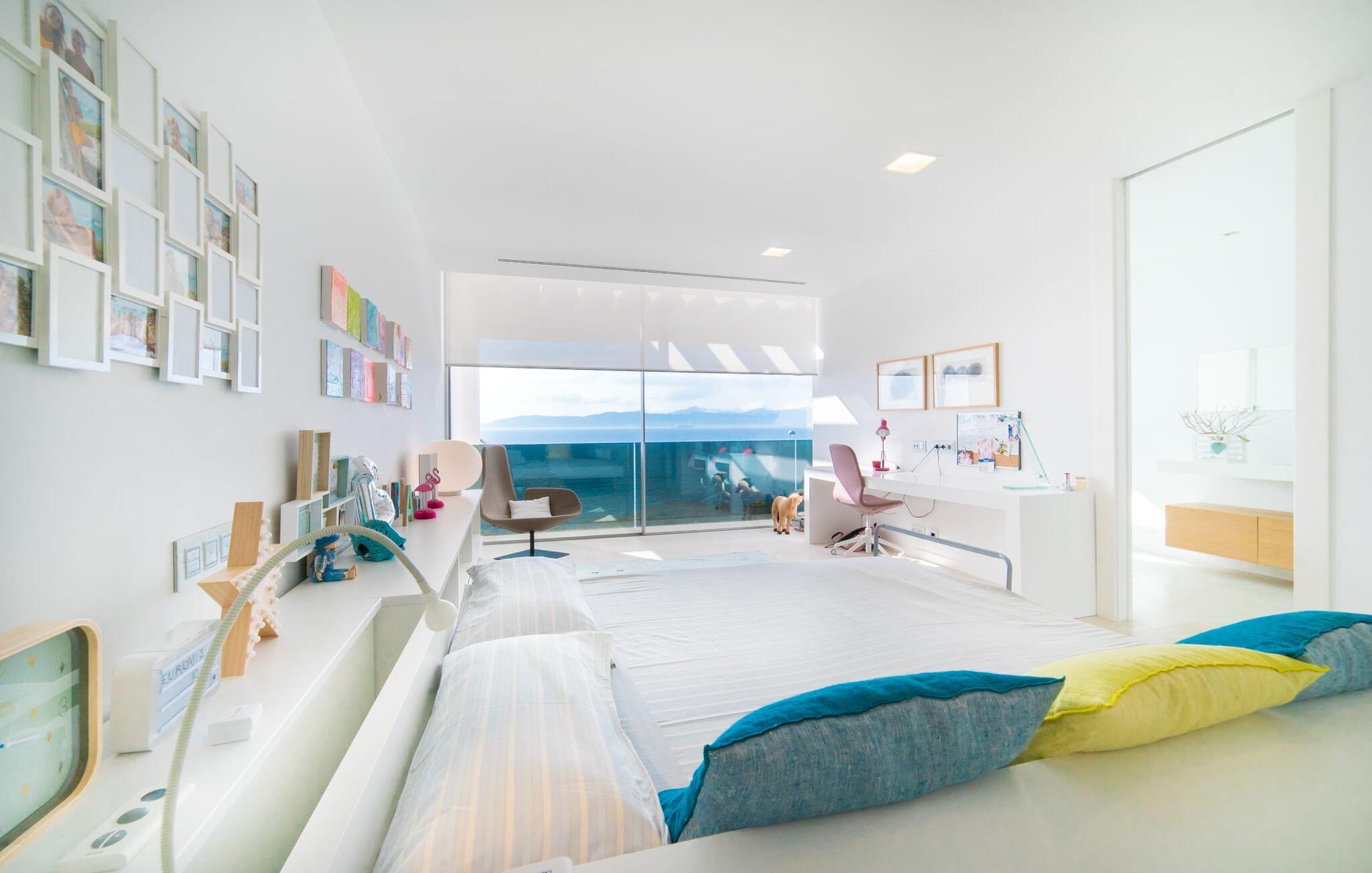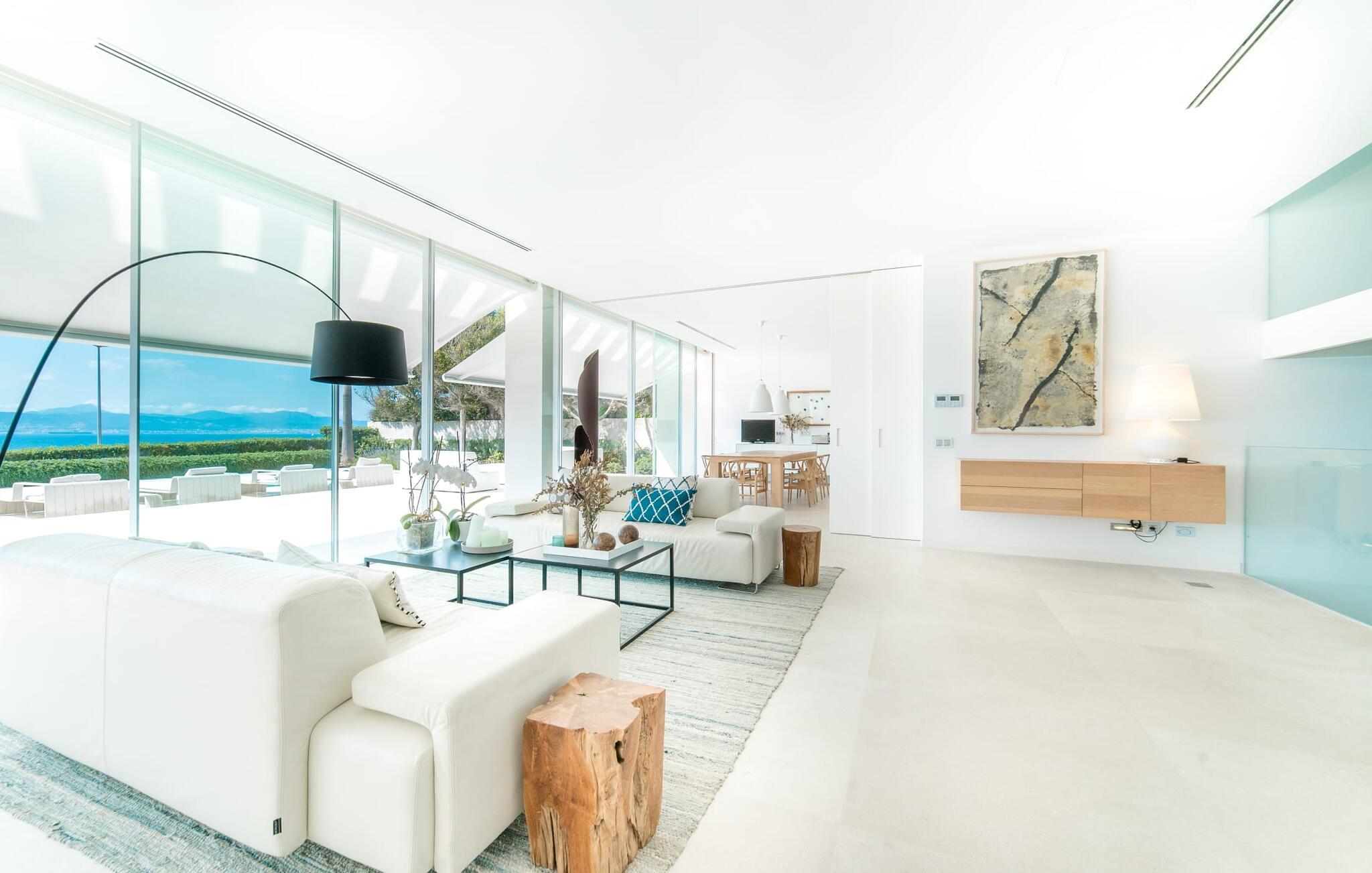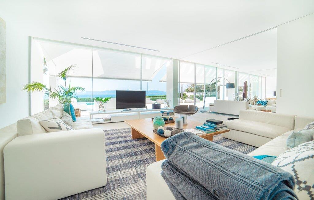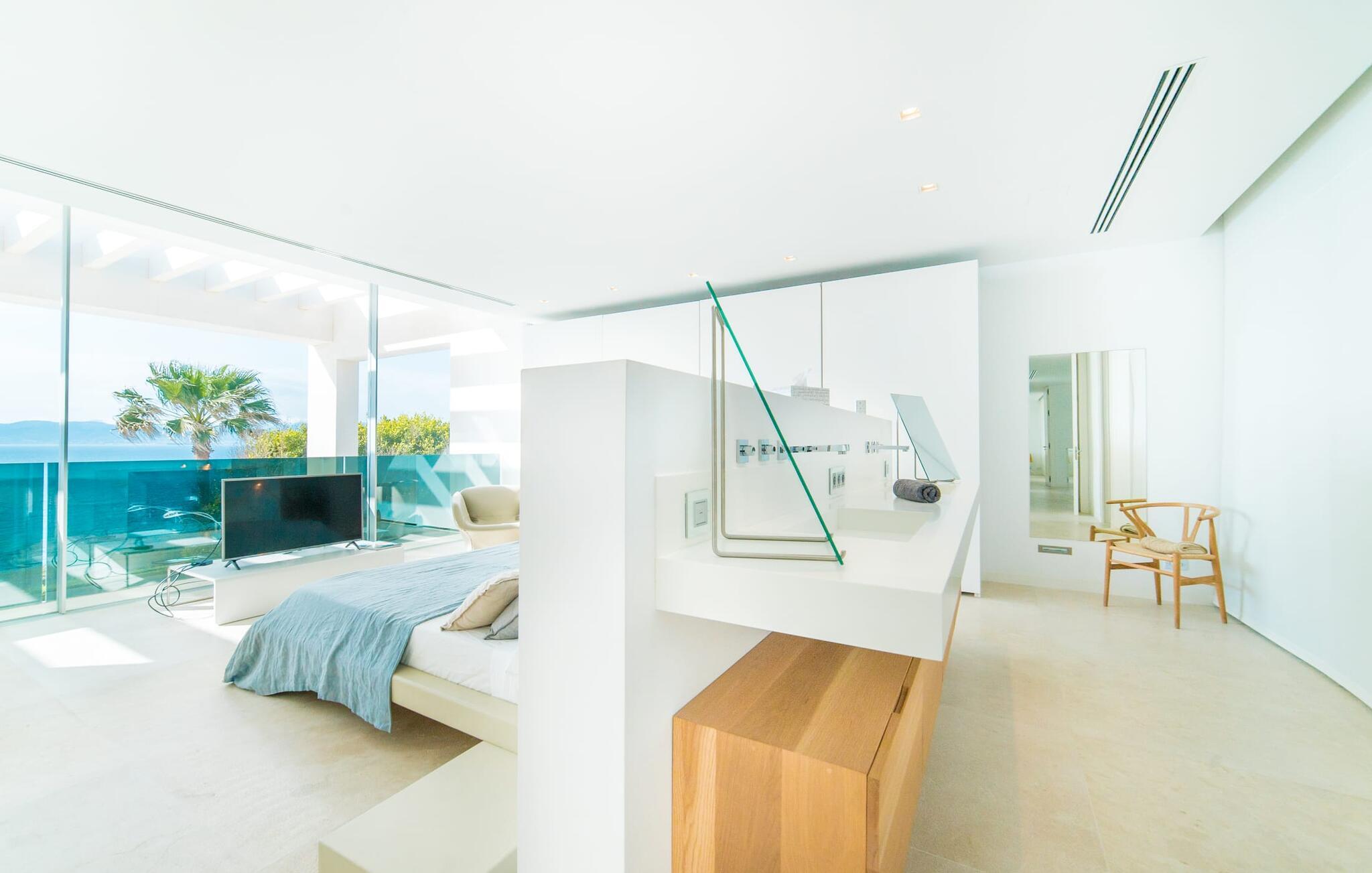 Im lichtdurchfluteten Wohnbereich der 500 m² großen Villa erwartet Sie ein helles, offenes Wohnkonzept: Mit der großen Panorama-Glasfront wurde ein nahezu nahtloser Übergang zur Terrasse geschaffen. Entspannen Sie sich auf gemütlichen Lounge-Sofas und erleben Sie die spektakulären Sonnenuntergänge über dem westlichen Mittelmeer. Selbstverständlich ist das gesamte Haus voll klimatisiert, sodass Sie auch bei heißen Temperaturen nicht ins Schwitzen kommen. Ein großer Esstisch aus Holz bildet den Übergang zur hochmodernen, voll ausgestatteten Küche mit praktischer Kochinsel. Im Erdgeschoss Ihres Ferienhauses befindet sich außerdem ein Gäste-WC. Im Obergeschoss befinden sich drei einladende Schlafzimmer mit luxuriös ausgestatteten En-Suite-Badezimmern. Eines der Zimmer verfügt über einen begehbaren Kleiderschrank. Von den Zimmern auf dieser Etage genießen Sie einen tollen Blick auf das offene Meer und den weiten Horizont. Ein weiterer Wohn- und Schlafbereich mit eigenem Bad sowie ein Spielzimmer für die kleinen Gäste befinden sich im Untergeschoss des Hauses. In der privaten Tiefgarage können Sie Ihre Autos sicher und sonnengeschützt abstellen.