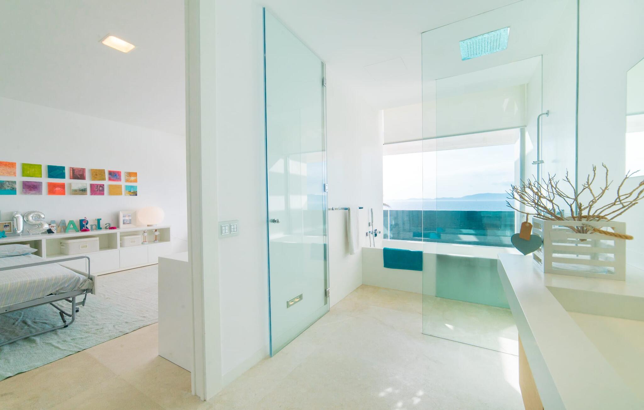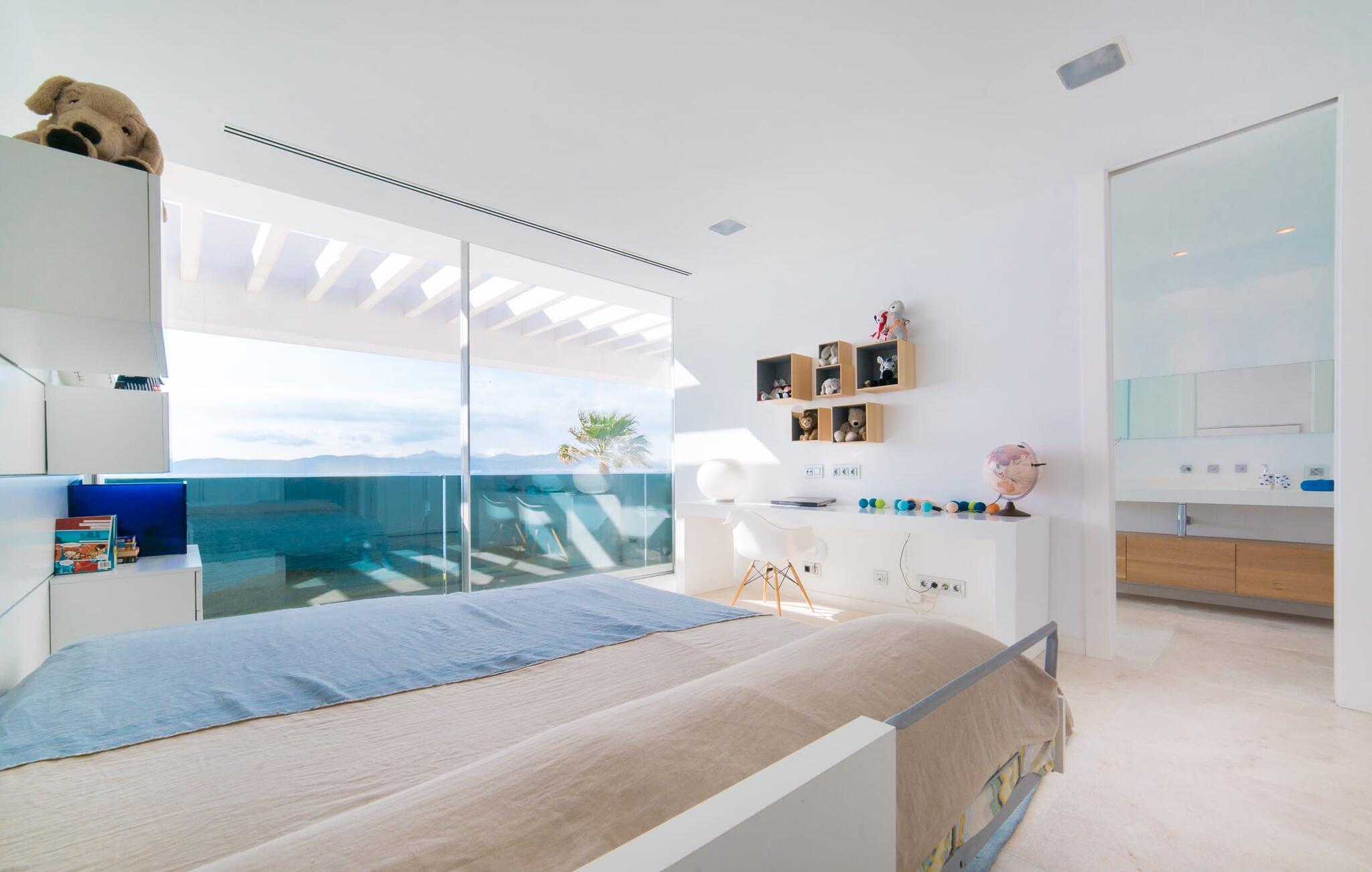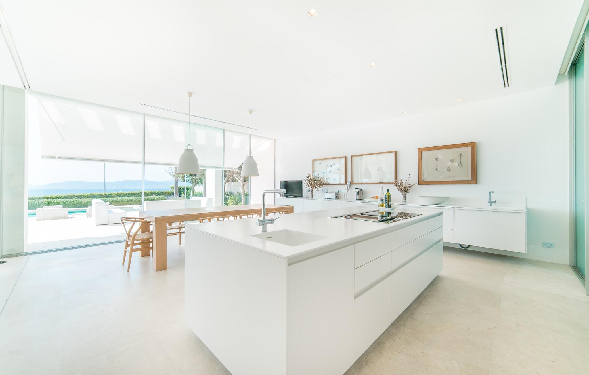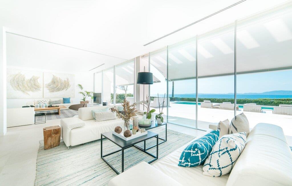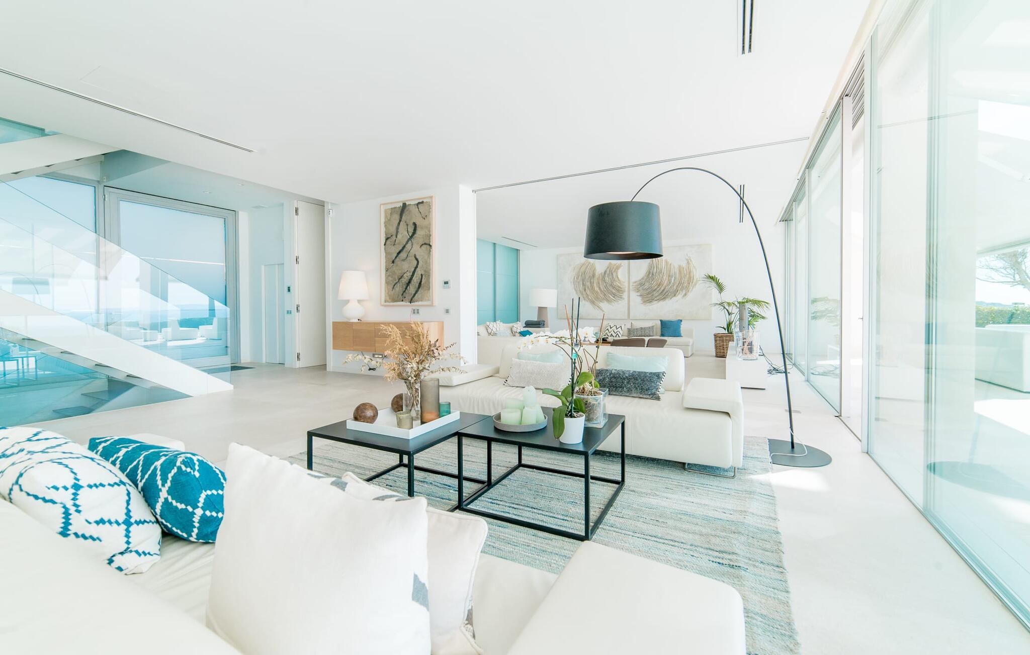 Im lichtdurchfluteten Wohnbereich der 500 m² großen Villa erwartet Sie ein helles, offenes Wohnkonzept: Mit der großen Panorama-Glasfront wurde ein nahezu nahtloser Übergang zur Terrasse geschaffen. Entspannen Sie sich auf gemütlichen Lounge-Sofas und erleben Sie die spektakulären Sonnenuntergänge über dem westlichen Mittelmeer. Selbstverständlich ist das gesamte Haus voll klimatisiert, sodass Sie auch bei heißen Temperaturen nicht ins Schwitzen kommen. Ein großer Esstisch aus Holz bildet den Übergang zur hochmodernen, voll ausgestatteten Küche mit praktischer Kochinsel. Im Erdgeschoss Ihres Ferienhauses befindet sich außerdem ein Gäste-WC. Im Obergeschoss befinden sich drei einladende Schlafzimmer mit luxuriös ausgestatteten En-Suite-Badezimmern. Eines der Zimmer verfügt über einen begehbaren Kleiderschrank. Von den Zimmern auf dieser Etage genießen Sie einen tollen Blick auf das offene Meer und den weiten Horizont. Ein weiterer Wohn- und Schlafbereich mit eigenem Bad sowie ein Spielzimmer für die kleinen Gäste befinden sich im Untergeschoss des Hauses. In der privaten Tiefgarage können Sie Ihre Autos sicher und sonnengeschützt abstellen.