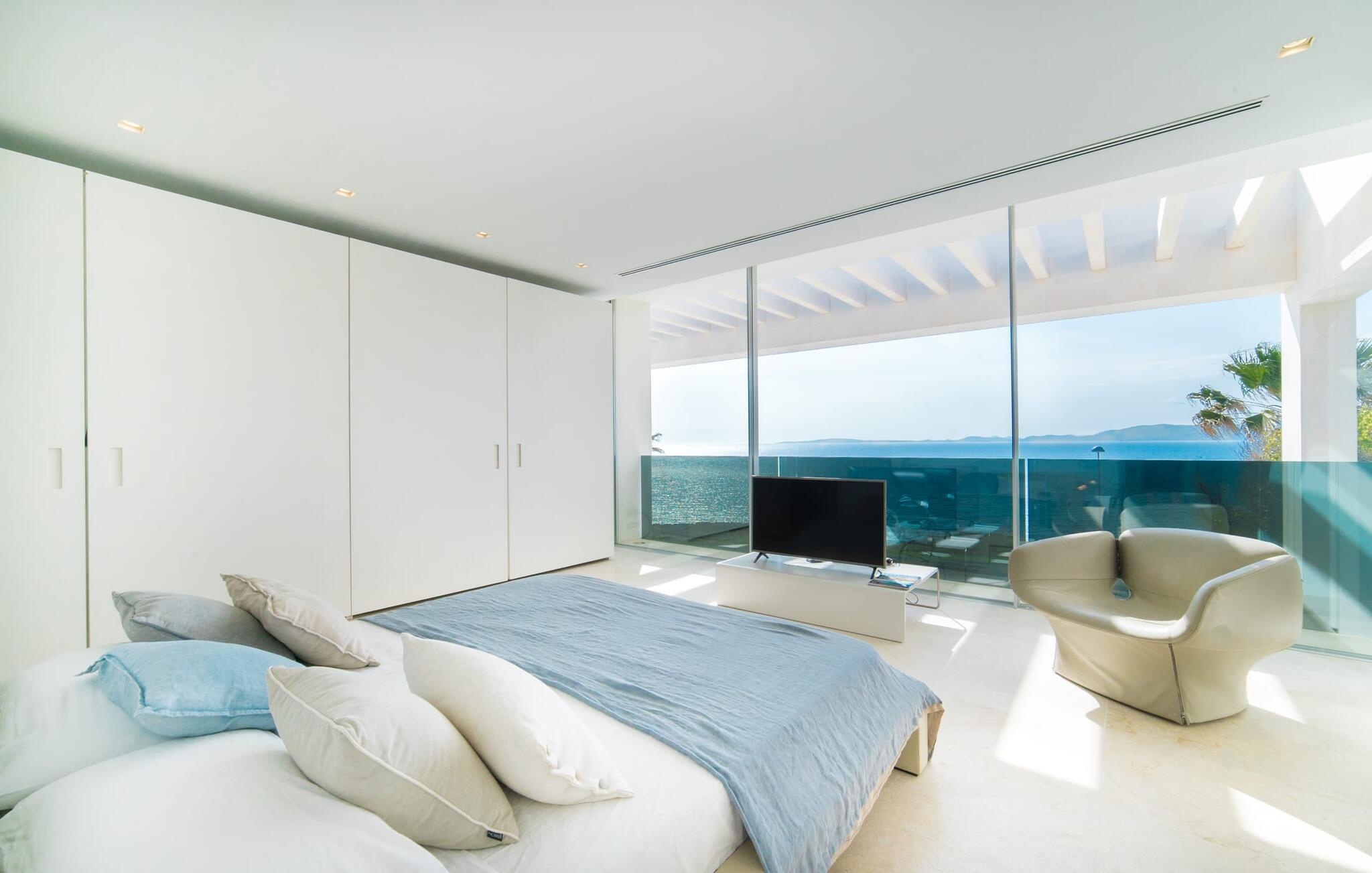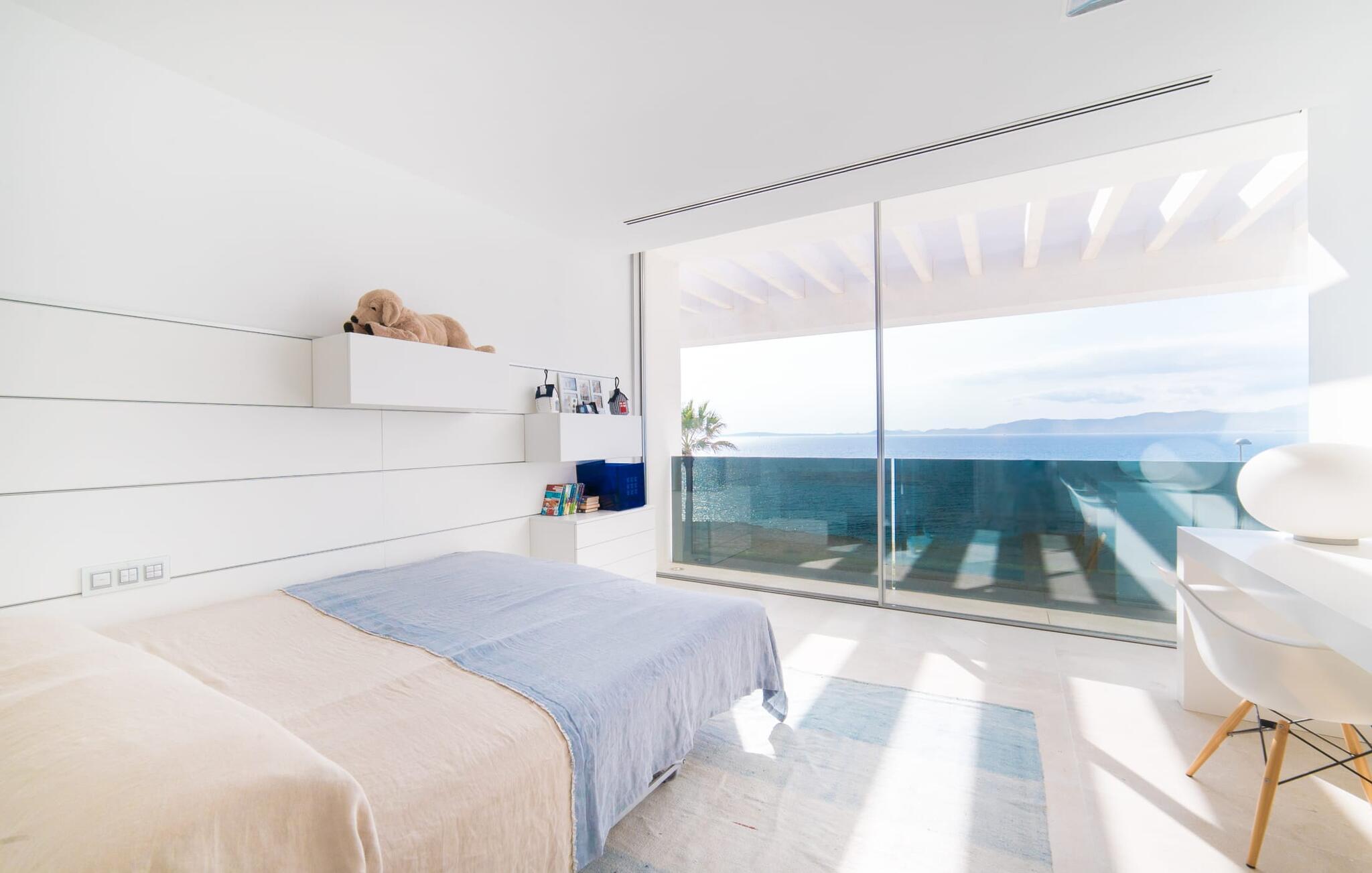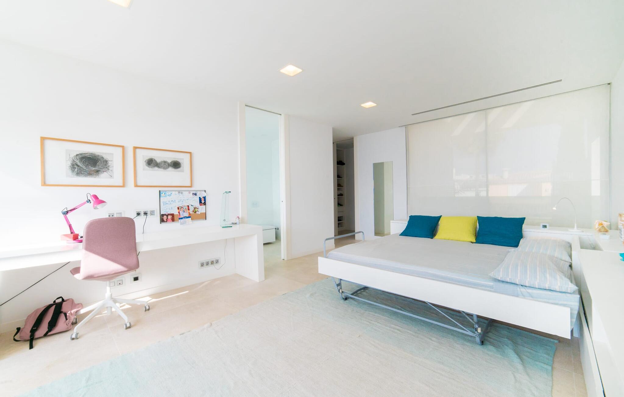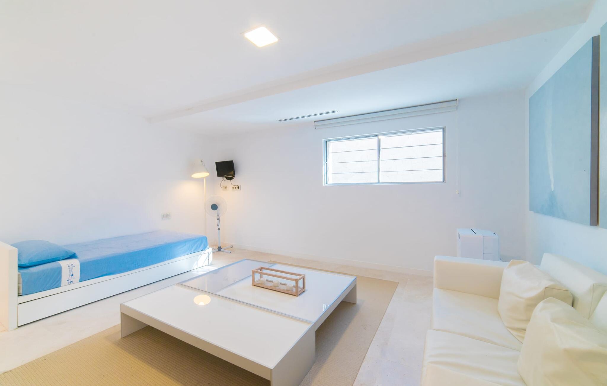 Im lichtdurchfluteten Wohnbereich der 500 m² großen Villa erwartet Sie ein helles, offenes Wohnkonzept: Mit der großen Panorama-Glasfront wurde ein nahezu nahtloser Übergang zur Terrasse geschaffen. Entspannen Sie sich auf gemütlichen Lounge-Sofas und erleben Sie die spektakulären Sonnenuntergänge über dem westlichen Mittelmeer. Selbstverständlich ist das gesamte Haus voll klimatisiert, sodass Sie auch bei heißen Temperaturen nicht ins Schwitzen kommen. Ein großer Esstisch aus Holz bildet den Übergang zur hochmodernen, voll ausgestatteten Küche mit praktischer Kochinsel. Im Erdgeschoss Ihres Ferienhauses befindet sich außerdem ein Gäste-WC. Im Obergeschoss befinden sich drei einladende Schlafzimmer mit luxuriös ausgestatteten En-Suite-Badezimmern. Eines der Zimmer verfügt über einen begehbaren Kleiderschrank. Von den Zimmern auf dieser Etage genießen Sie einen tollen Blick auf das offene Meer und den weiten Horizont. Ein weiterer Wohn- und Schlafbereich mit eigenem Bad sowie ein Spielzimmer für die kleinen Gäste befinden sich im Untergeschoss des Hauses. In der privaten Tiefgarage können Sie Ihre Autos sicher und sonnengeschützt abstellen.