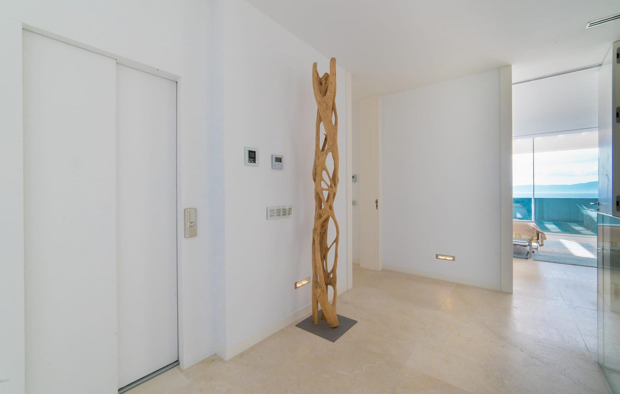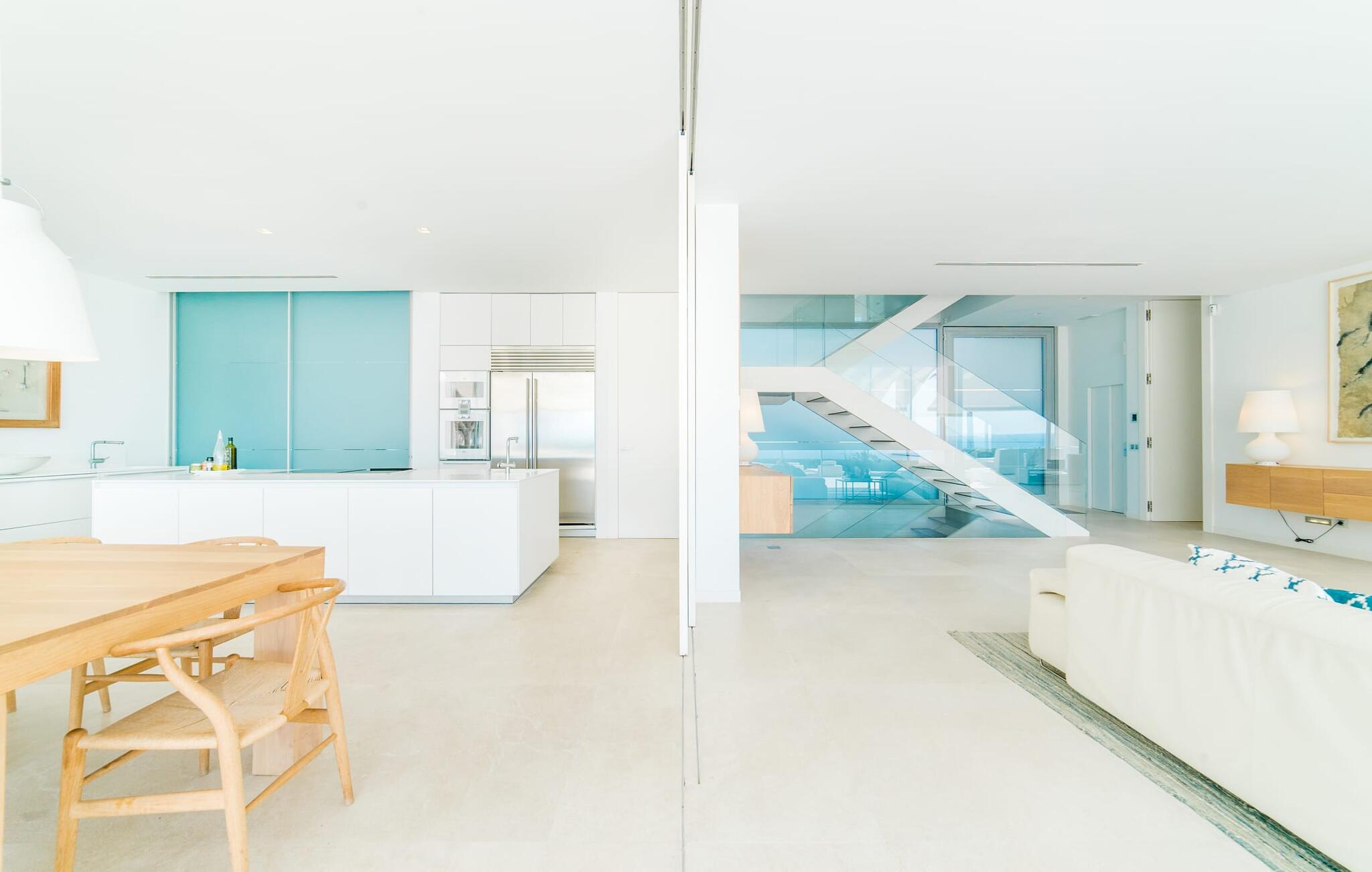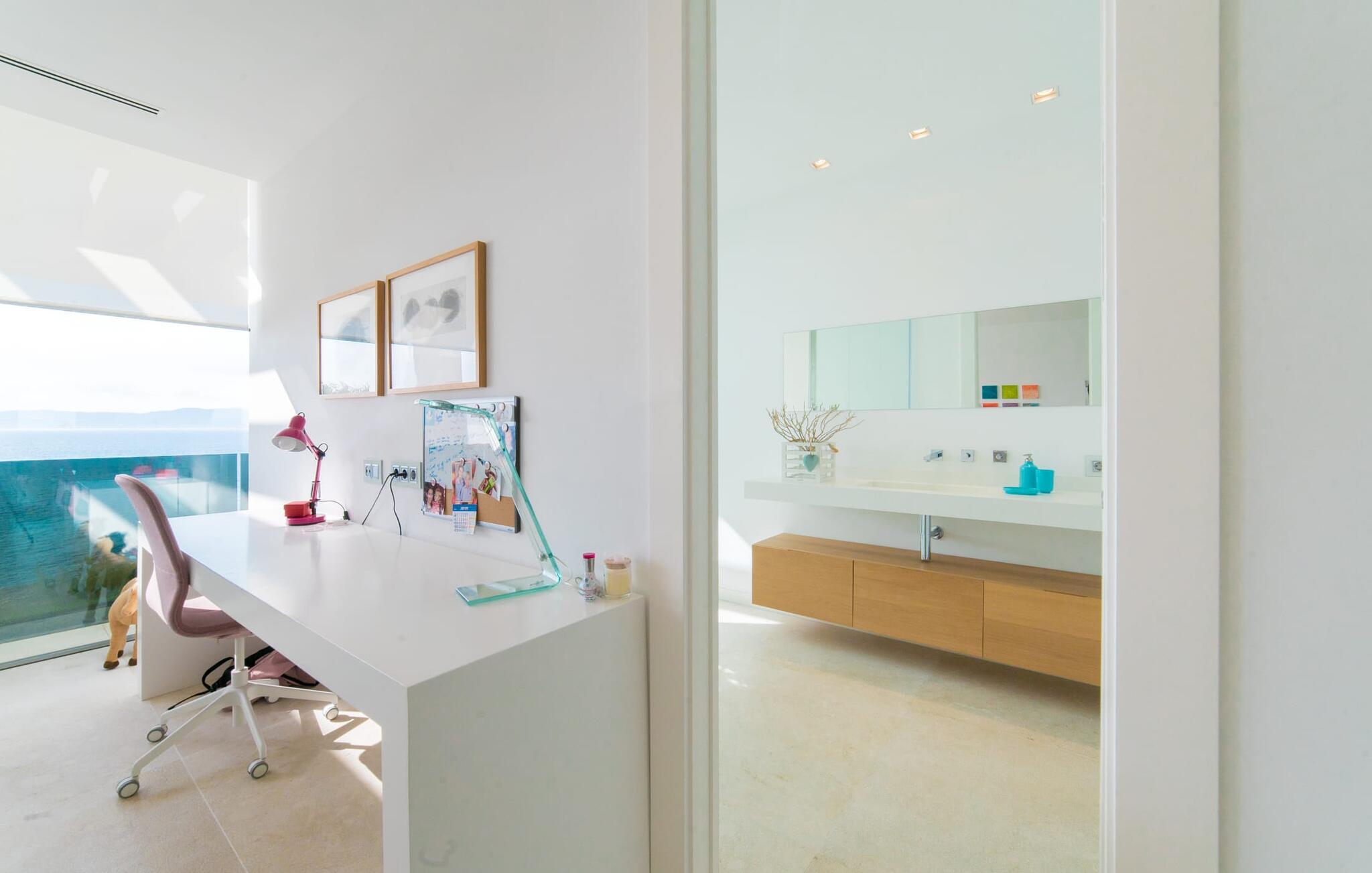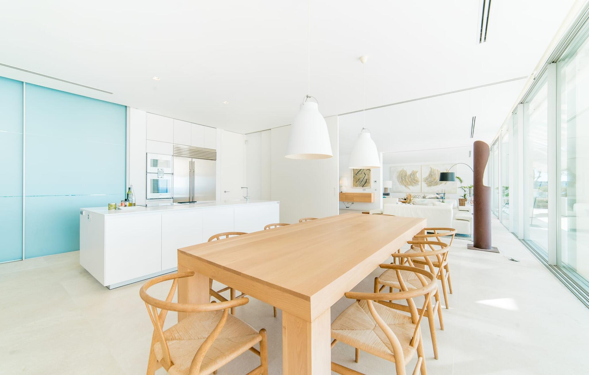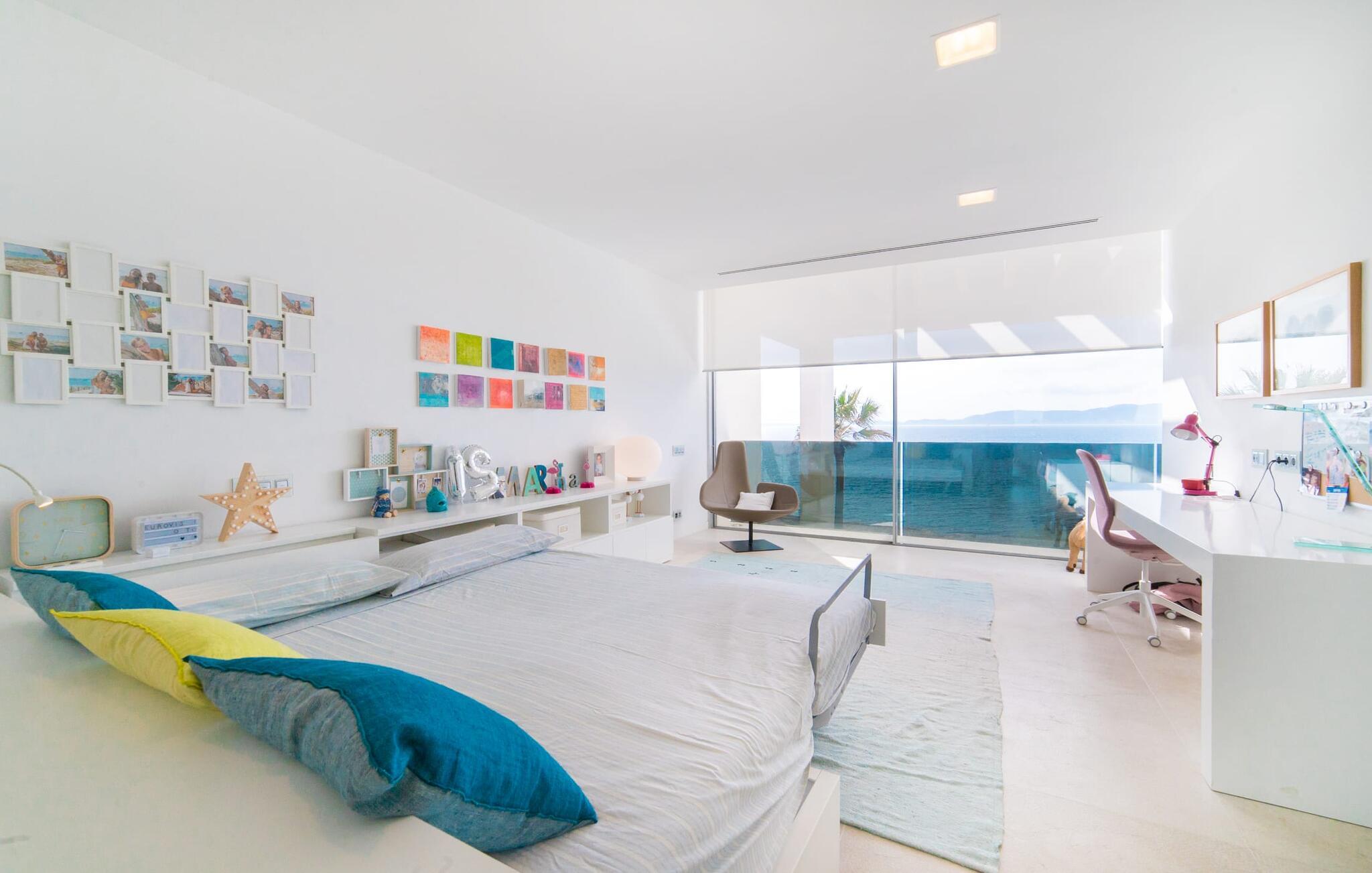 Im lichtdurchfluteten Wohnbereich der 500 m² großen Villa erwartet Sie ein helles, offenes Wohnkonzept: Mit der großen Panorama-Glasfront wurde ein nahezu nahtloser Übergang zur Terrasse geschaffen. Entspannen Sie sich auf gemütlichen Lounge-Sofas und erleben Sie die spektakulären Sonnenuntergänge über dem westlichen Mittelmeer. Selbstverständlich ist das gesamte Haus voll klimatisiert, sodass Sie auch bei heißen Temperaturen nicht ins Schwitzen kommen. Ein großer Esstisch aus Holz bildet den Übergang zur hochmodernen, voll ausgestatteten Küche mit praktischer Kochinsel. Im Erdgeschoss Ihres Ferienhauses befindet sich außerdem ein Gäste-WC. Im Obergeschoss befinden sich drei einladende Schlafzimmer mit luxuriös ausgestatteten En-Suite-Badezimmern. Eines der Zimmer verfügt über einen begehbaren Kleiderschrank. Von den Zimmern auf dieser Etage genießen Sie einen tollen Blick auf das offene Meer und den weiten Horizont. Ein weiterer Wohn- und Schlafbereich mit eigenem Bad sowie ein Spielzimmer für die kleinen Gäste befinden sich im Untergeschoss des Hauses. In der privaten Tiefgarage können Sie Ihre Autos sicher und sonnengeschützt abstellen.