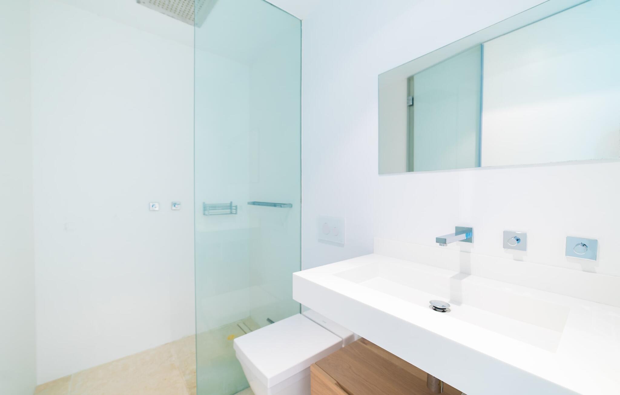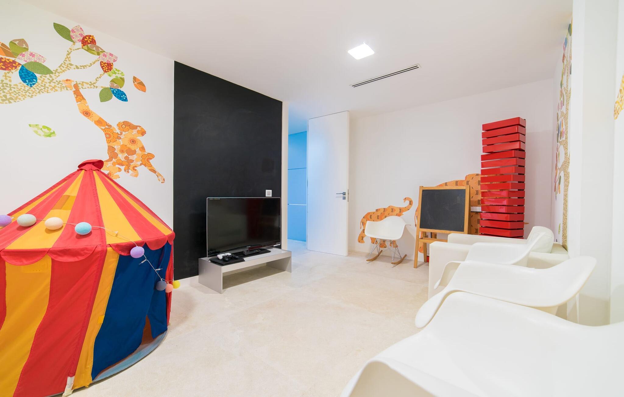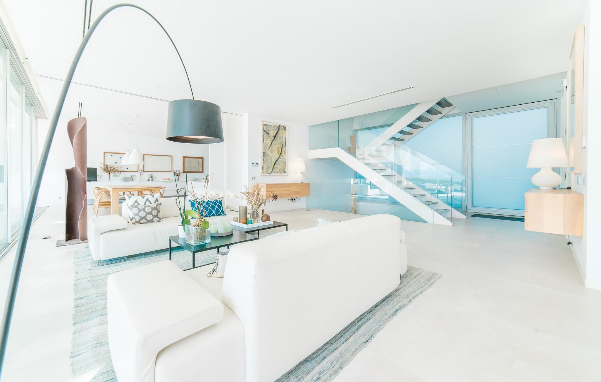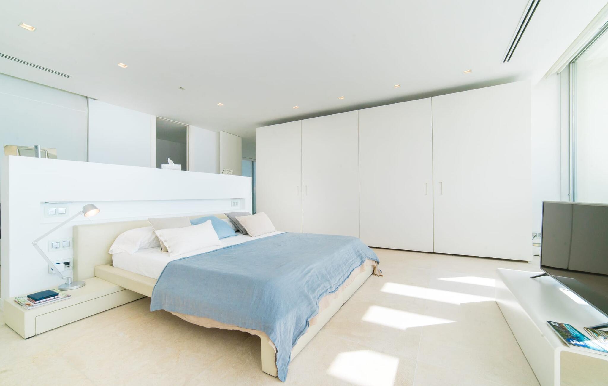 Im lichtdurchfluteten Wohnbereich der 500 m² großen Villa erwartet Sie ein helles, offenes Wohnkonzept: Mit der großen Panorama-Glasfront wurde ein nahezu nahtloser Übergang zur Terrasse geschaffen. Entspannen Sie sich auf gemütlichen Lounge-Sofas und erleben Sie die spektakulären Sonnenuntergänge über dem westlichen Mittelmeer. Selbstverständlich ist das gesamte Haus voll klimatisiert, sodass Sie auch bei heißen Temperaturen nicht ins Schwitzen kommen. Ein großer Esstisch aus Holz bildet den Übergang zur hochmodernen, voll ausgestatteten Küche mit praktischer Kochinsel. Im Erdgeschoss Ihres Ferienhauses befindet sich außerdem ein Gäste-WC. Im Obergeschoss befinden sich drei einladende Schlafzimmer mit luxuriös ausgestatteten En-Suite-Badezimmern. Eines der Zimmer verfügt über einen begehbaren Kleiderschrank. Von den Zimmern auf dieser Etage genießen Sie einen tollen Blick auf das offene Meer und den weiten Horizont. Ein weiterer Wohn- und Schlafbereich mit eigenem Bad sowie ein Spielzimmer für die kleinen Gäste befinden sich im Untergeschoss des Hauses. In der privaten Tiefgarage können Sie Ihre Autos sicher und sonnengeschützt abstellen.
